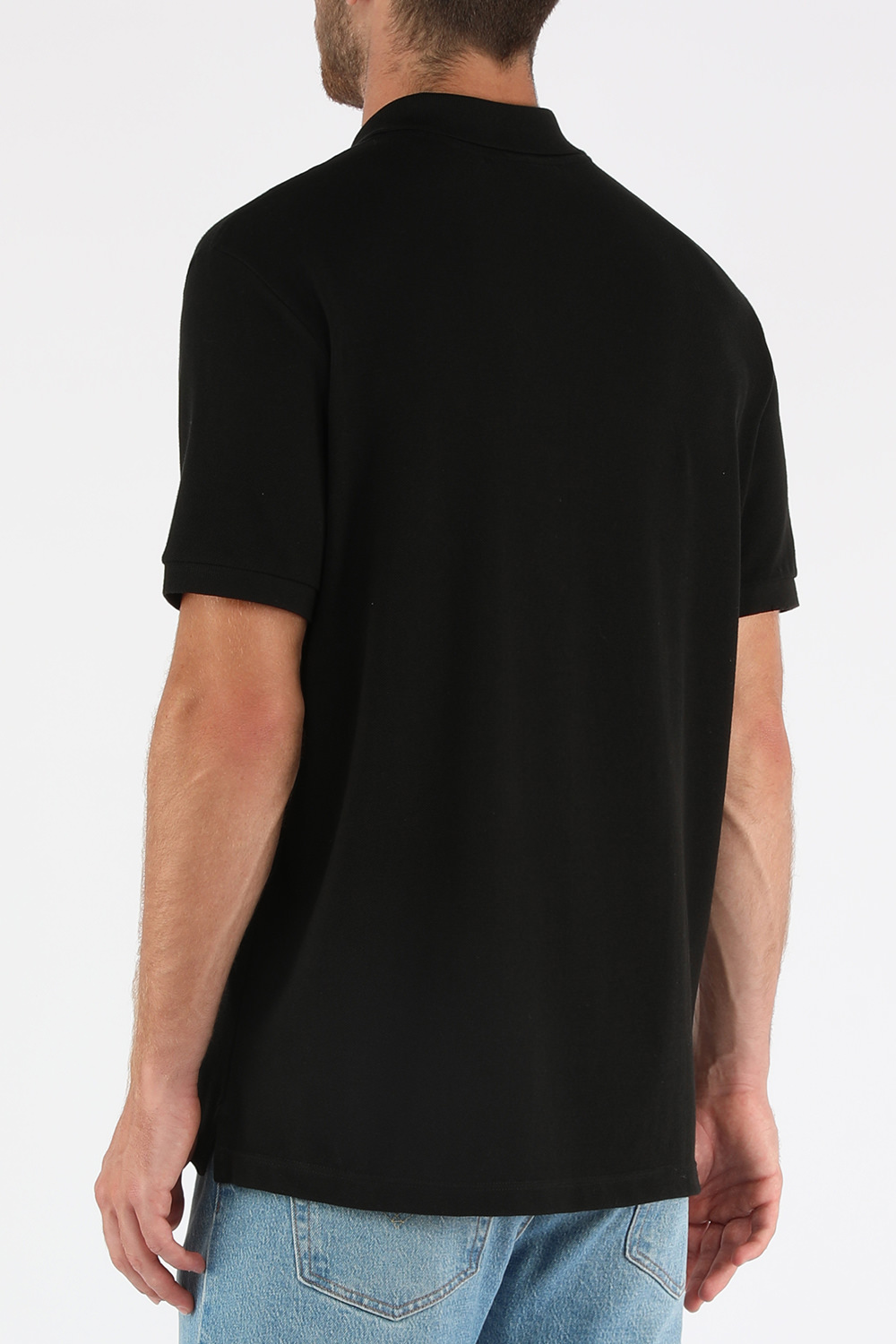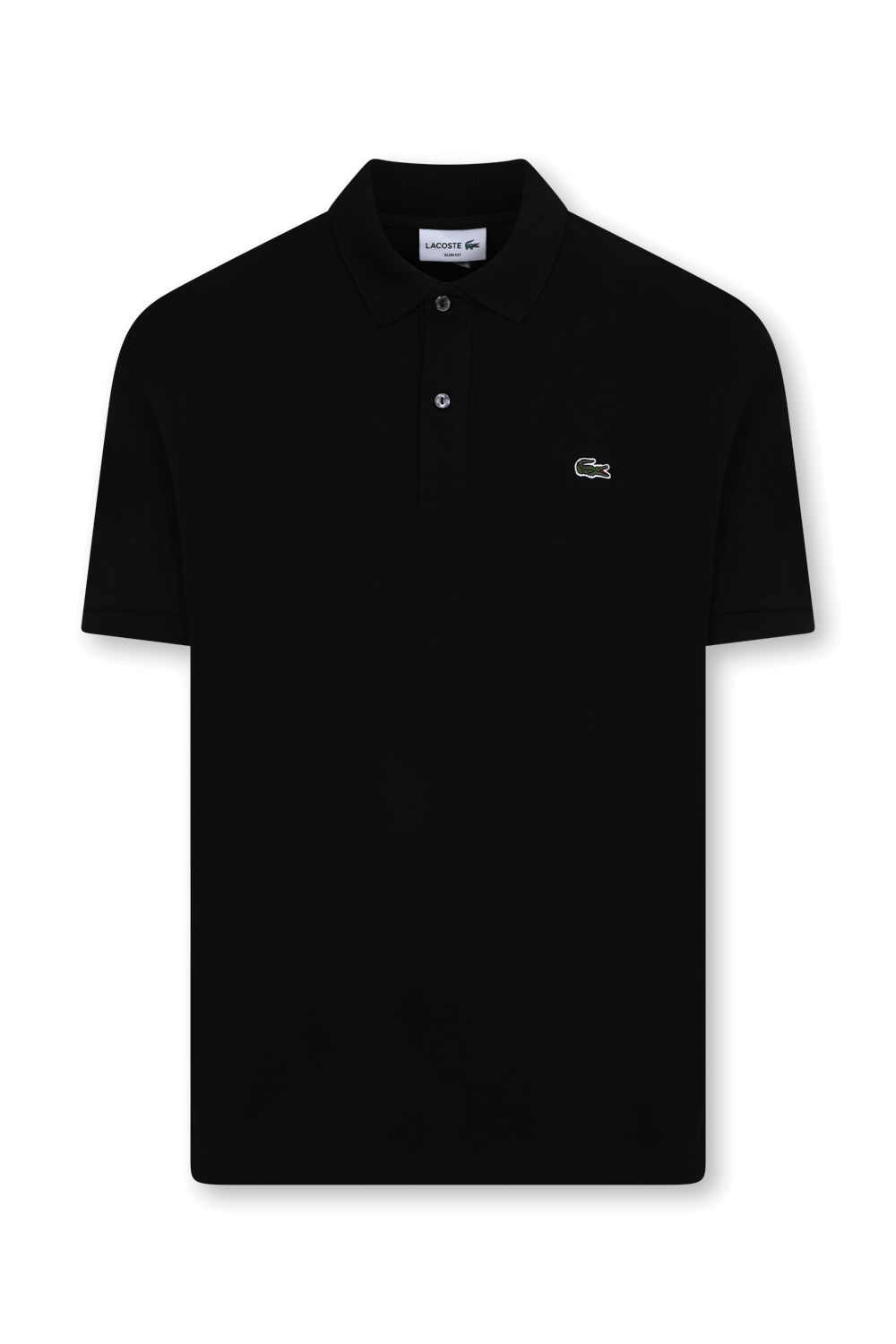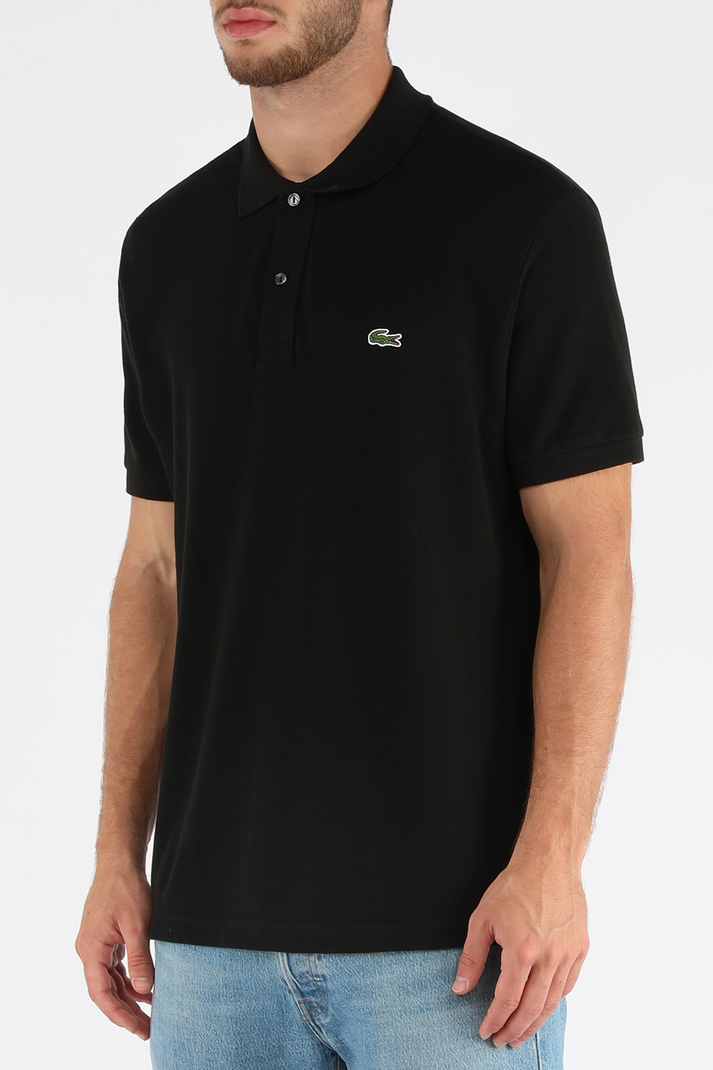 חולצת פולו בעיצוב בית האופנה הצרפתי Lacoste, עשויה כותנה בצבע שחור. לחולצה גזרה קלאסית בעלת צווארון פולו עם שני כפתורי רכיסה ושרוולים קצרים. סמל התנין רקום בחוט ירוק בצדי החזה.