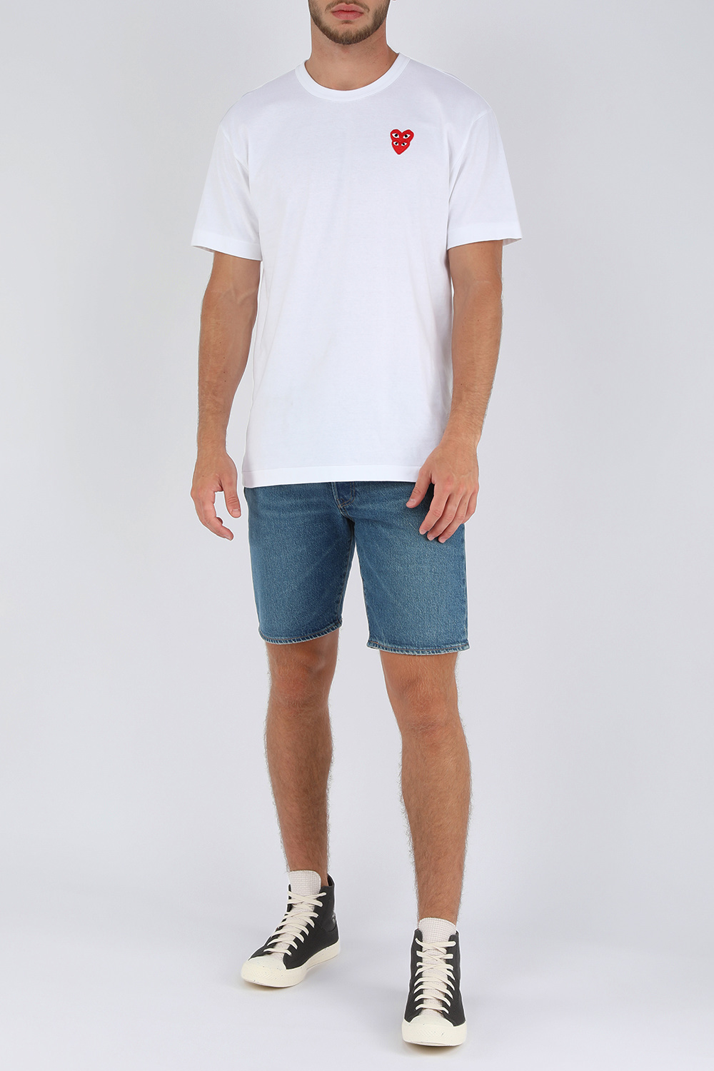 חולצת טי של הקו Play מבית Comme de Garcon, עשויה 100% כותנה עם צווארון עגול ובעיצוב סמל כפול של הלב המוכר בצבע אדום.