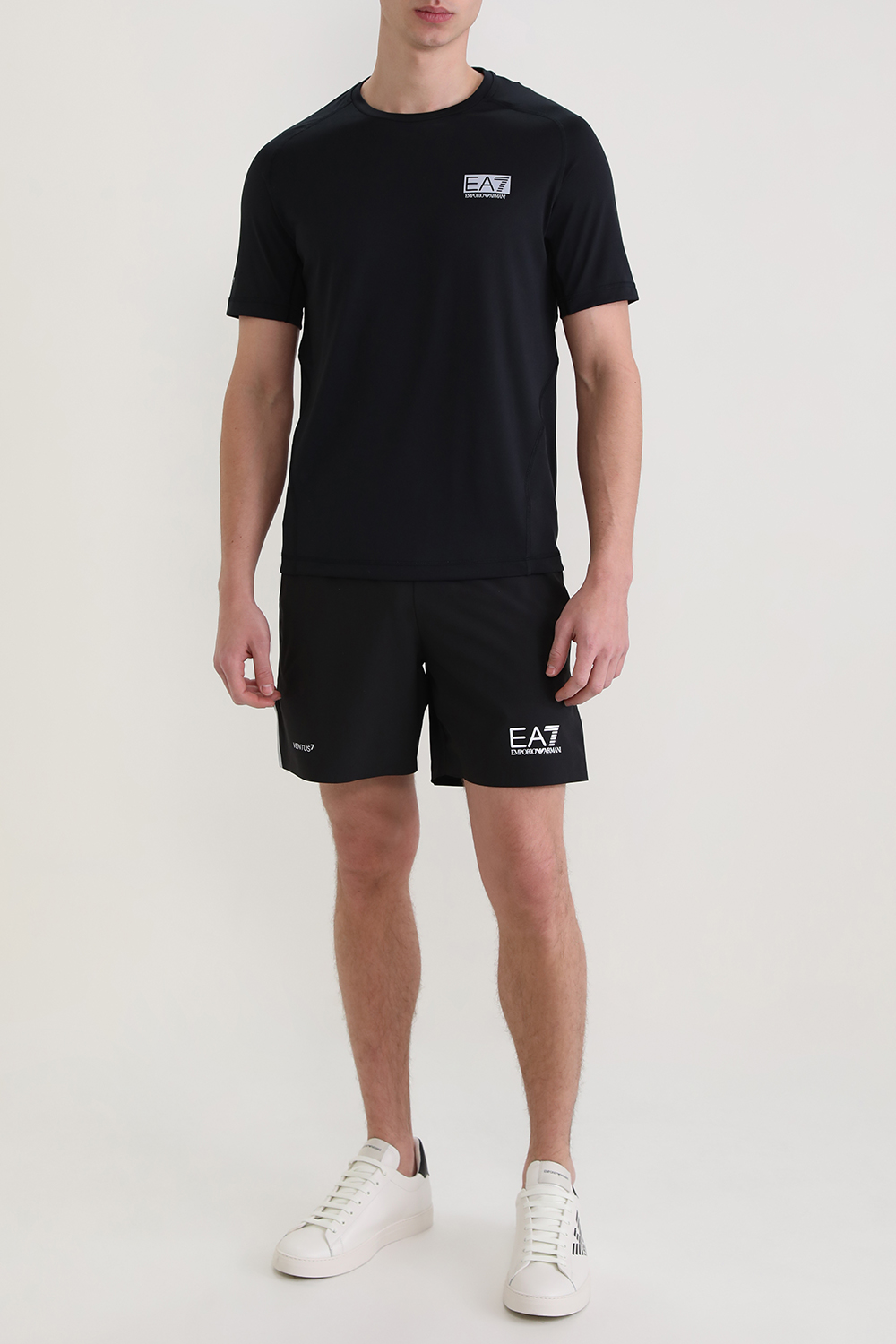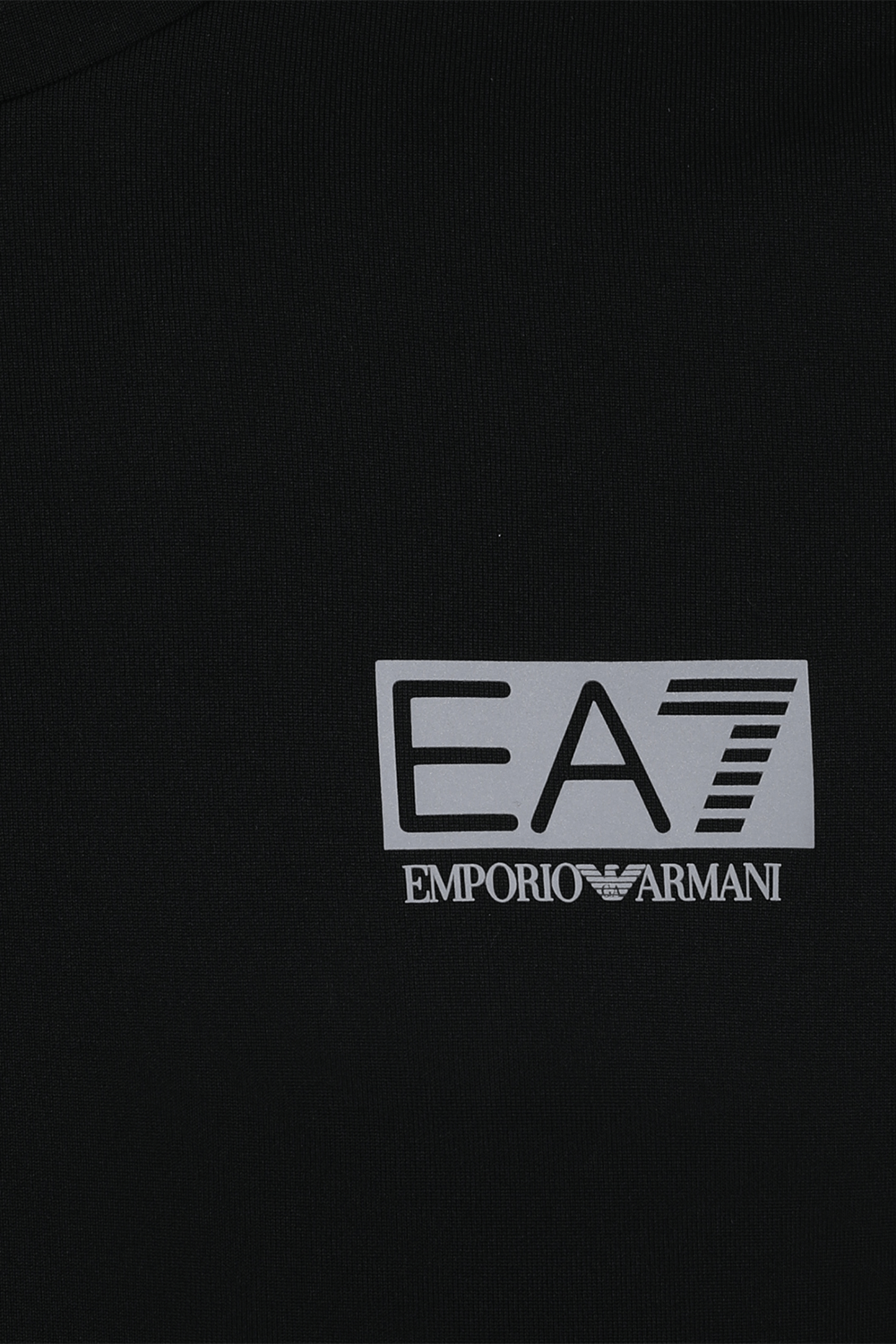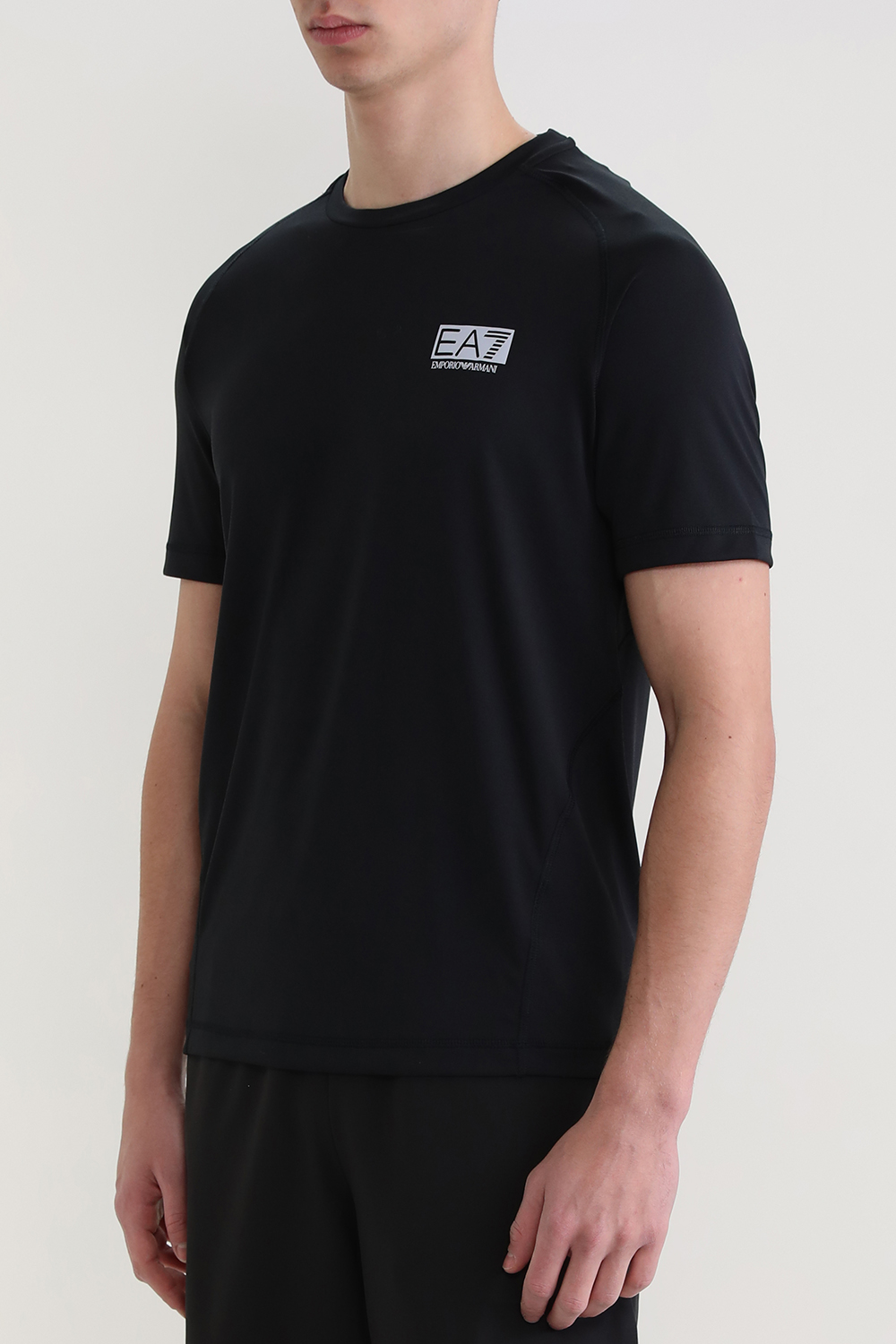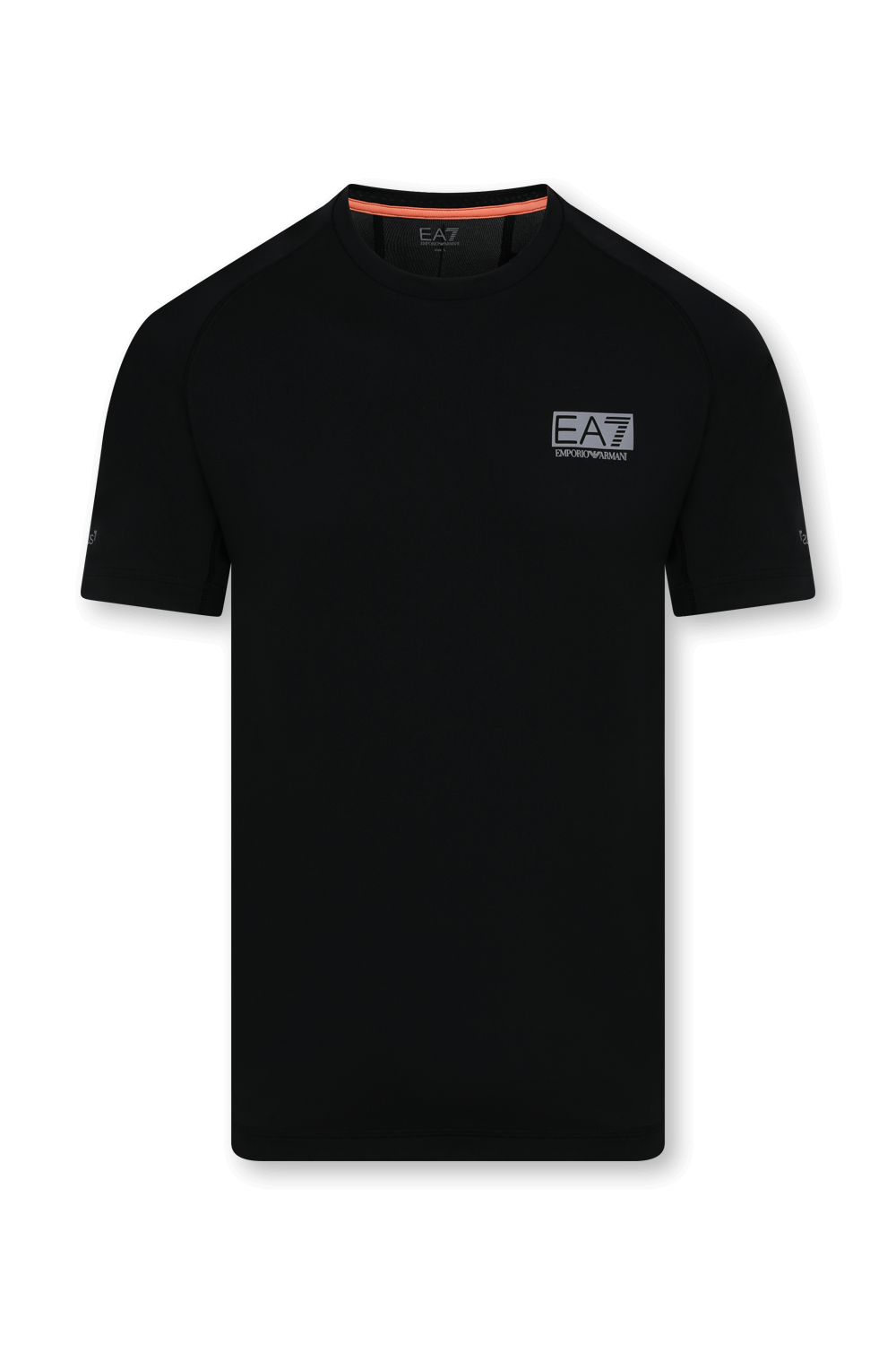 חולצת טי מבית Emporio Armani העשויה פוליאסטר חזק ואיכותי בגוון שחור, כאשר על צד החזית מופיע שם המותג. לפריט גזרת סלים מחמיאה עם שרוולים קצרים וצווארון מעוגל.