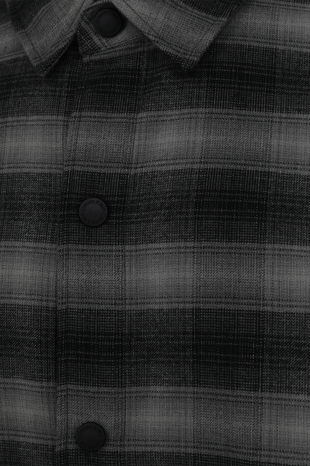 "חולצת משבצות מכופתרת בעיצוב Calvin Kelin, העשויה כותנת פליז בעיצוב משבצות שחור ואפור. לחולצה שרוולים ארוכים מכופתרים, צווארון משולשים ורכיסת כפתורים שחורים בחזית."
