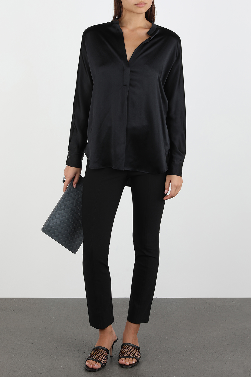 טופ שחחור וסופר שיקי מבית הלייבל VINCE אשר נודע בזכות עיצוב בייסיקים מדויקים המהווים פריטי מפתח במלתחה הנשית. זהו דגם העשוי מ-100% משי משובח ומבריק לכדי צללית נינוחה ופלואידית שתעניק לך ברגע לוק נונשלנטי ונחשק- מהסוג שכל אחת פשוט חייבת בארון. לטופ מחשוף V שטוח ומחמיא כמו גם שרוולים מחופתים עם כפתור ייחודי- המשדרגים את סגנונו בטאץ' מוקפד ויוקרתי. שלבי אותו עם חצאית המידי מתוך אותה הקולקציה לצד זוג סנדלים שטוחים להשגת נשיות נינוחה ואלגנטית.