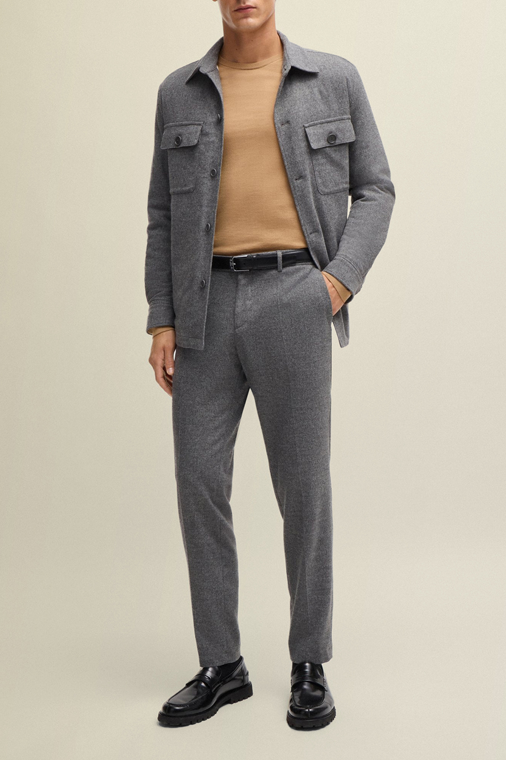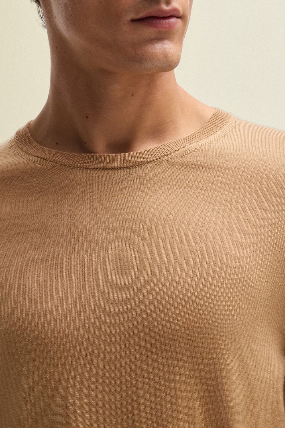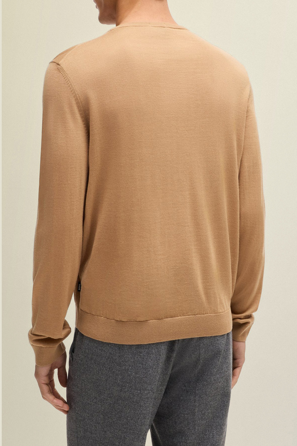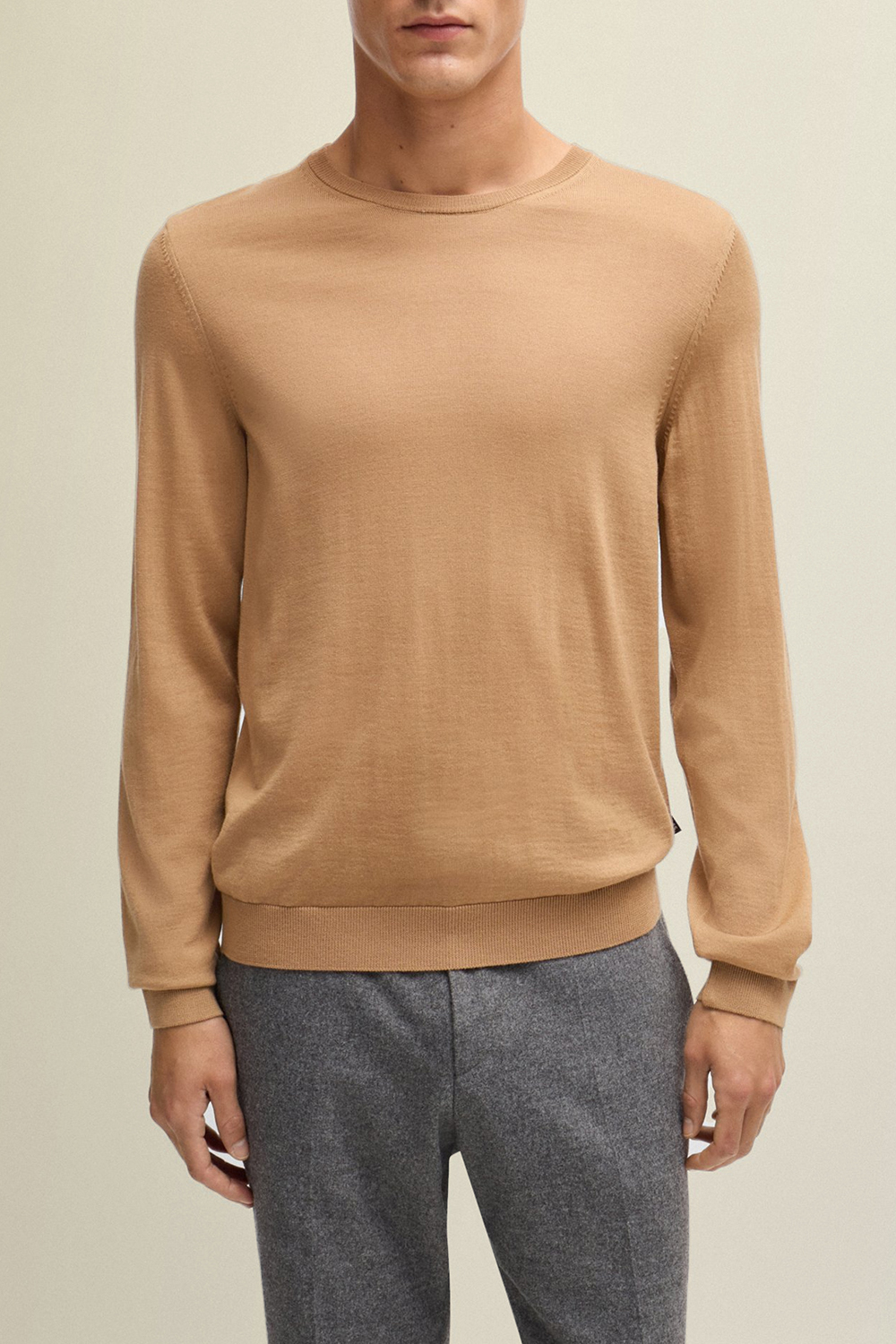 חולצת סריג עדינה בגזרת סלים מבית Boss, עשויה צמר רך ונושם בצבע בז', המגודל בתנאים מפוקחים ועומד בסטנדרט חמש החירויות של רווחת בעלי החיים.