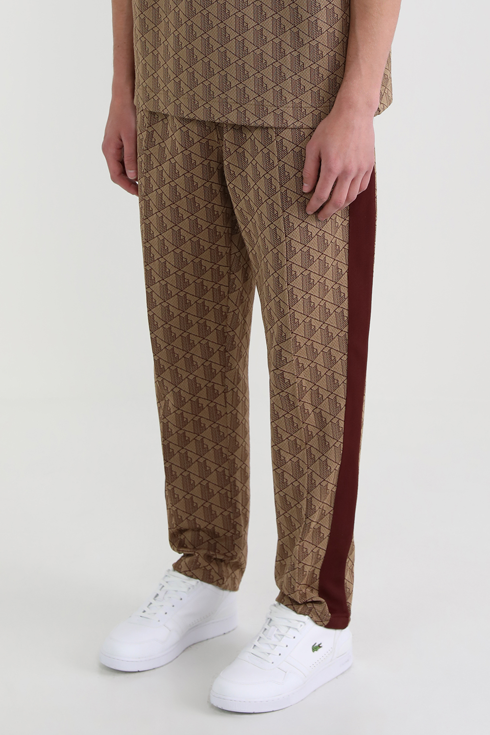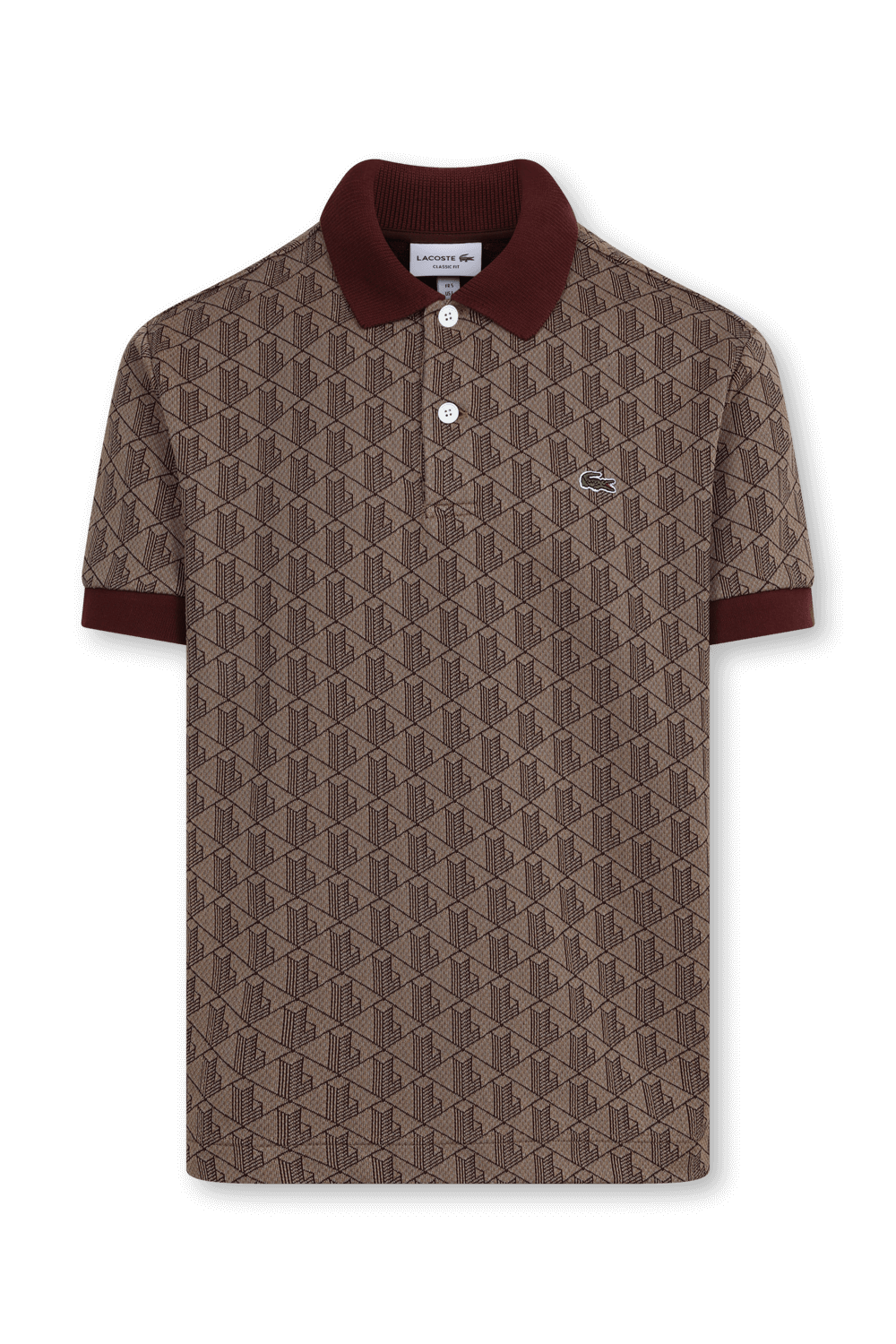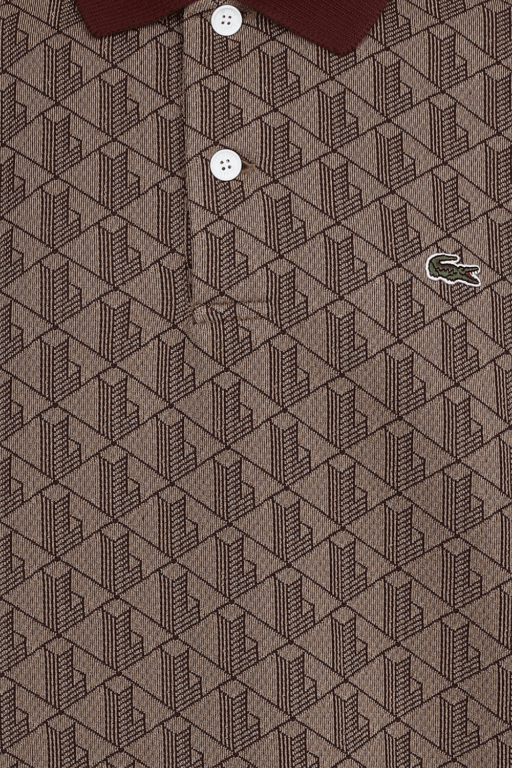חולצת פולו של בית האופנה הצרפתי Lacoste עשויה מתערובת כותנה נעימה בצבע חום בעיצוב טקסטורה מונוגרמית. לפריט צווארון מחודד ואמרות בסריגת ריב בצבע בורדו ובשילוב שני כפתורי רכיסה ולוגו רקום בצד החזית.
