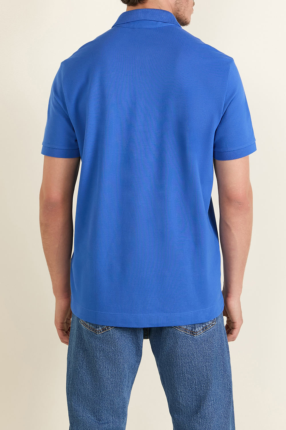 חולצת פולו קצרה מבית Lacoste, עשויה תערובת כותנת פיקה ואלסטן בצבע כחול בשילוב פאץ' לוגו המותג בצד החזה. החולצה האייקונית נתפרה לראשונה בשנת 1933 ומציגה אלגנטיות בניחוח צרפתי.