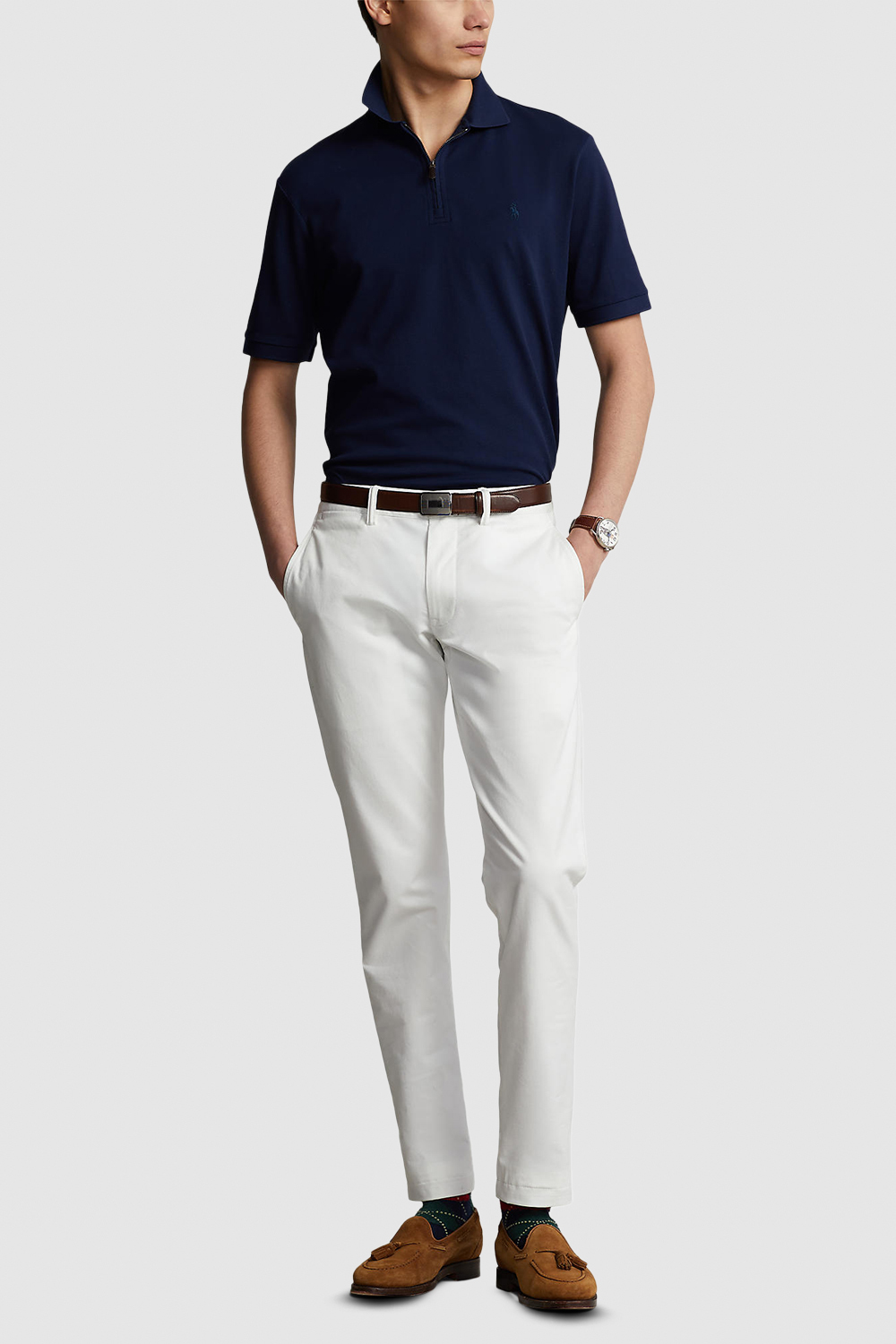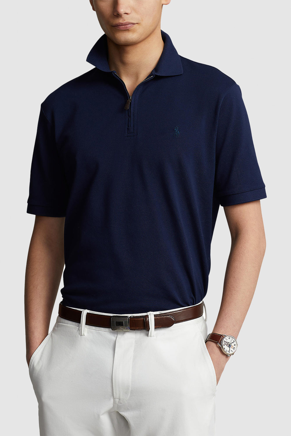 חולצת פולו קצרה בגזרת סלים מבית Polo Ralph Lauren, עשויה תערובת כותנה ואלסטן בצבע כחול ובעיצוב חצי רוכסן בחזית, בשילוב רקמת לוגו המותג בצד החזה.