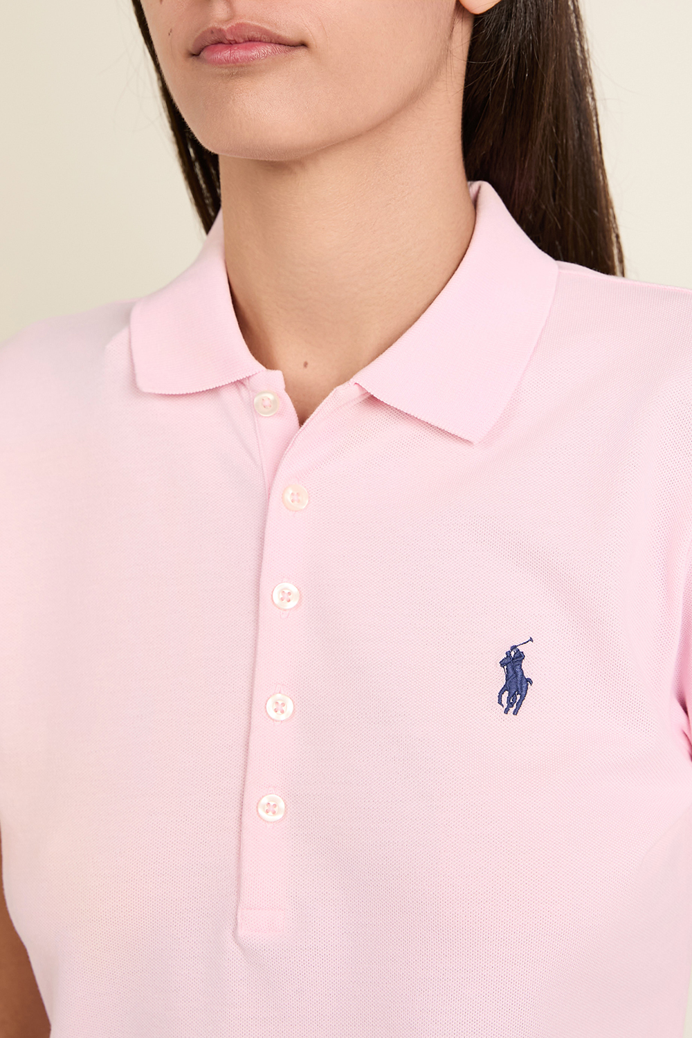 חולצת פולו קצרה מבית Polo Ralph Lauren, עשויה תערובת כותנה ואלסטן בצבע ורוד בהיר בשילוב רקמת לוגו בצד החזה.