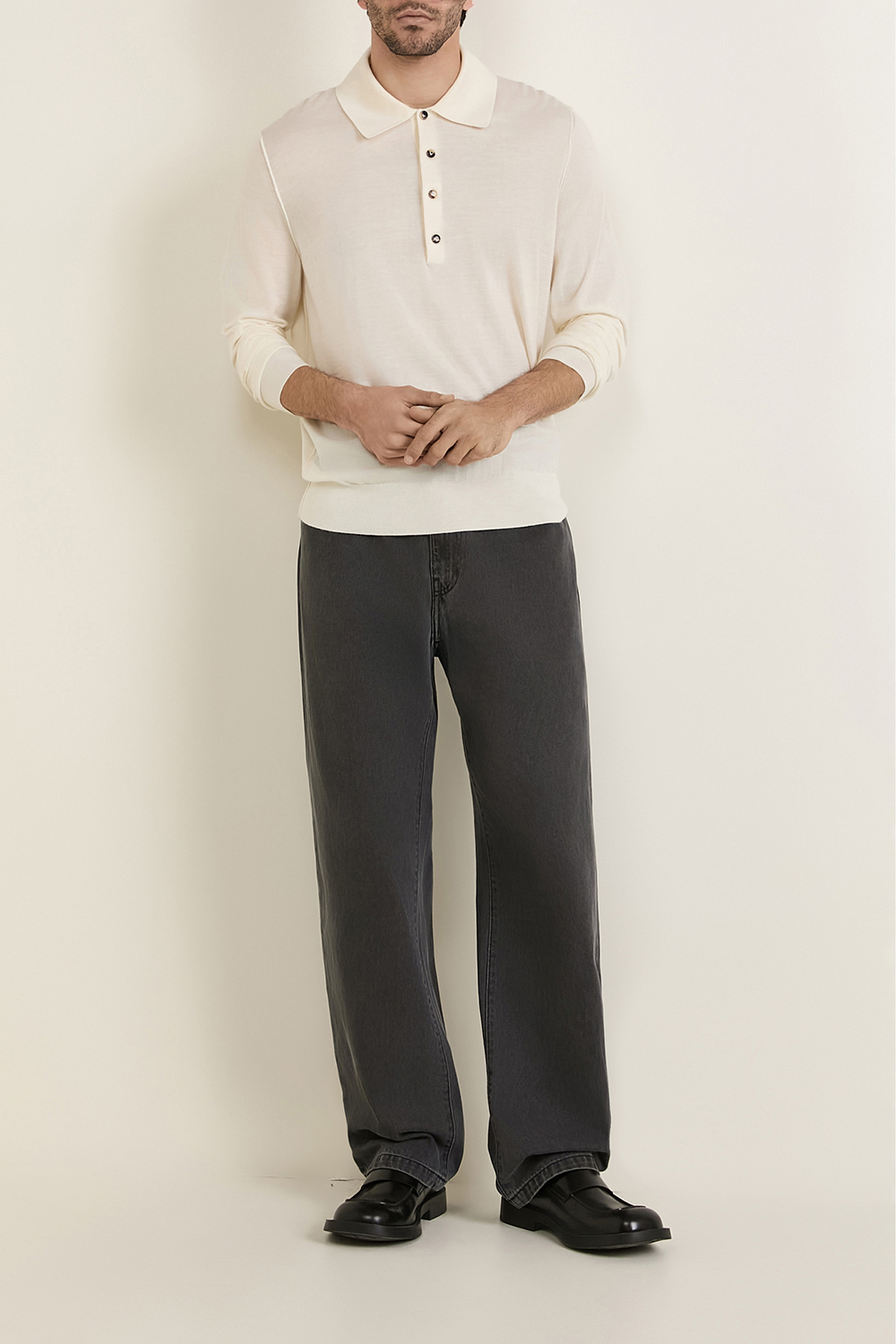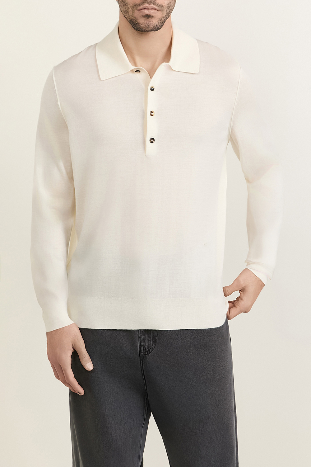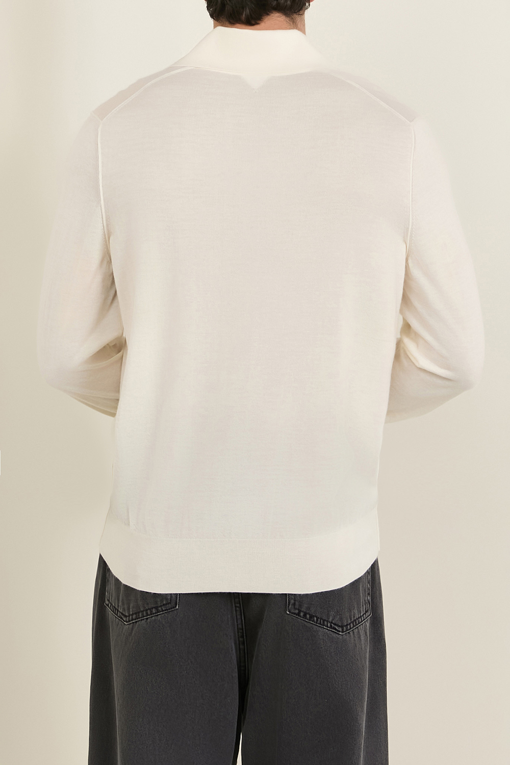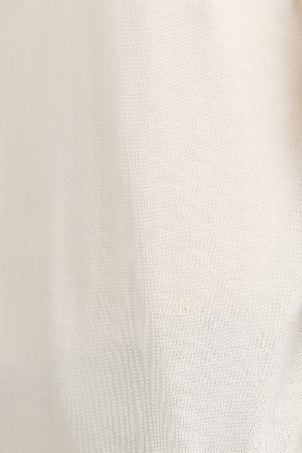 חולצת פולו מבית Bottega Veneta, תוצרת איטליה. עשויה קשמיר נעים בצבע לבן עם צווארון בסגירת כפתורים.