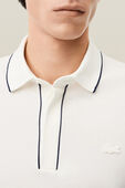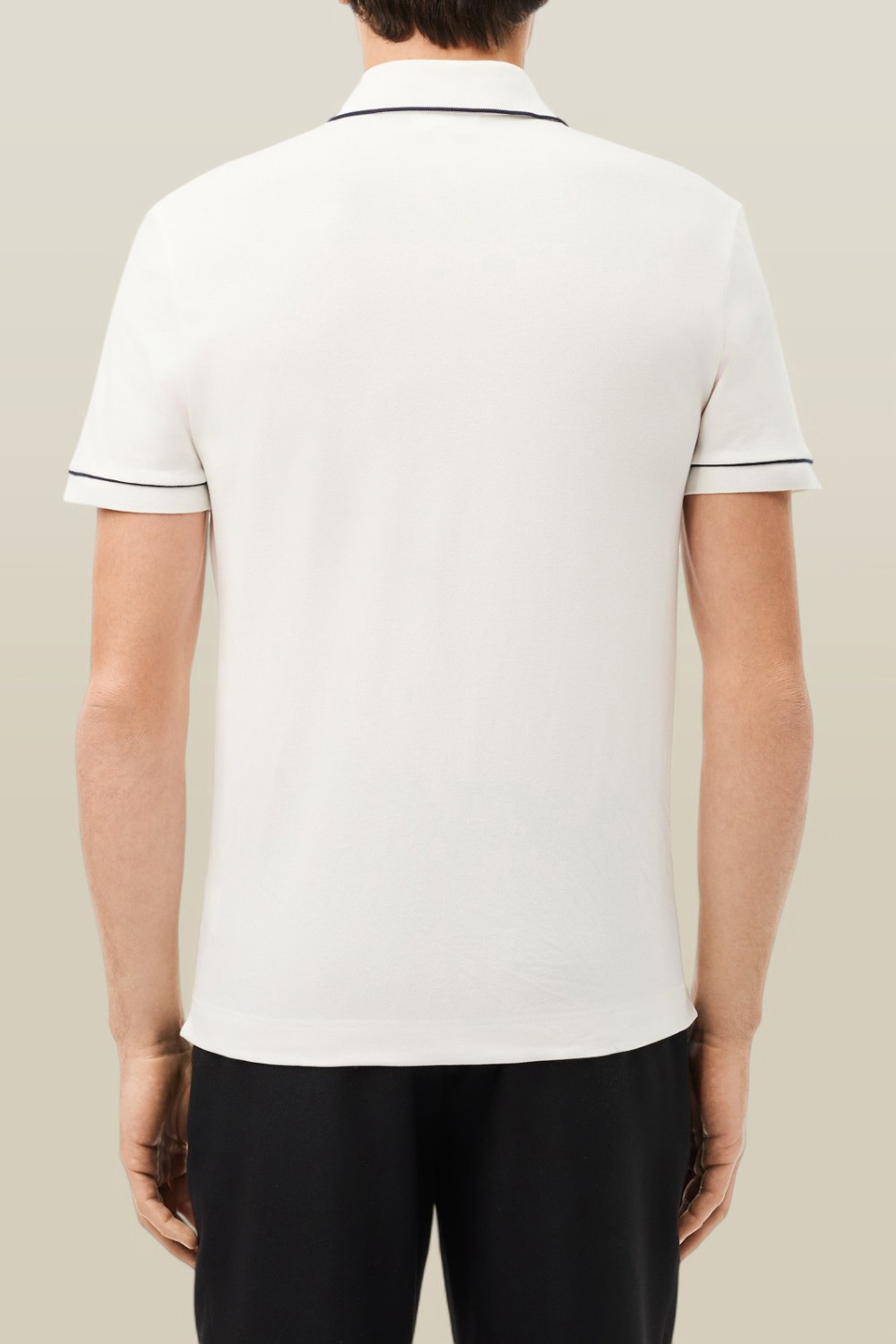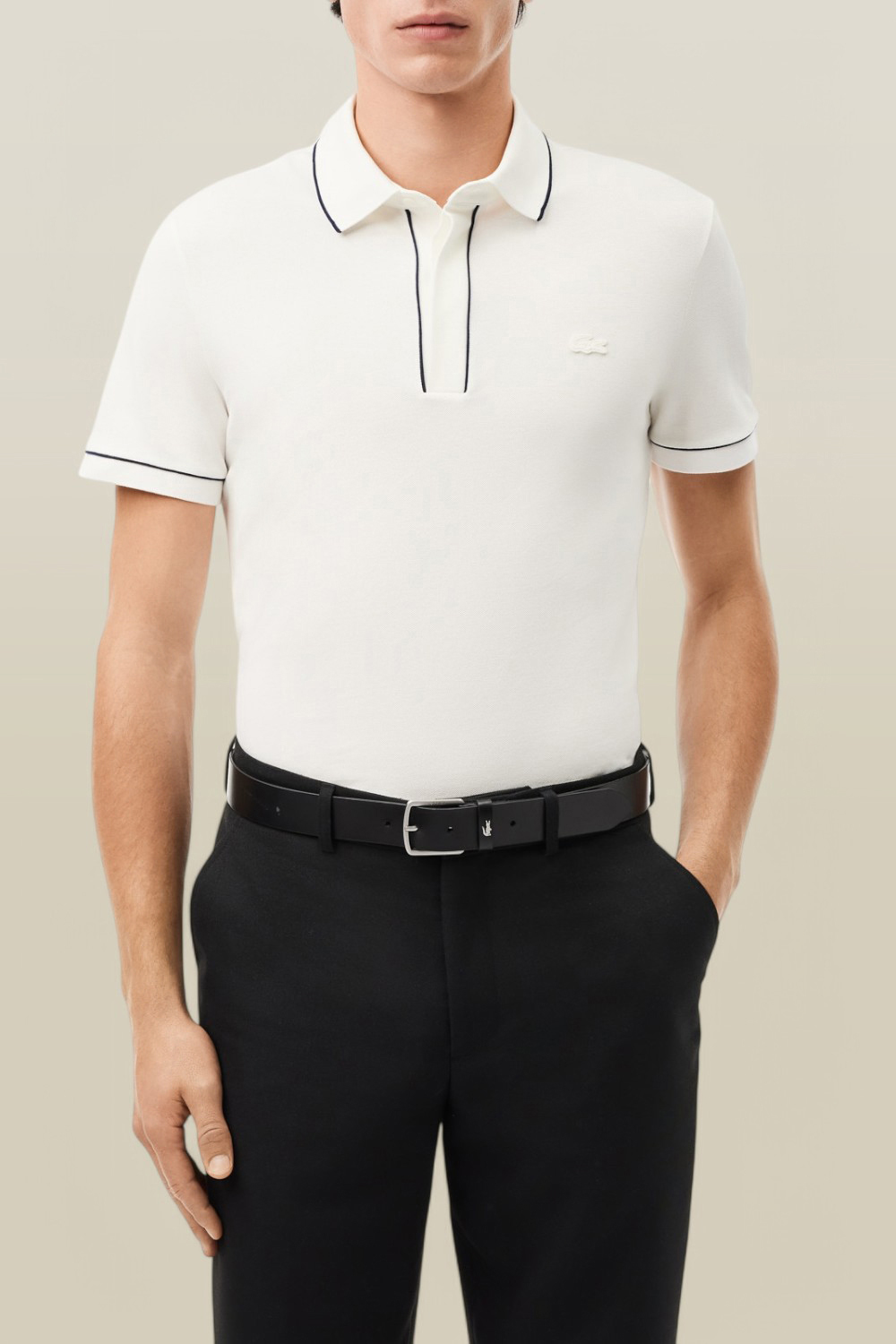 חולצת פולו בגזרה רגילה מבית Lacoste, עשויה כותנת פיקה אורגנית בצבע לבן עם דיטיילים בכחול.