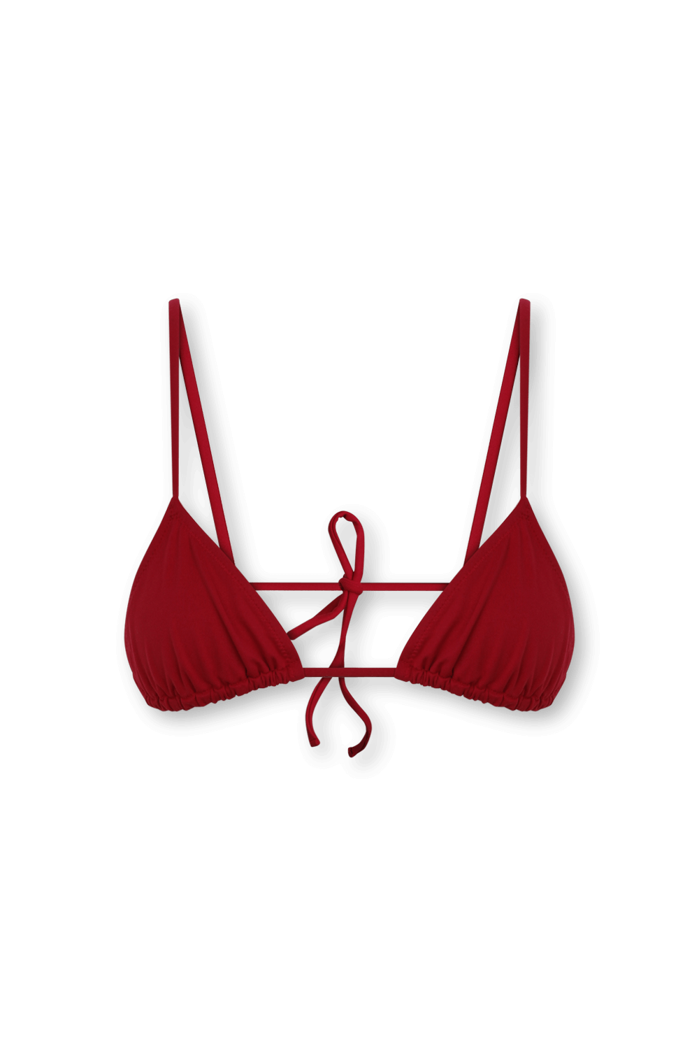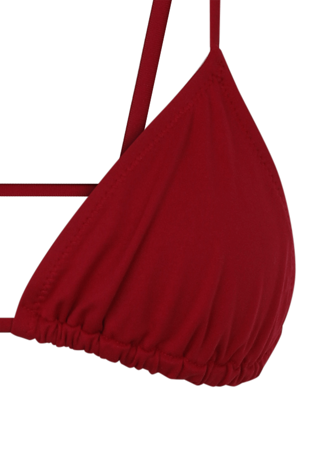 חזיית בגד ים נוטפת סטייל בצבע אדום בגזרת משולשים עם כתפיות דקות וקשירה בגב. הטופ עשוי מניילון עם כיווצים בחזה.