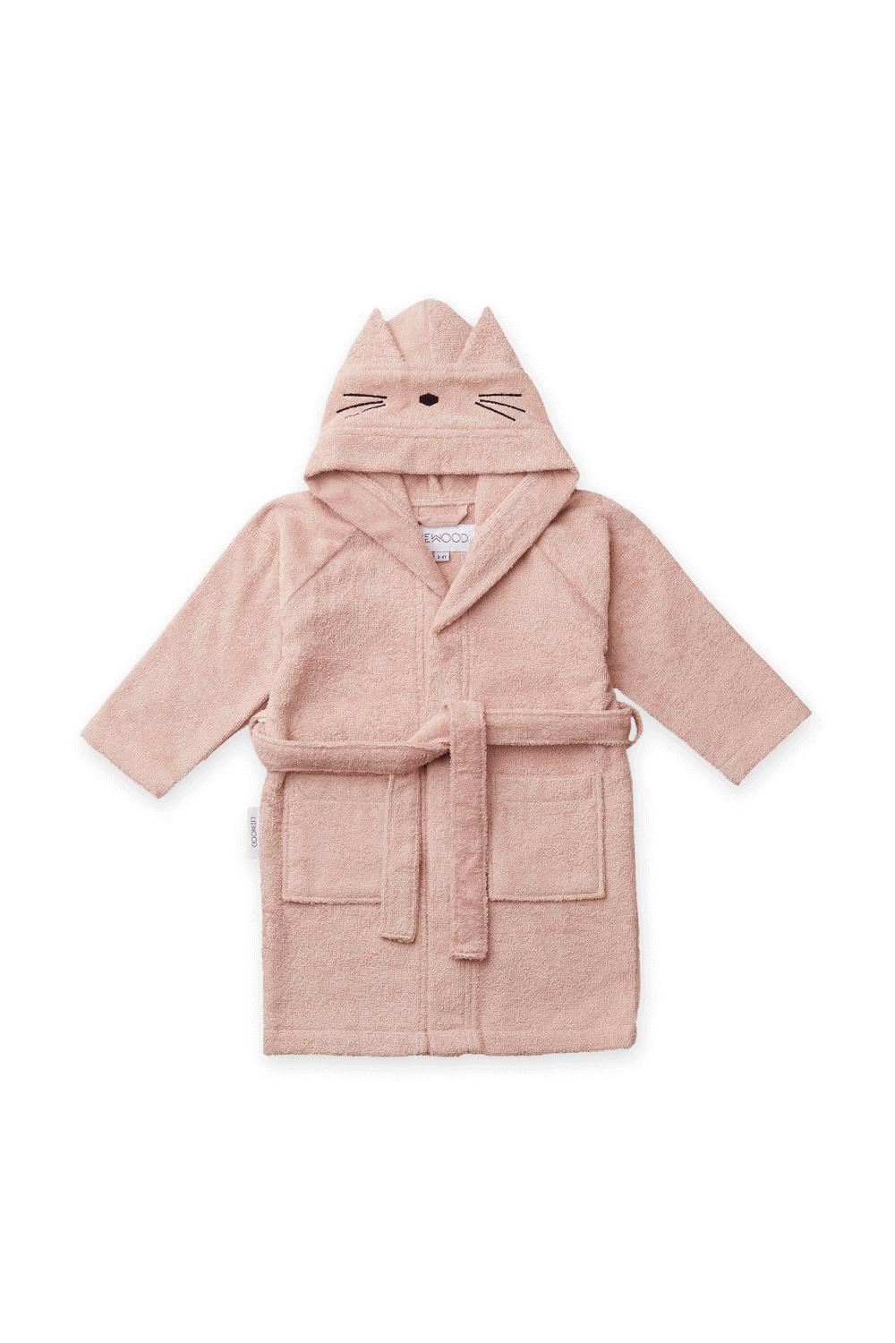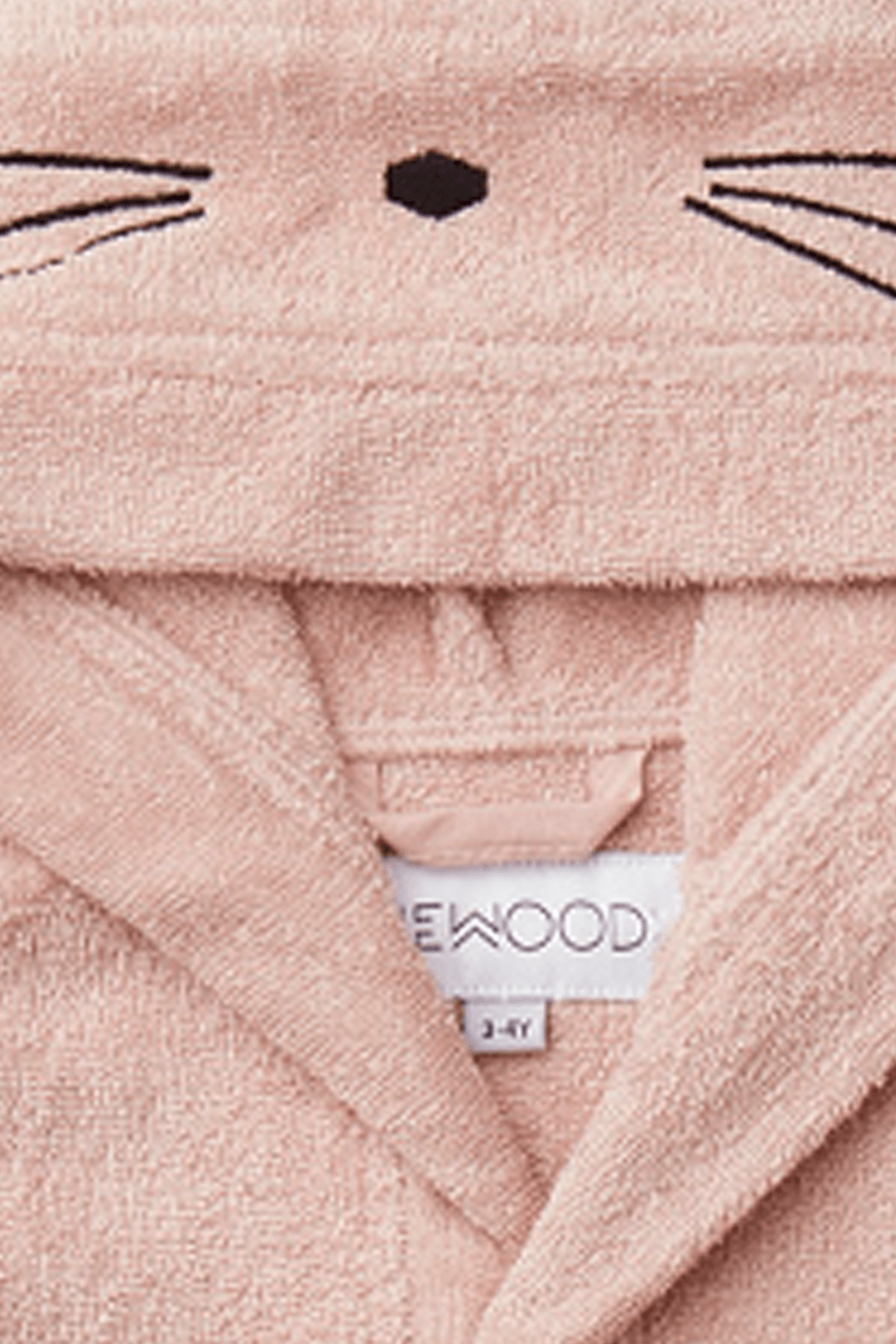 חלוק מגבת לילי ורוד מבית המותג הדני-צרפתי Liewood המציג קולקציית בגדי ילדים וכן היצע רחב של אביזרים, משחקים ופריטי טקסטיל לתינוקות. זהו דגם העשוי 100% כותנה אורגנית נקייה מכימיקלים בטקסטורה רכה ומלטפת והוא בעל יכולת ספיגה גבוהה. צלליתו מציגה רכיסת כפתורי תיק-תיק נסתרים ושרוך קשירה טונאלי, לצד שני כיסים פרונטליים וכובע קטן המעוטר בדמות חתול. מדובר בחלוק משגע המספק עיטוף והגנה מושלמים ביציאה מהאמבטיה.