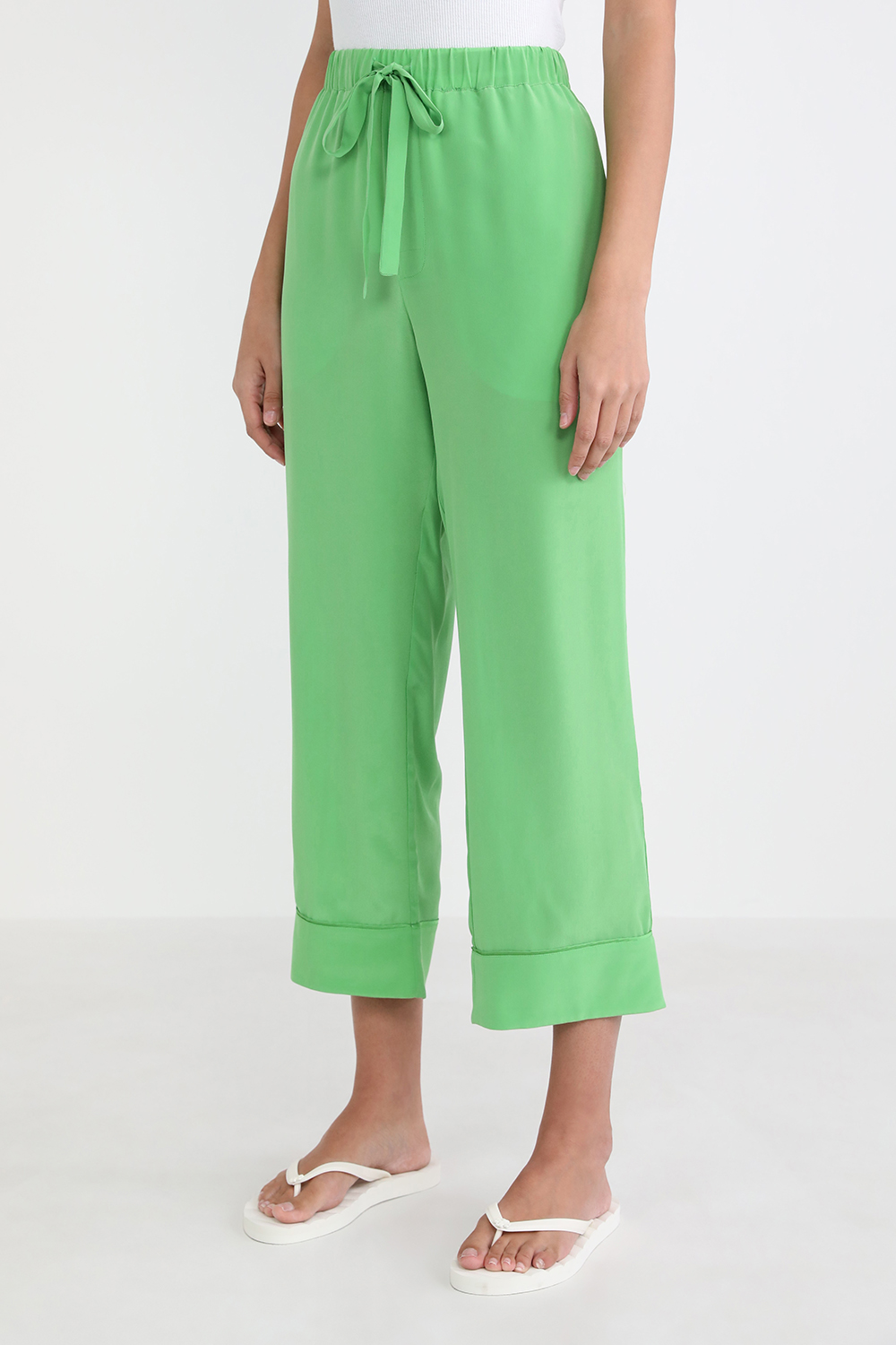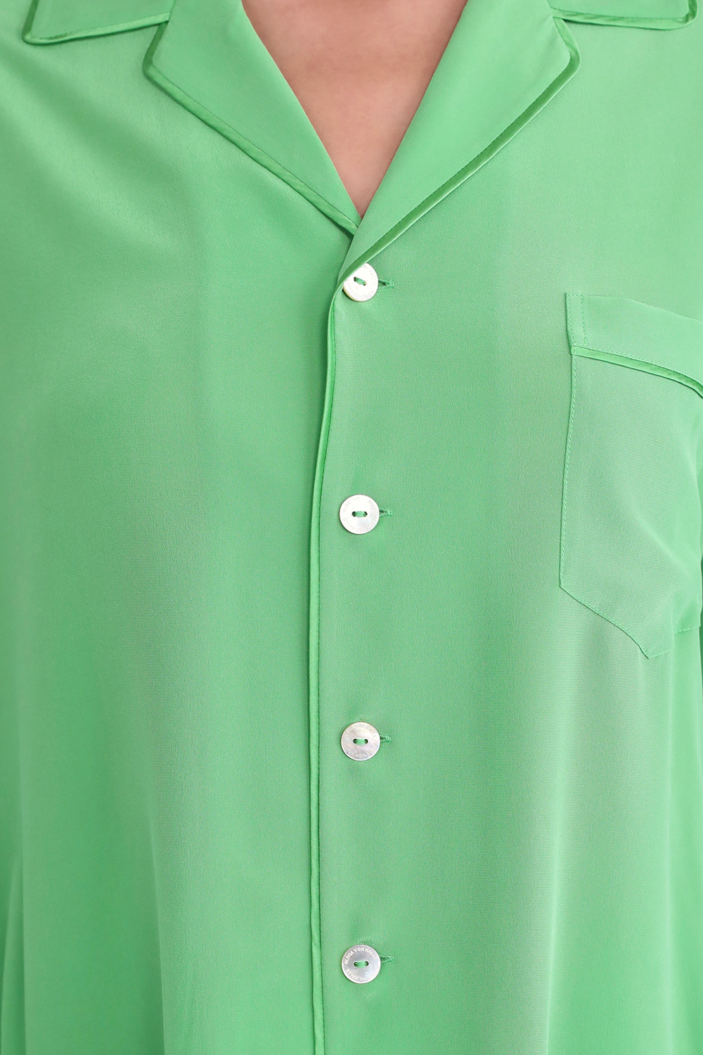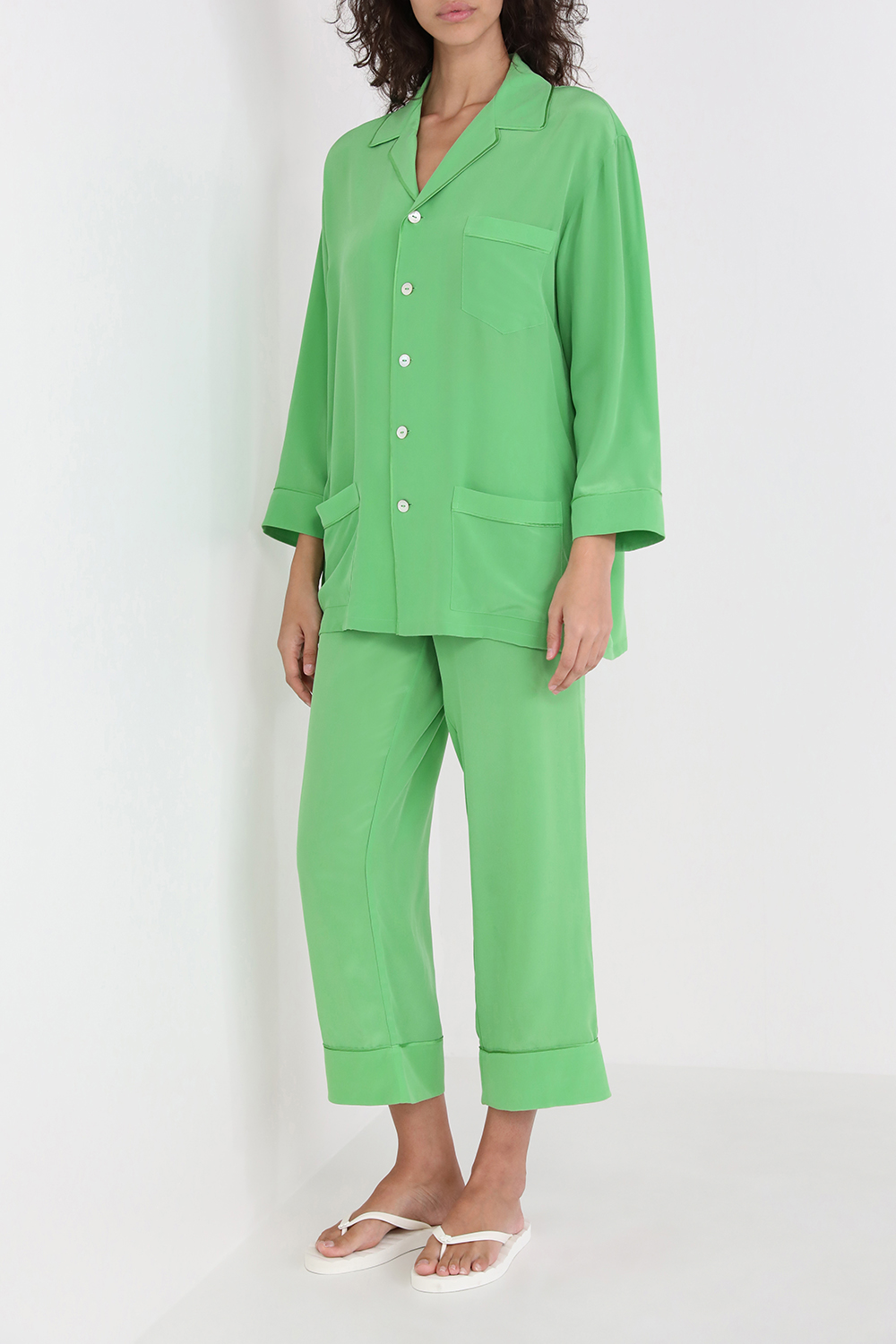 חלוק בדגם Amina מבית Olivia Von Halle, עשוי משי בגימור סאטן בצבע ירוק ומעוצב בסגנון קימונו בשילוב שרוולים רחבים, עם חגורת מותניים ובסיומת פרנזים.