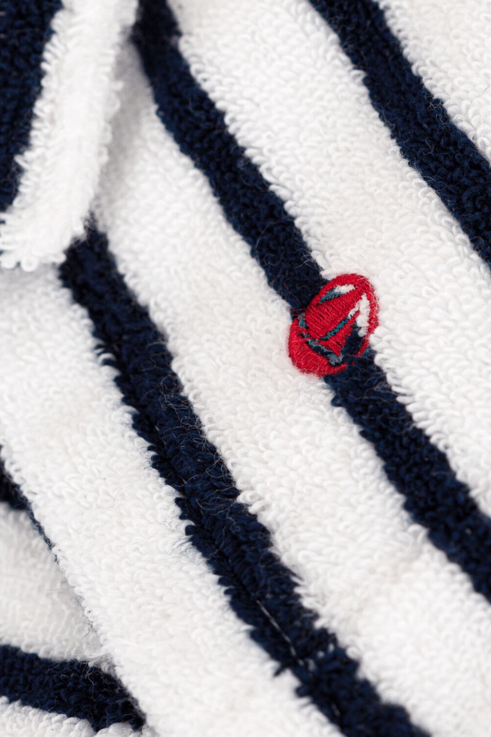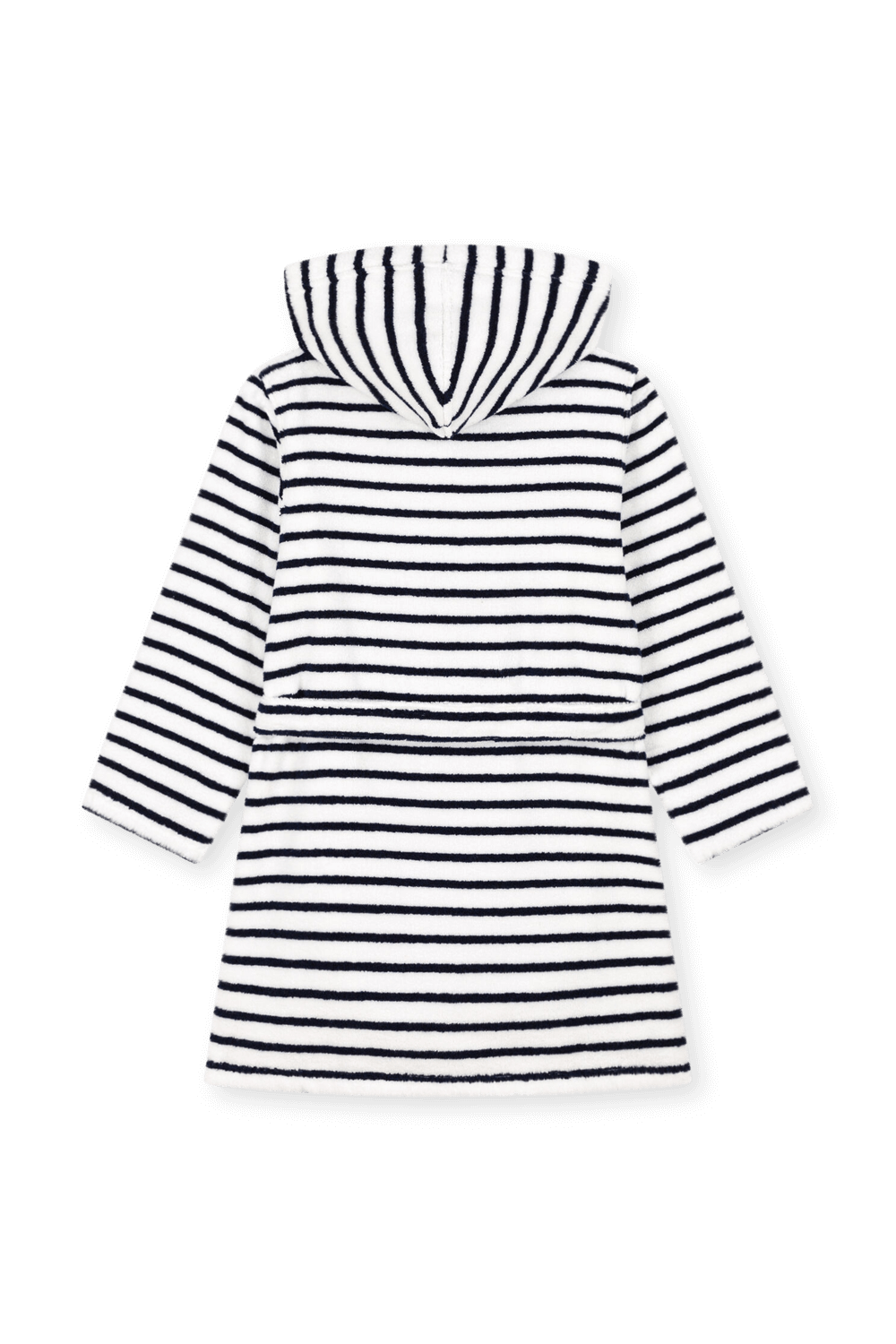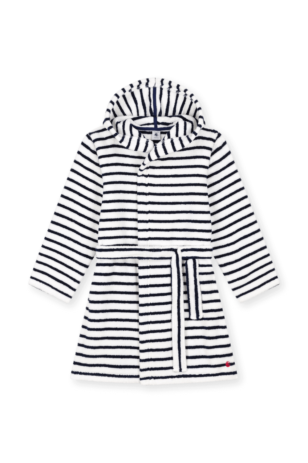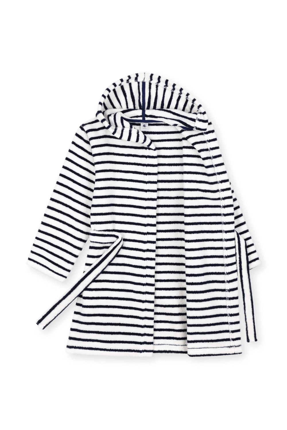 חלוק רחצה מפנק מבית Petit Bateau, עשוי כותנה רכה בצבע לבן ועיצוב פסים כחולים. לחלוק כובע קפוצ'ון לכיסוי הראש הרטוב לאחר המקלחת, בשילוב חגורה לקשירה במותניים.