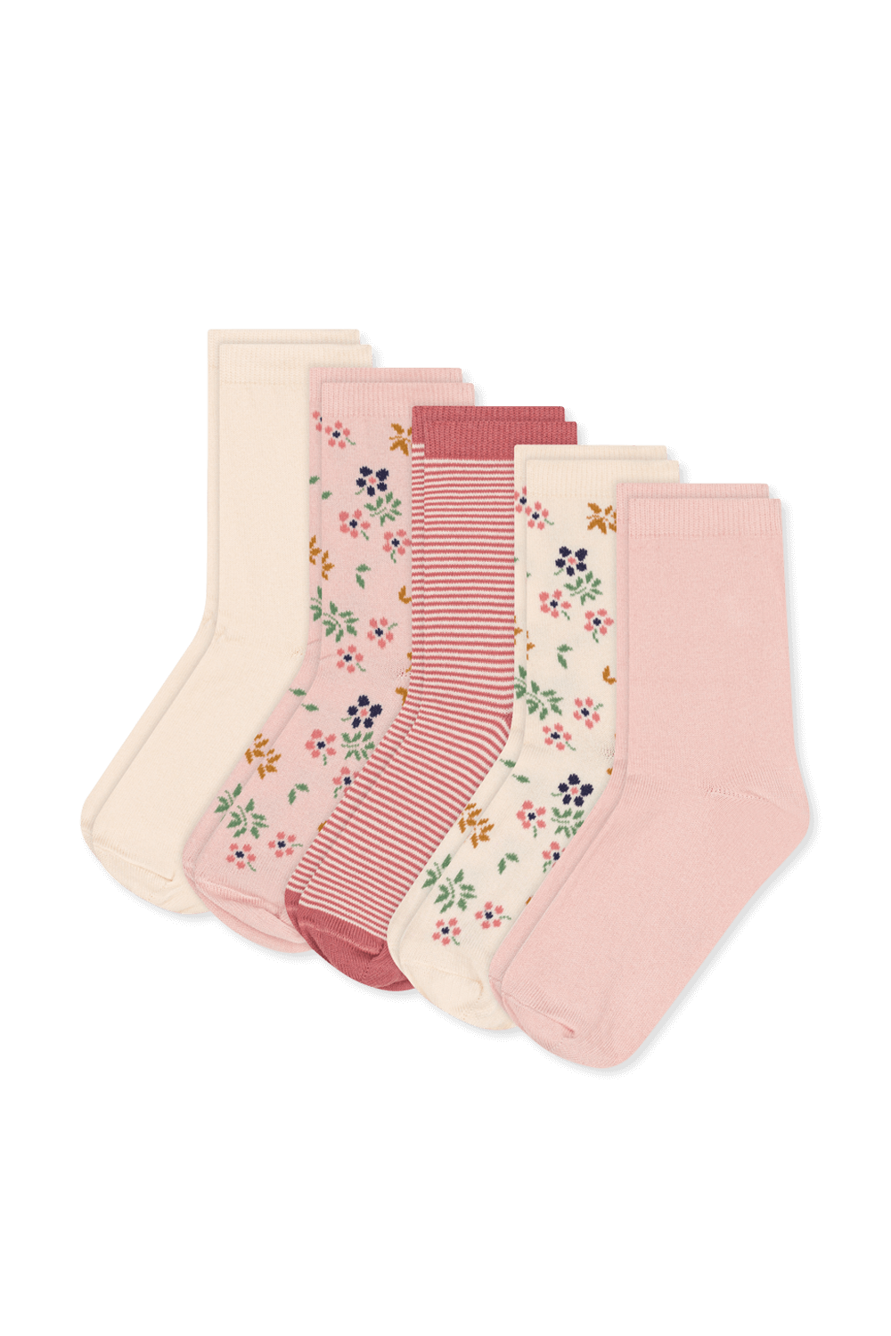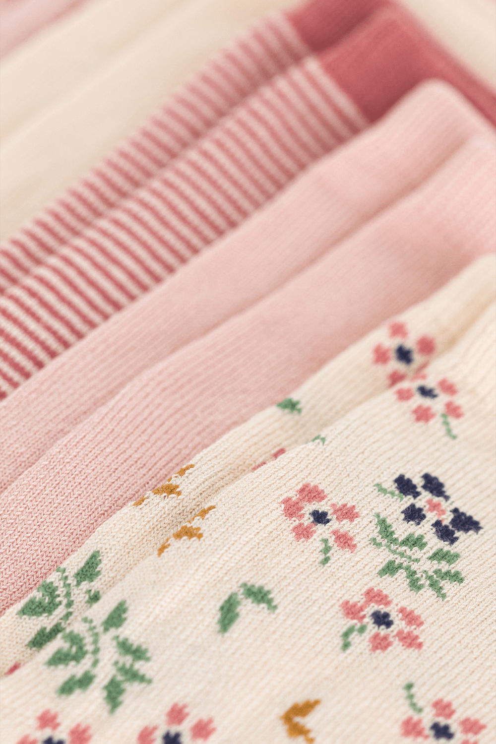 חמישה גרביים מבית המותג הצרפתי Petit Bateau, עשויים תערובת כותנה, פוליאמיד ואלסטן בצבעי ורוד ולבן ובעיצוב פסים ופרחים.