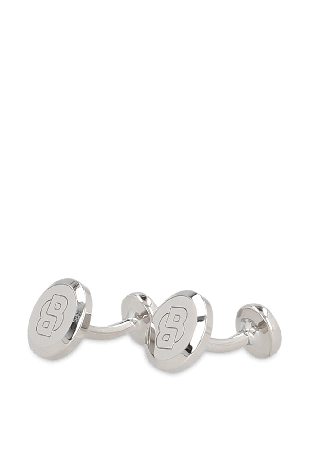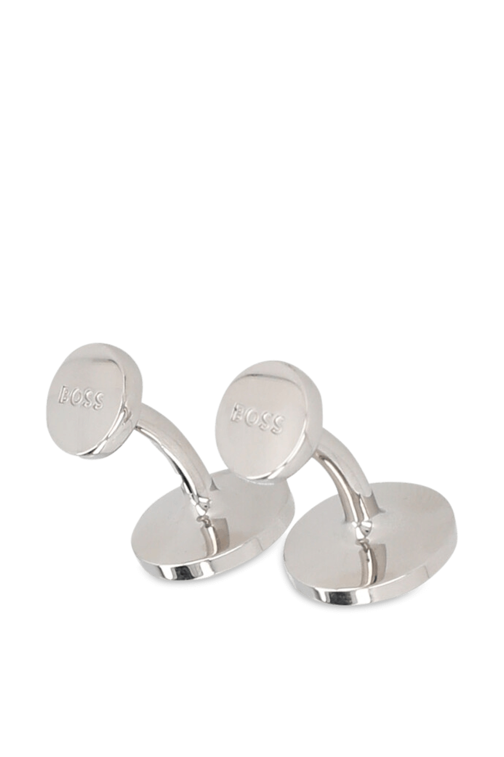 חפתים מעוגלים בעיצוב בית האופנה Hugo Boss, העשויים פליז מלוטש בצבע כסוף עם הטבעת הלוגו. החפתים מגיעים בתוך קופסת מתנה מבית המותג.