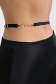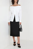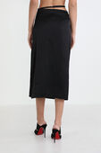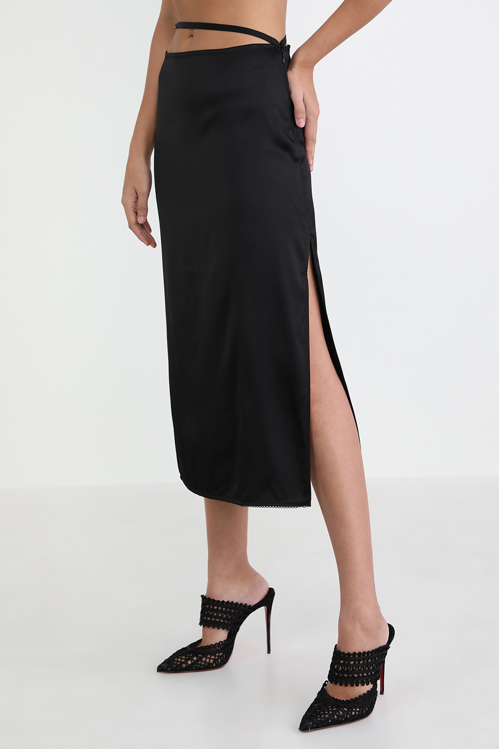 חצאית מידי מבית Jacquemus, עשויה תערובת ויסקוזה ומעט אלסטן בגימור סאטן ובצבע שחור. לחצאית רצועת מותניים עם אלמנט לוגו זהוב, בשילוב שסע וסגירת רוכסן נסתר בצד השמאלי.