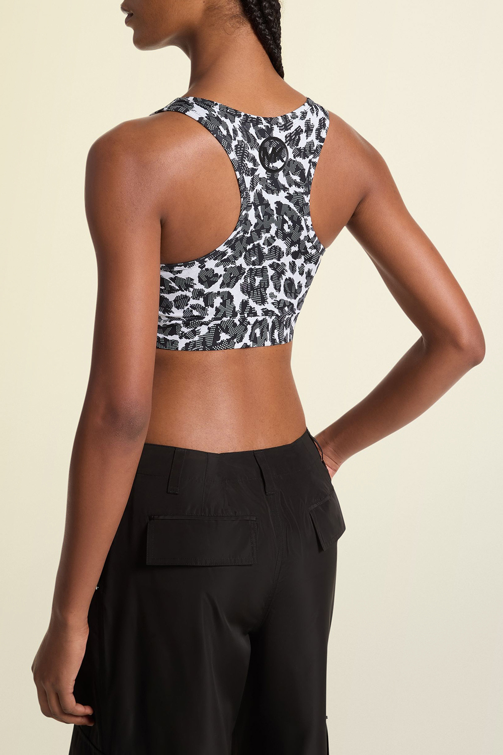 טופ ספורט מבית Michael Kors, עשוי תערובת ניילון ממוחזר ואלסטן בהדפס חברבורות בצבעי לבן, שחור ואפור בשילוב הדפס לוגו המותג. שלבו את הטופ עם טייץ תואם ליצירת לוק ספורטיבי. הטופ ללא קאפים מרופדים.
