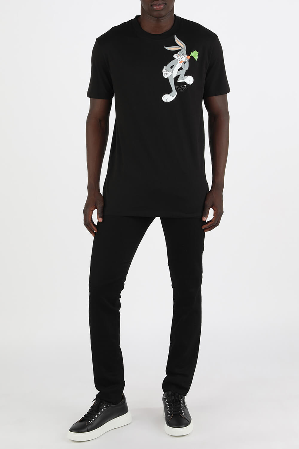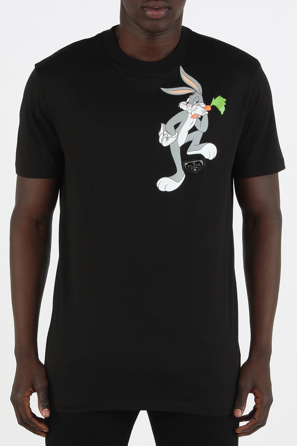 טי שירט מבית PHILIPP PLEIN. זהו דגם העשוי טקסטיל משובח בגוון שחור עם הדפס של באגס באני על החזית. לפריט גזרה ישרה נינוחה עם שרוולים קצרים וצווארון מעוגל. שם המותג על הגב חותם את עיצובו המדויק של פריט זה.
