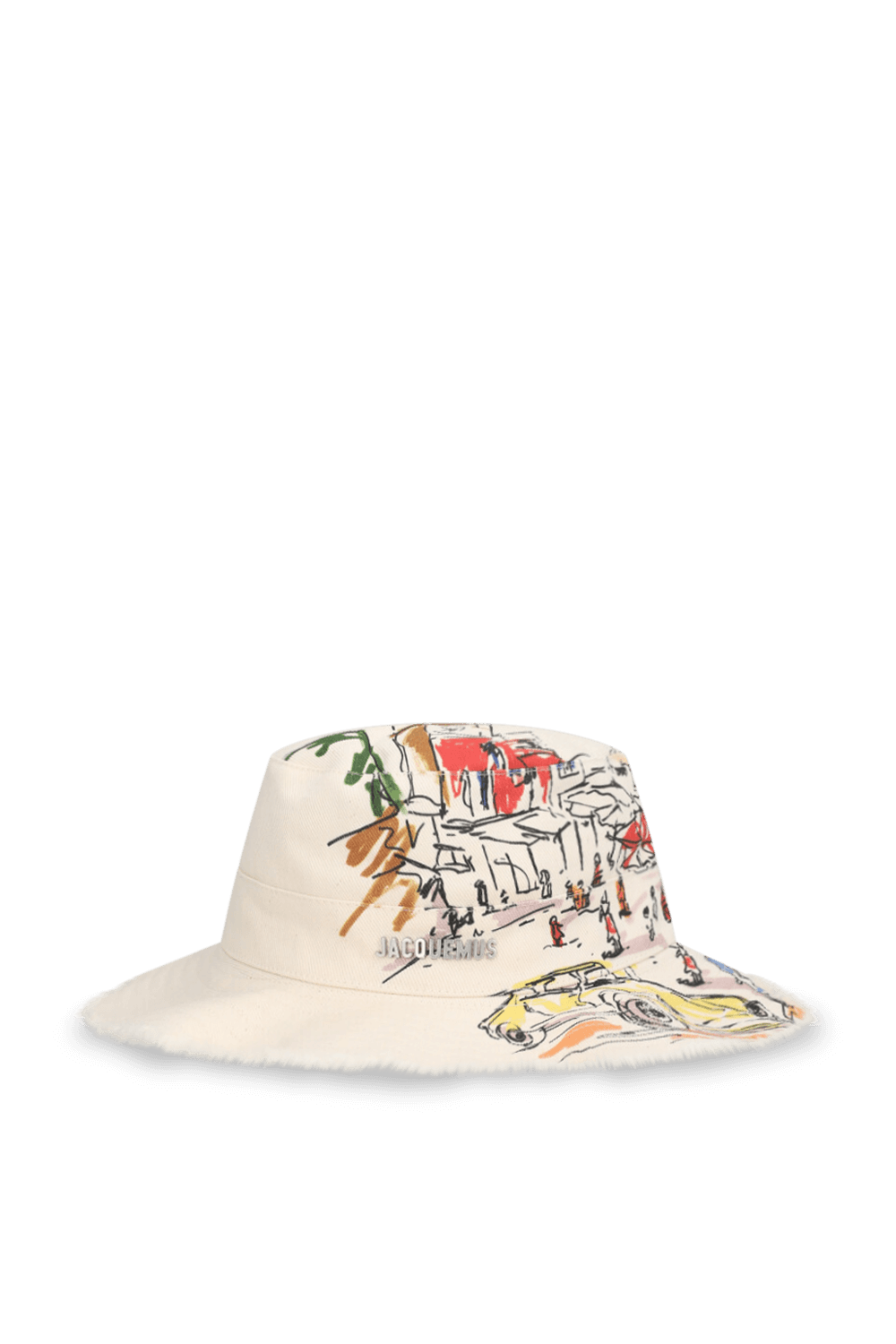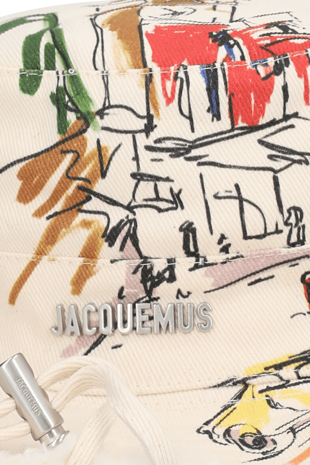 כובע Le bob Artichaut מבית Jacquemus, עשוי כותנה בצבע שמנת בשילוב הדפס ייחודי צבעוני של מכוניות באי האיטלקי קאפרי ולוגו דייגים בצידה האחורי. הטבעת לוגו המותג מופיעה במרכז בשילוב שני חוטים מתכווננים.
