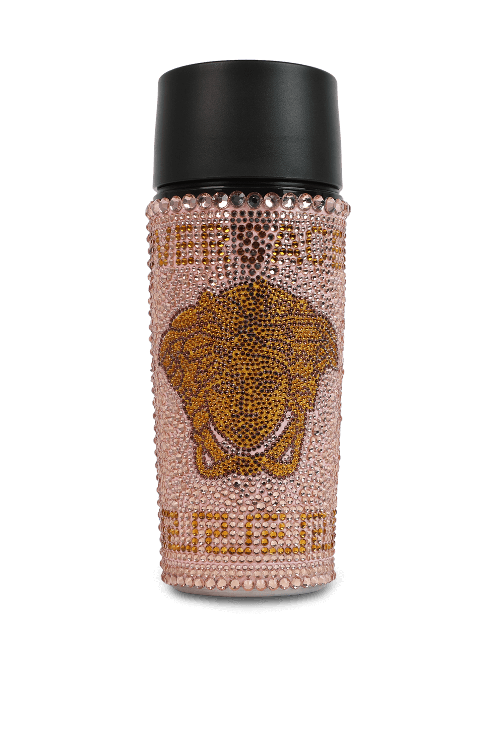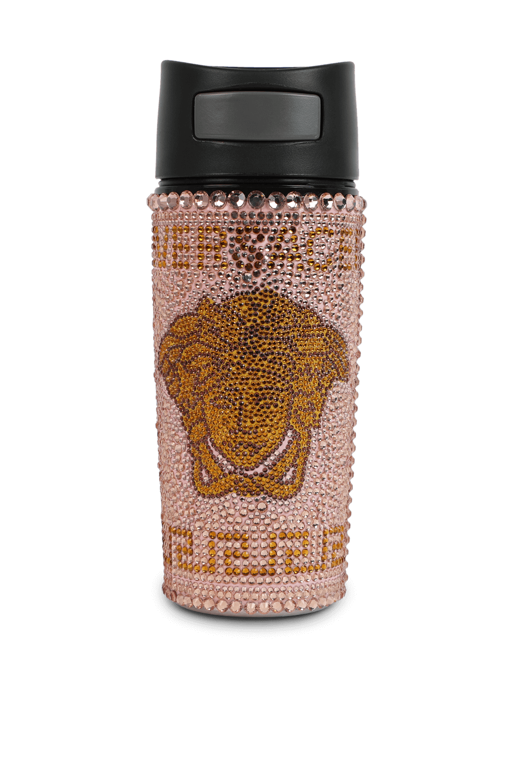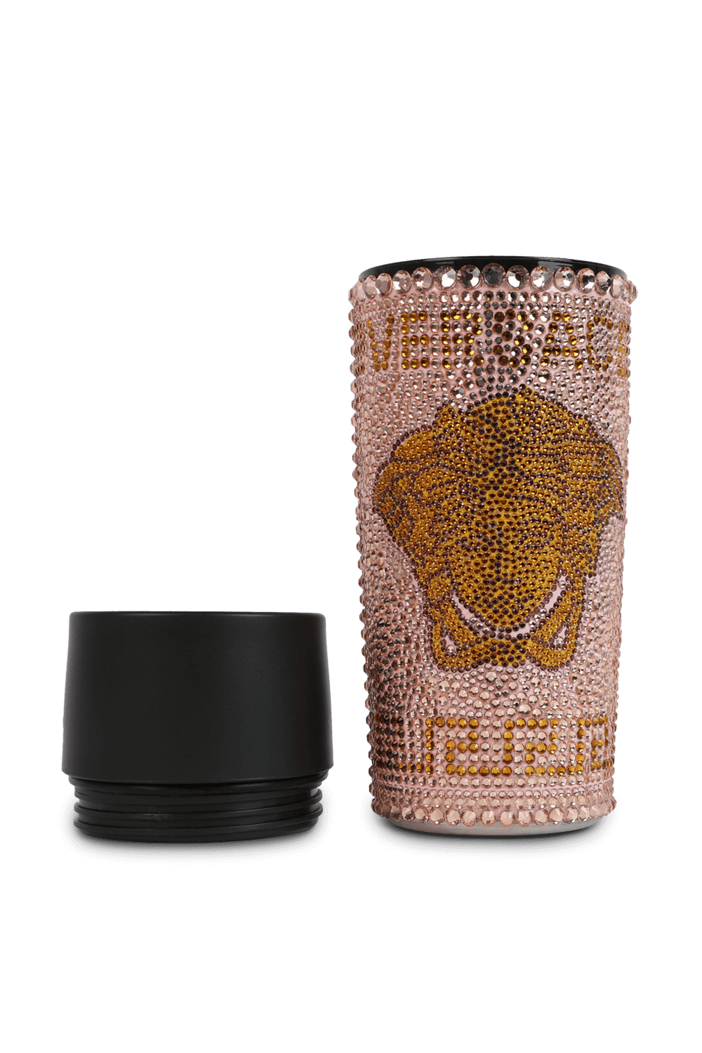 כוס תרמית רב-פעמית מבית אופנת העל Versace. פריט זה עשוי מ-100% אלומיניום איכותי ומותאם למשקאות חמים. הכוס מעוטרת בקריסטלים ורודים אול-אובר לצד דמות ראש המדוזה המזוהה עם המותג ושם המותג המתנוססים בחזית בקריסטלים זהובים.