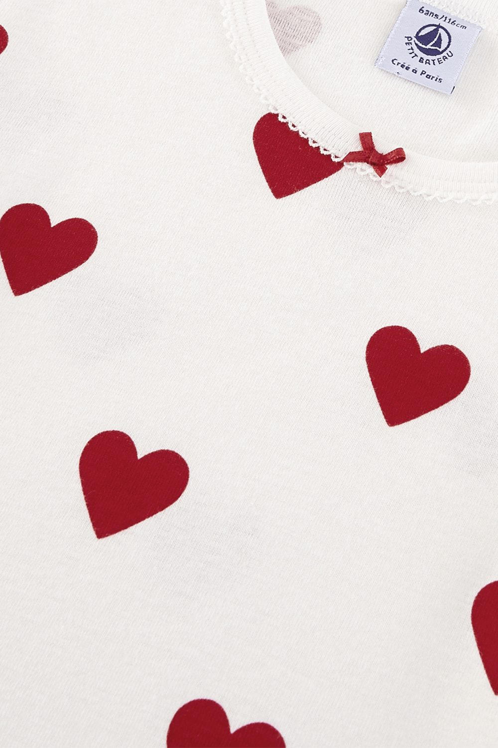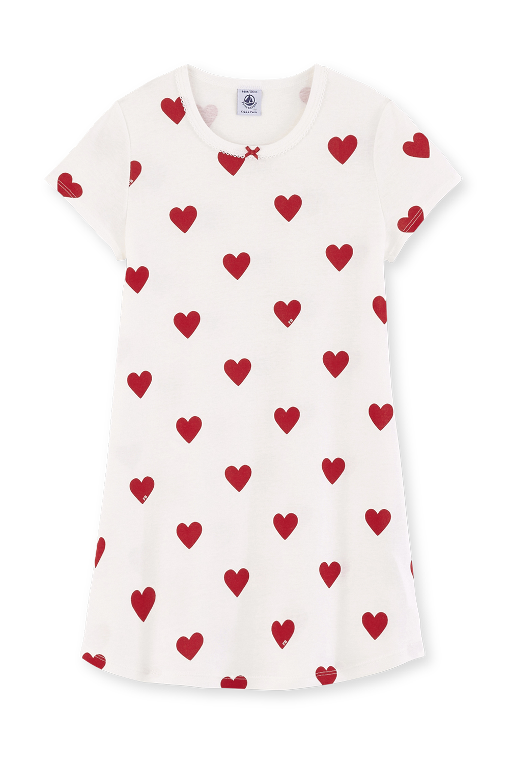 כותנות מתוקה עם הדפס הלבבות האייקוני של Petit Bateau, עשויה 100% כותנה משובחת ורכה בצבע לבן, בגזרה משוחררת ונינוחה עם שרוולים קצרים ומפתח צוואר עגול. גימור תחרה עדין באזור הצוואר וסרט קטנטן מעניקים לה טאץ' קסום.