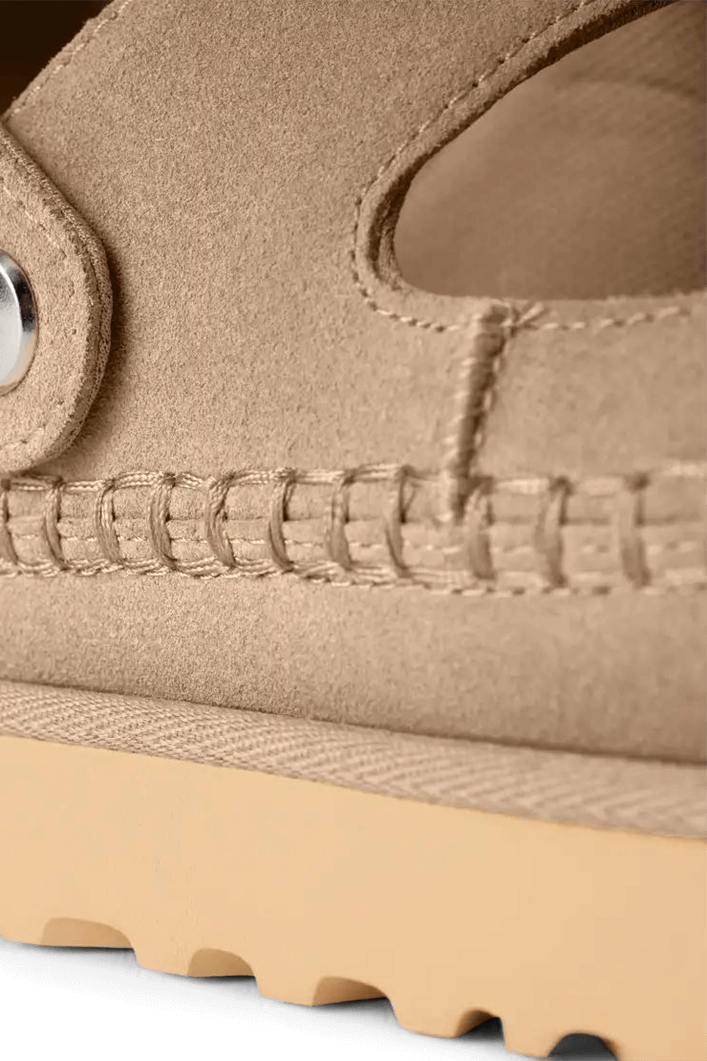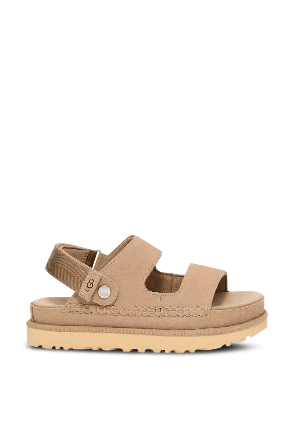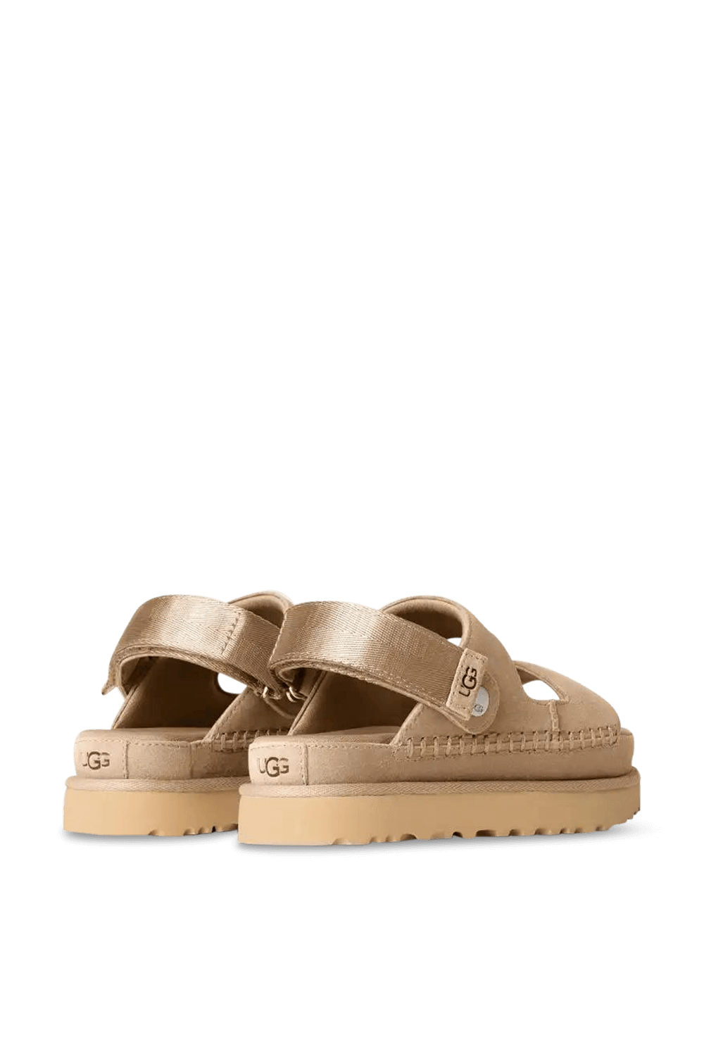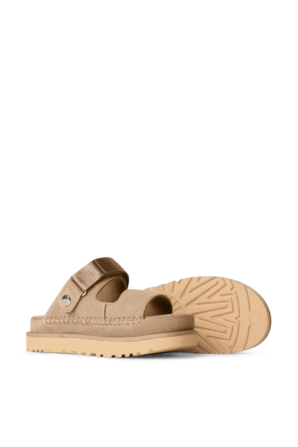 כפכפי סליידס מדגם Goldenstar Glide מבית UGG, עשויים תערובת עור זמש ופוליאסטר ממוחזר בצבע חום בהיר בשילוב סולית EVA קלת משקל. לכפכפים שתי רצועות מתכווננות להתאמה אישית במראה צ'אנקי, ורצועה שלישית הזזה על ציר, כך שניתן להעביר אותה לצידו האחורי של העקב - וכך להפוך את הכפכף לסנדל.