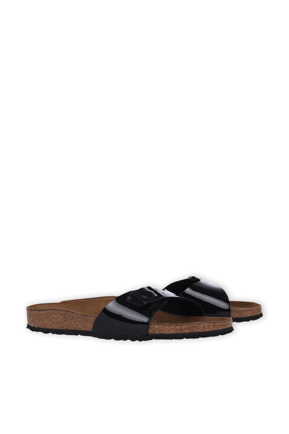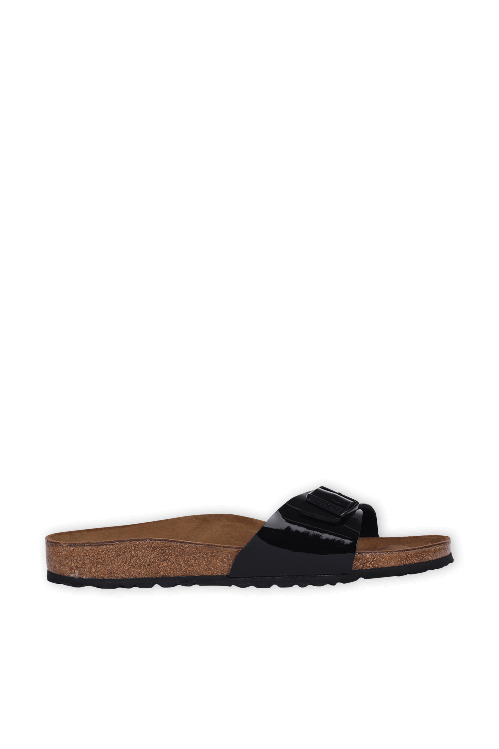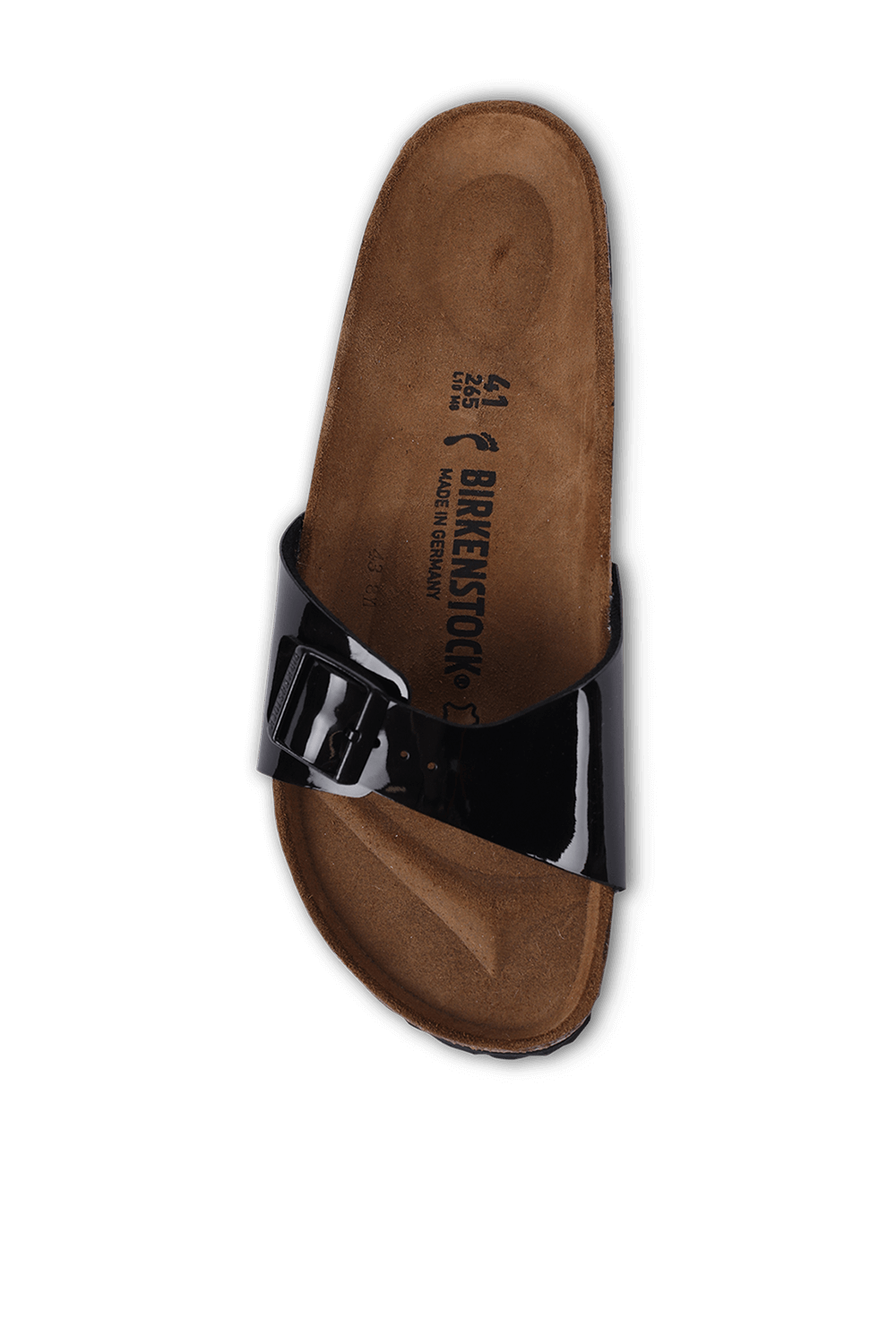 נעלי Birkenstock האייקוניות מדגם Madrid בצבע שחור לקה משלבות בין עיצוב קלאסי לנוחות חסרת פשרות, עם סולייה בעיצוב ארגונומי.