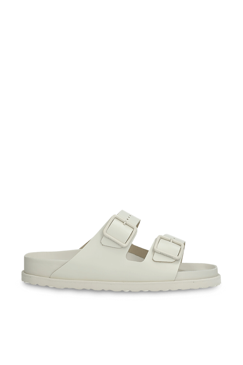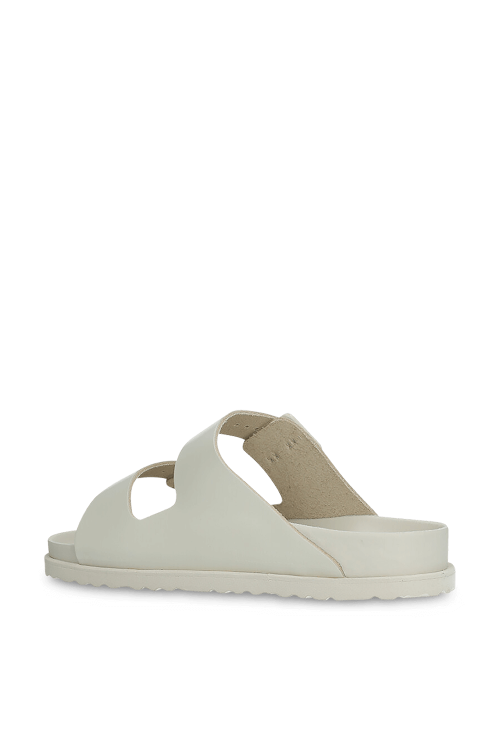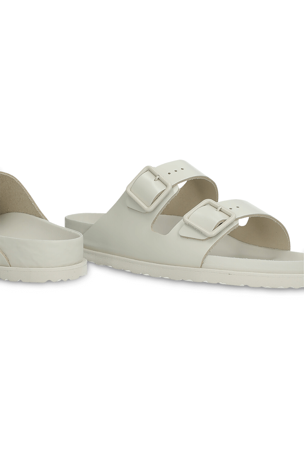 כפכפי סליידס של Birkenstock דגם Arizona האייקוני, מתוך הקולקציה היוקרתית 1774 שעוצבה כהומאז' לשנת יסוד המותג והדגמים הראשונים שעוצבו. הכפכפים עשויים עור בצבע לבן עם סוליית EVA קלת משקל לריפוד וספיגת זעזועים. כל זוג בקולקציה מיוצר בעבודת יד בגרמניה.