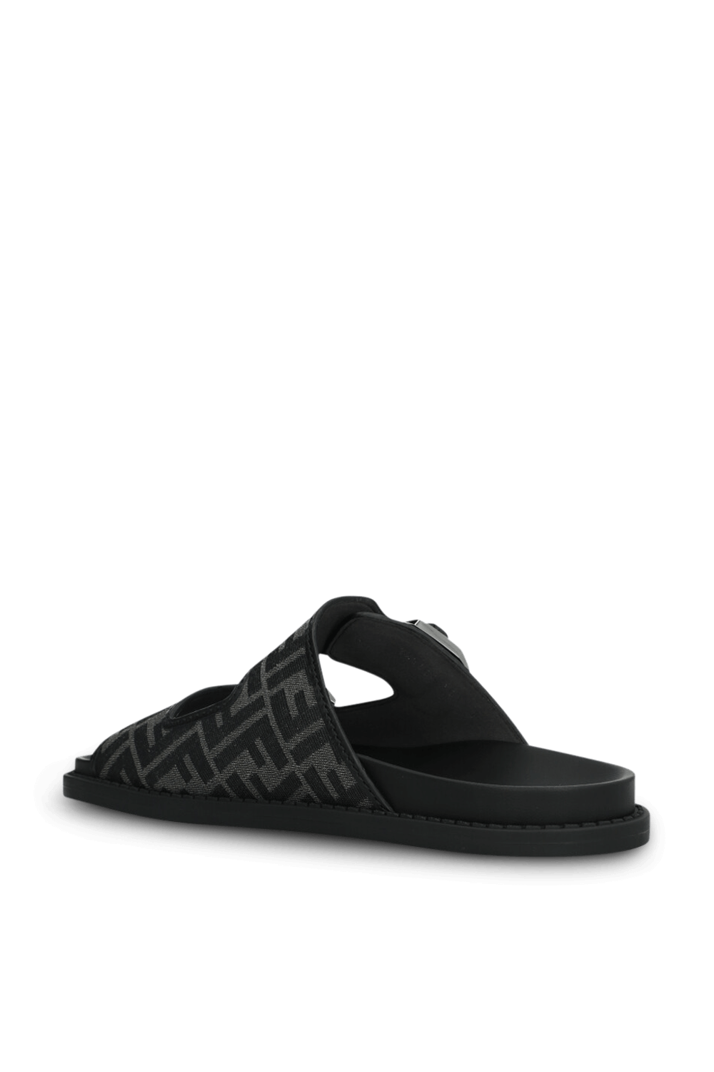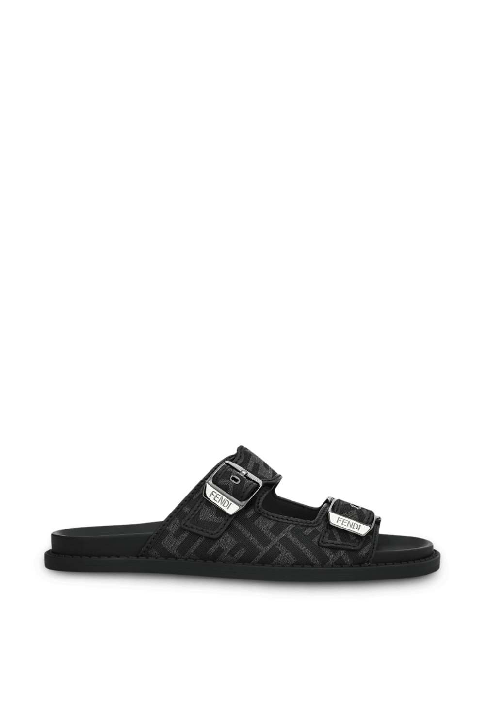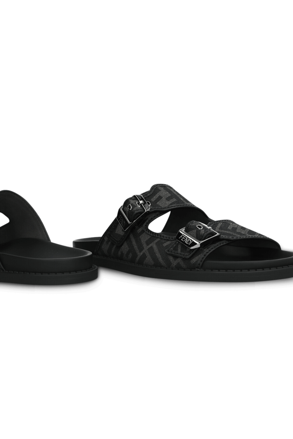 כפכפי סליידס מבית Fendi, עשויים כותנת קנבס באריגת ג'קארד ליצירת הדפס מונוגרמי בגוון שחור. לכפכפים שתי רצועות מתכווננות עם אבזם מטאלי וסוליה מעור בצבע שחור.