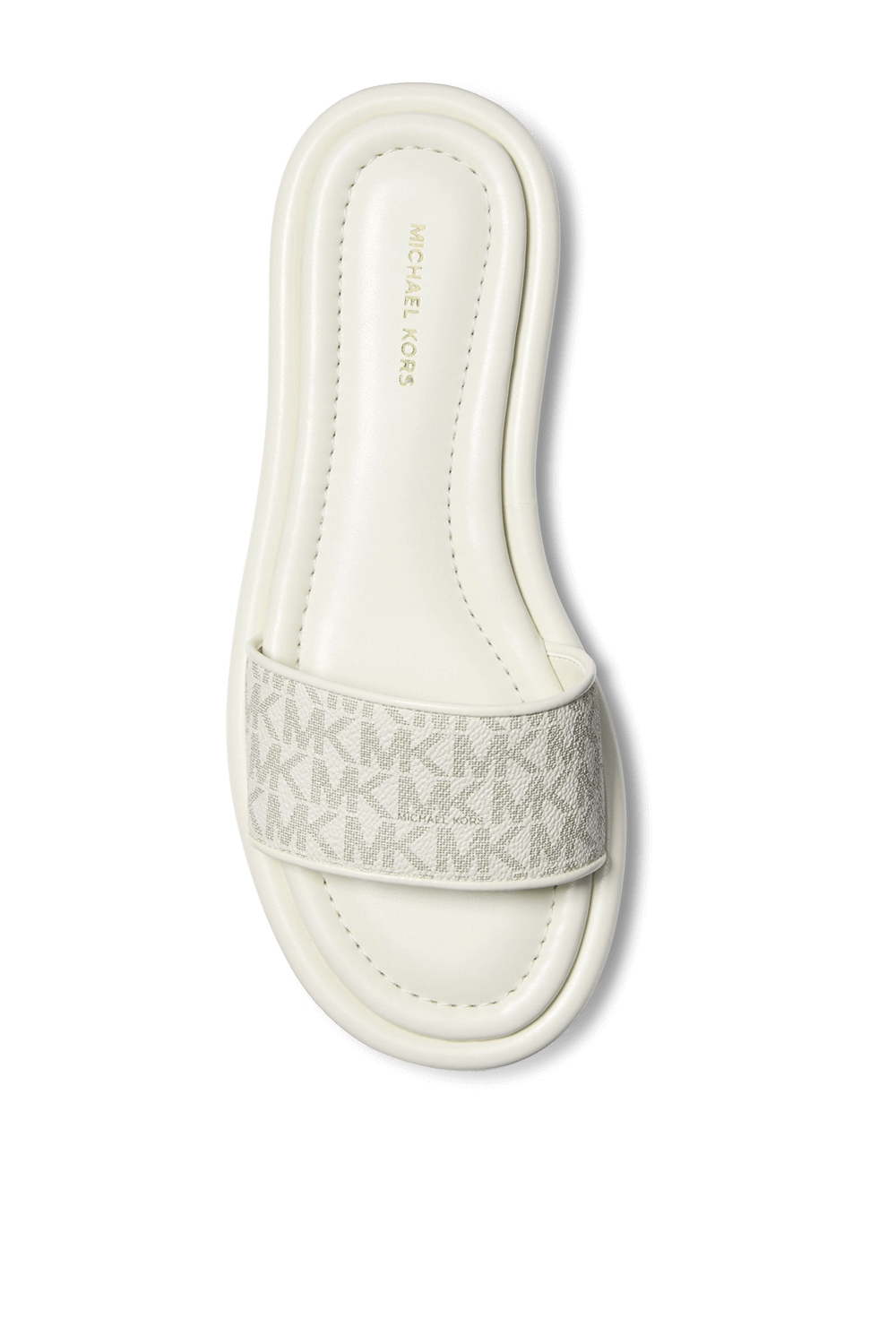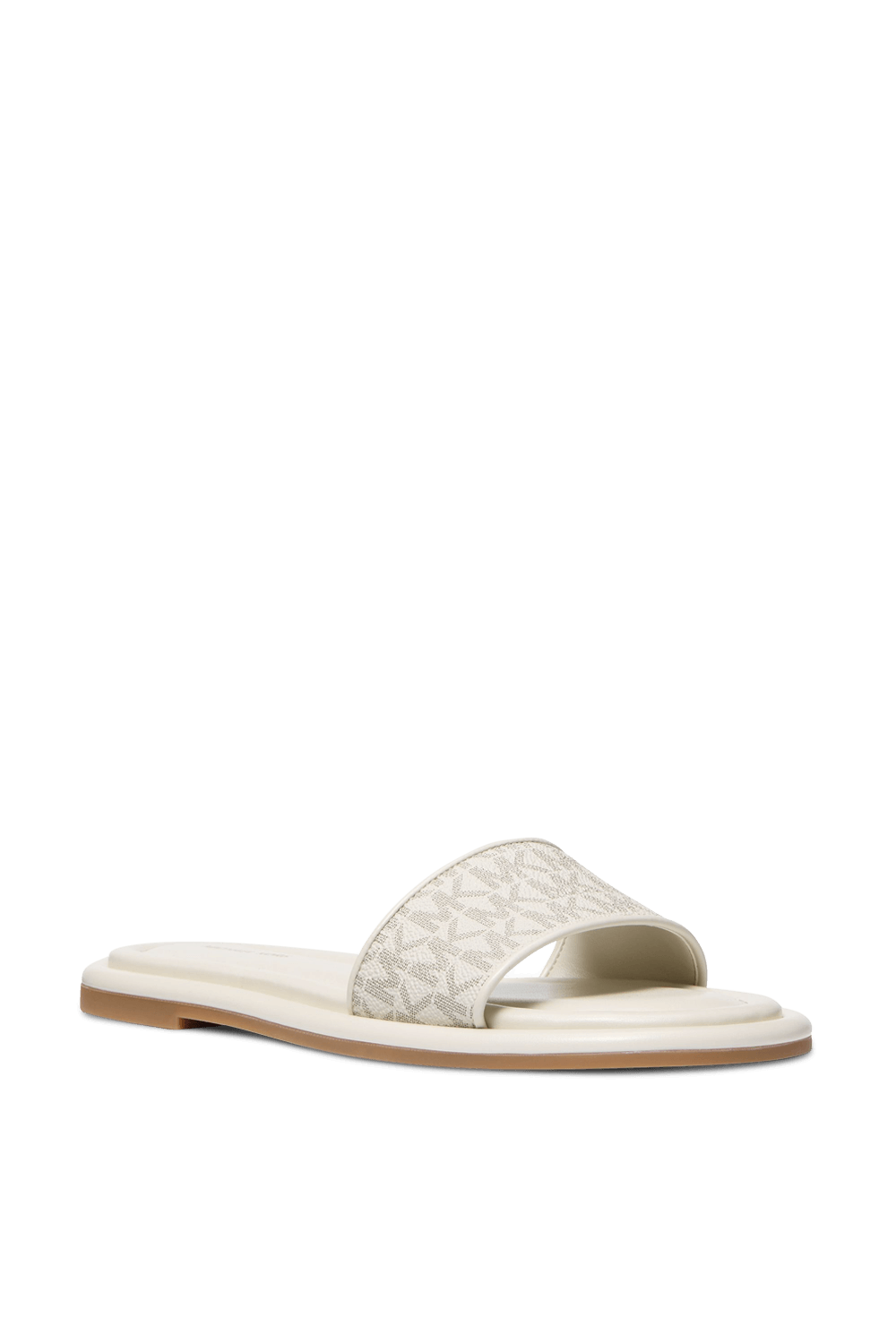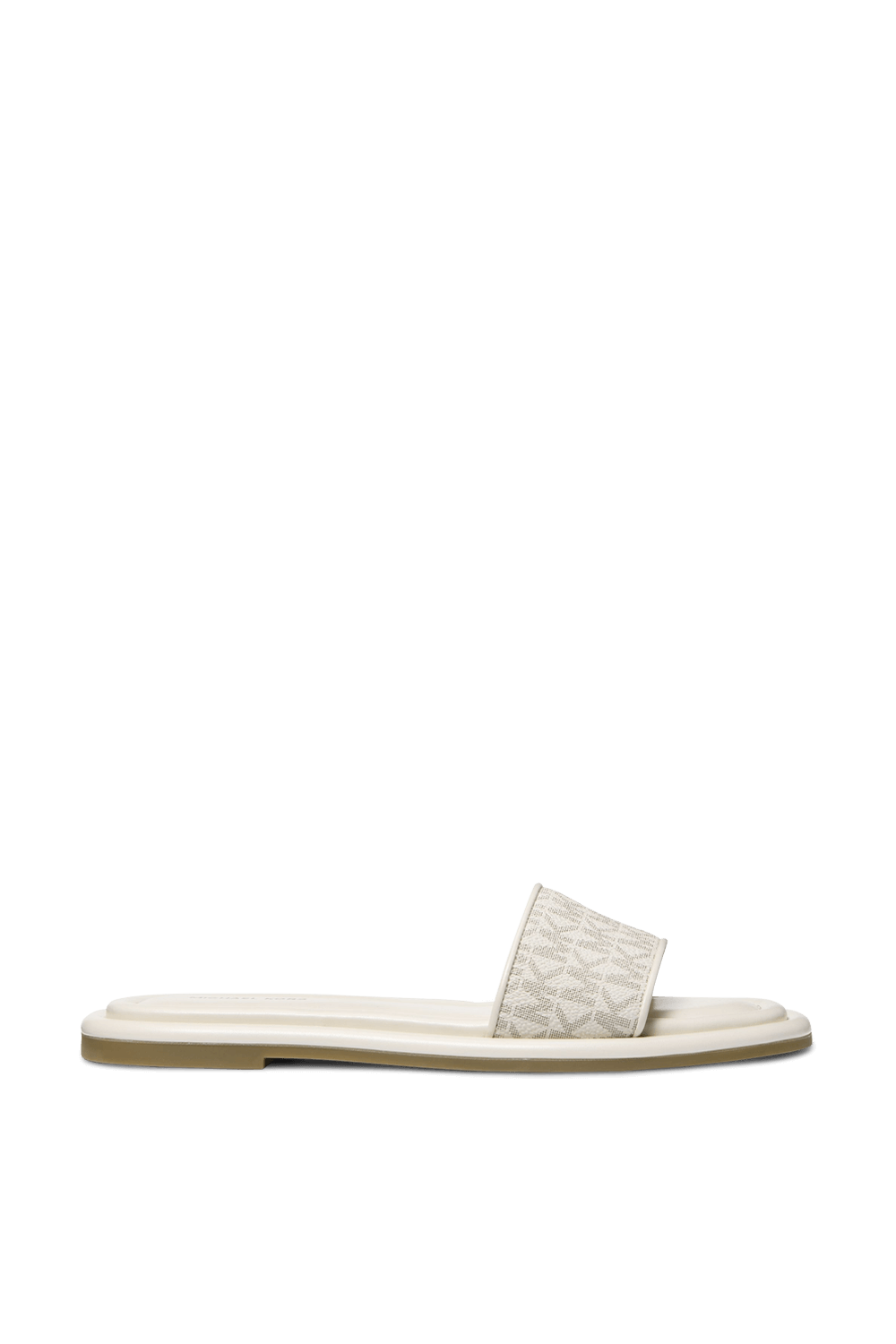 כפכפי סליידס Dana מבית Michael Kors, עשויים עור טבעוני בצבע לבן עם סוליה מרופדת ונוחה במיוחד ורצועת קנבס בדוגמת לוגו MK.