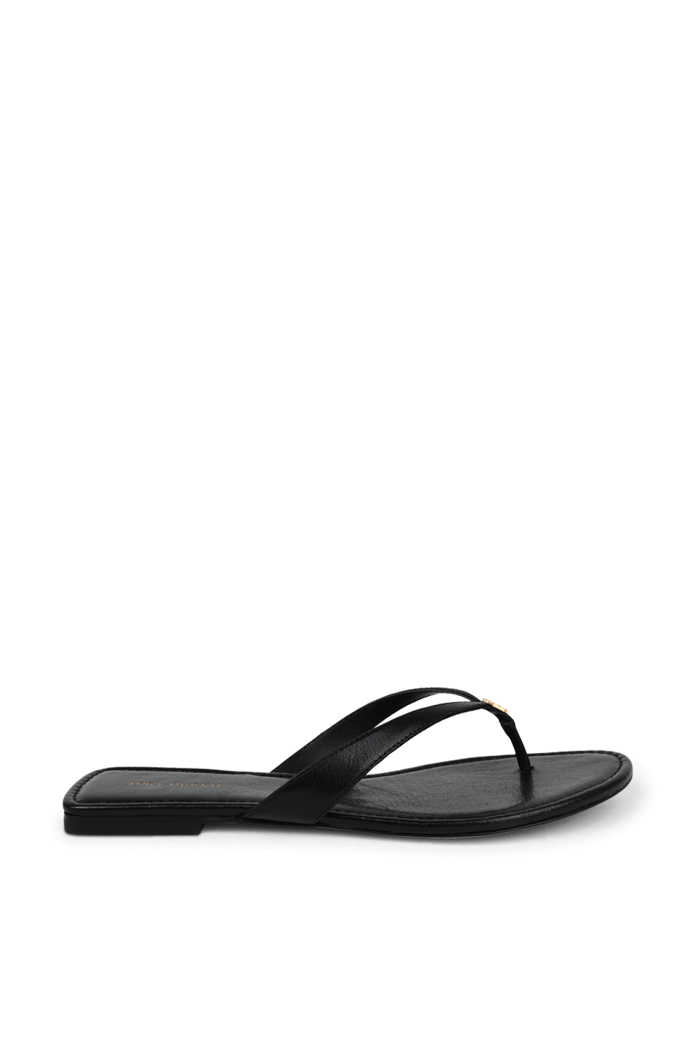 כפכפים אלו מבית Tory Burch עשויים מ-100% עור משובח בצבע שחור הכוללים רצועות אצבע עם אלמנט מונוגרמי מוזהב בחזית. לפריט מדרכים מרופדים וממותגים וסוליות עץ עם תחתית גומי.