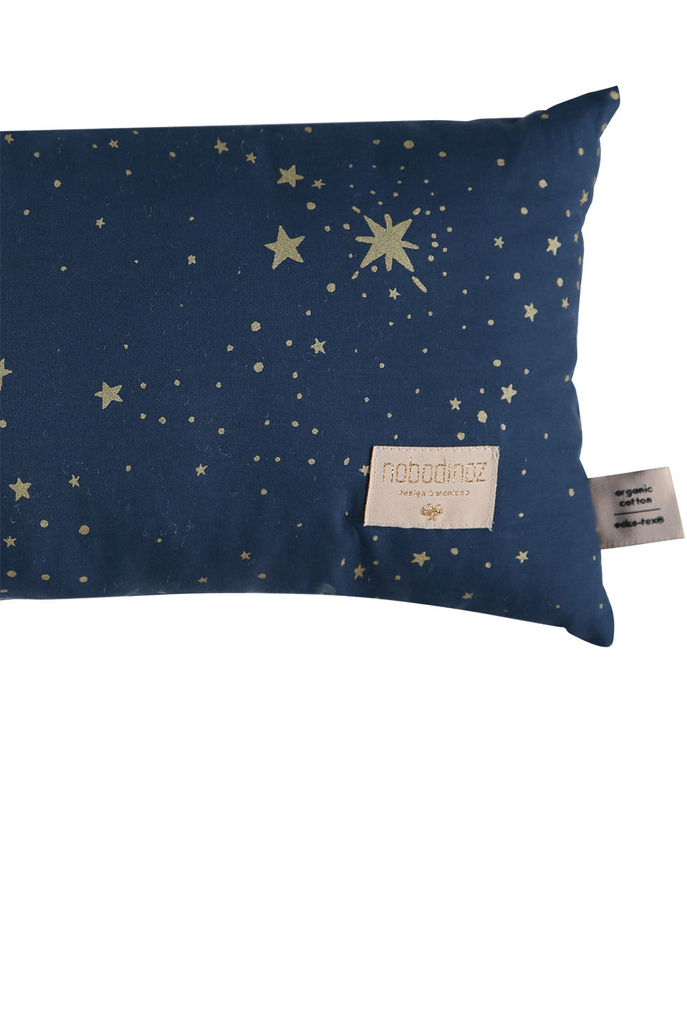 כרית מדגם Stella מבית Nobodinoz, עשויה כותנה בצבע כחול עם הדפס כוכבים זהובים. לכרית צורה מלבנית ומרופדת עם תגית לוגו המותג בסיומת.