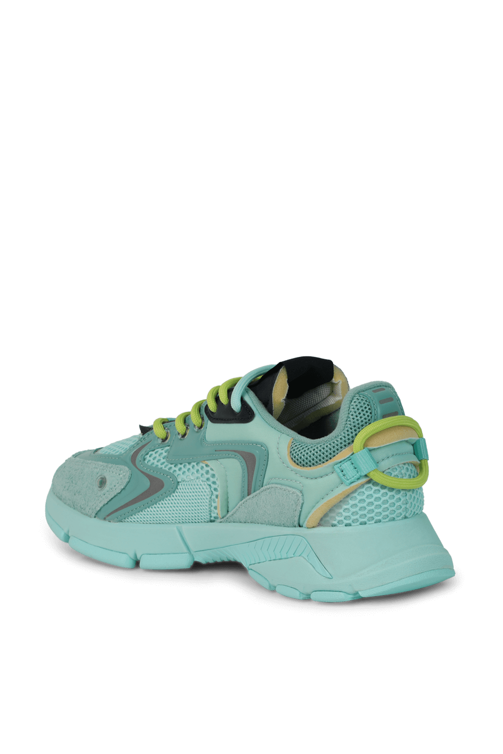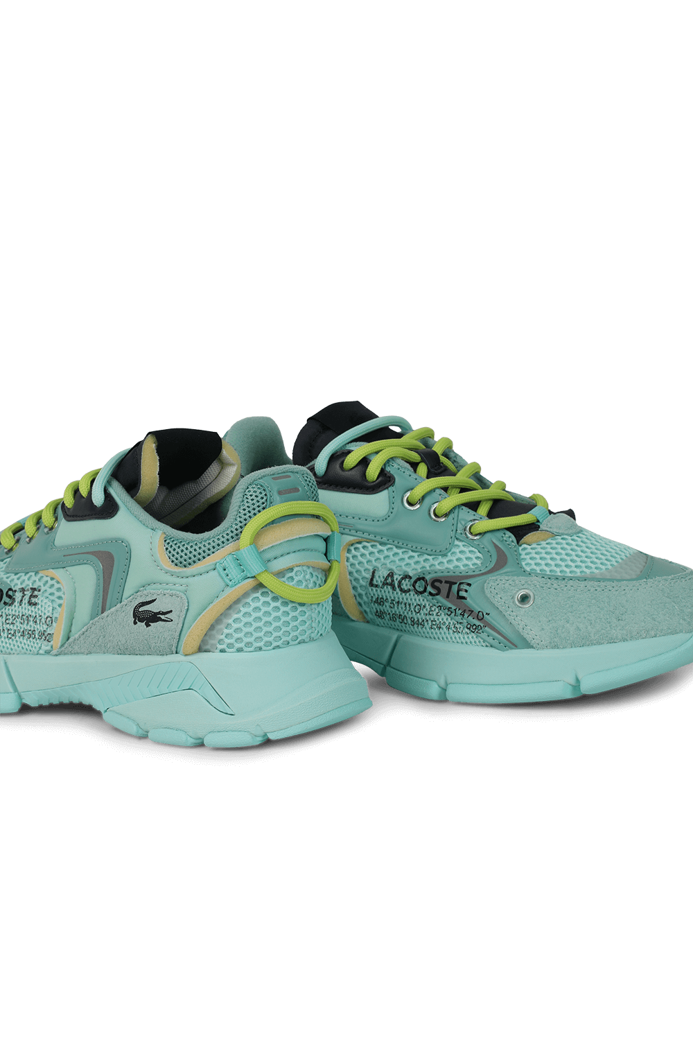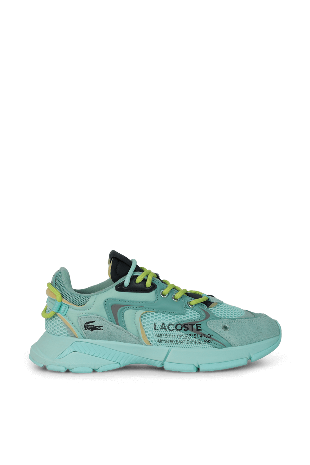 שיתוף פעולה בין בית האופנה הצרפתי Lacoste לבין המותג Neo. נעלי סניקרס מדגם L003 עשויות מטקסטיל בגימור זמש ובעיצוב טקסטורות בצבע תכלת עם הדפס לוגו צדדי ושרוכי קשירה ירוקים. לנעליים סוליות מפוסלות ומרופדות.