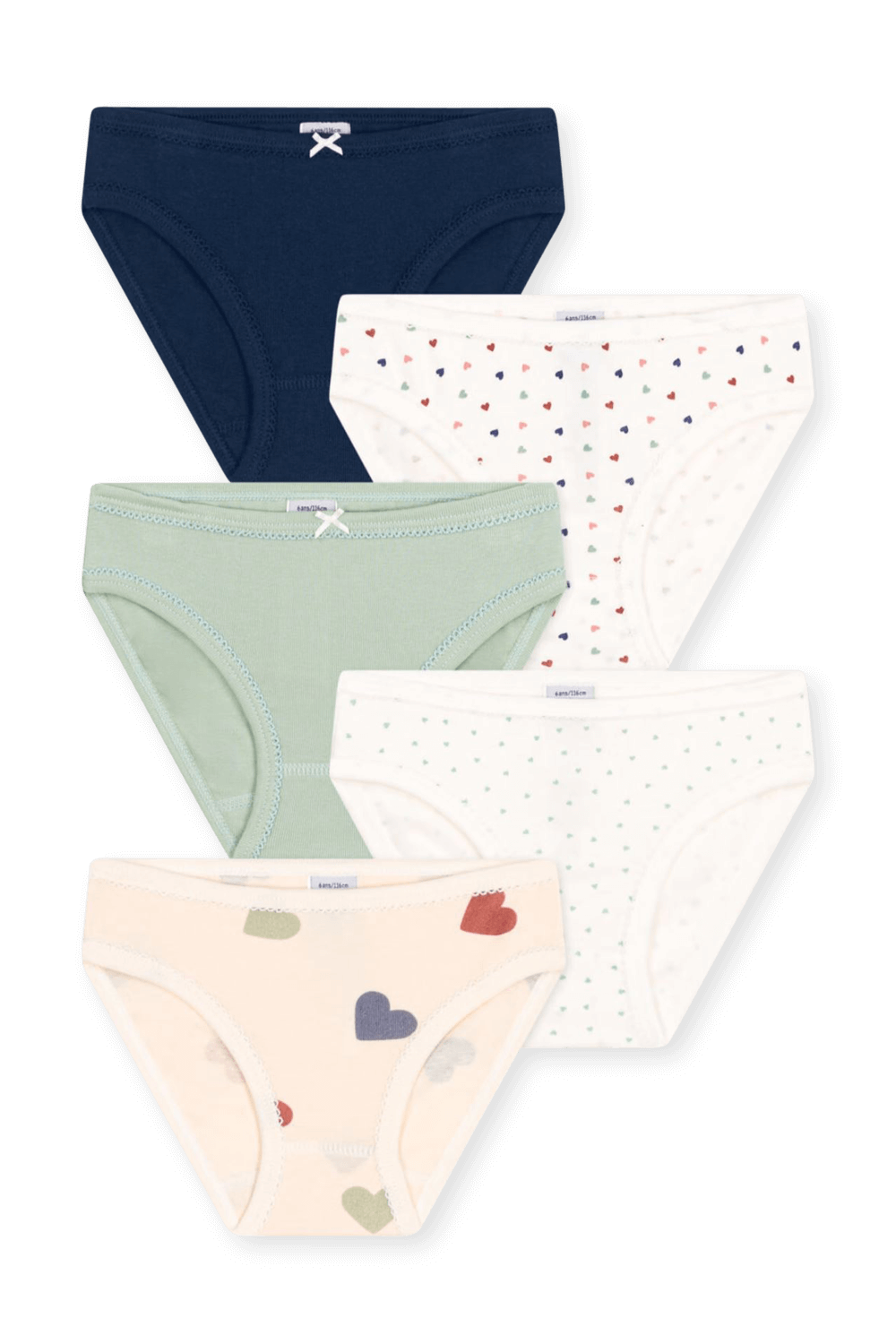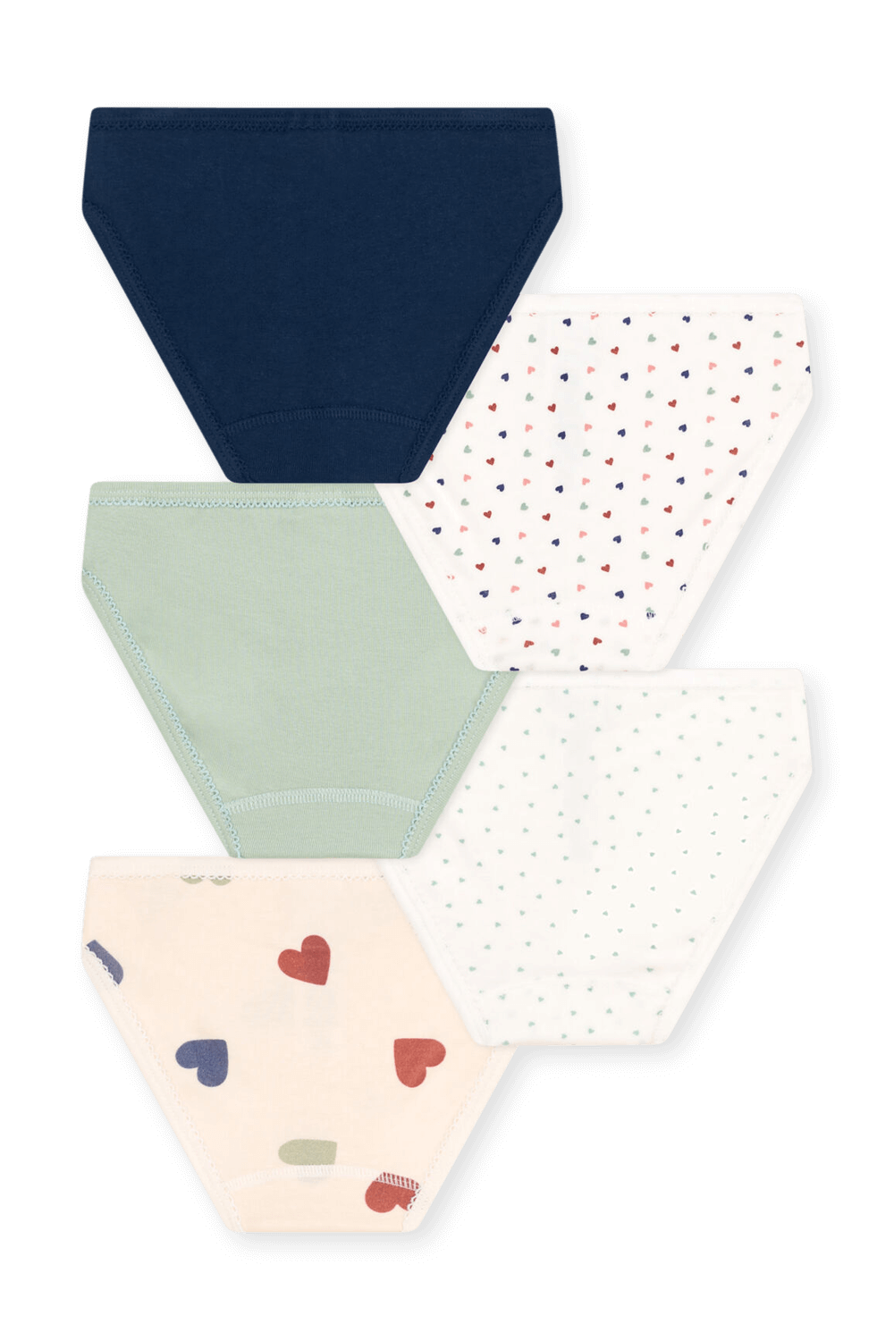 מארז חמישה תחתונים מבית Petit Bateau, עשויים כותנה אורגנית בצבעים כחול וירוק ובהדפסי לבבות שונים.