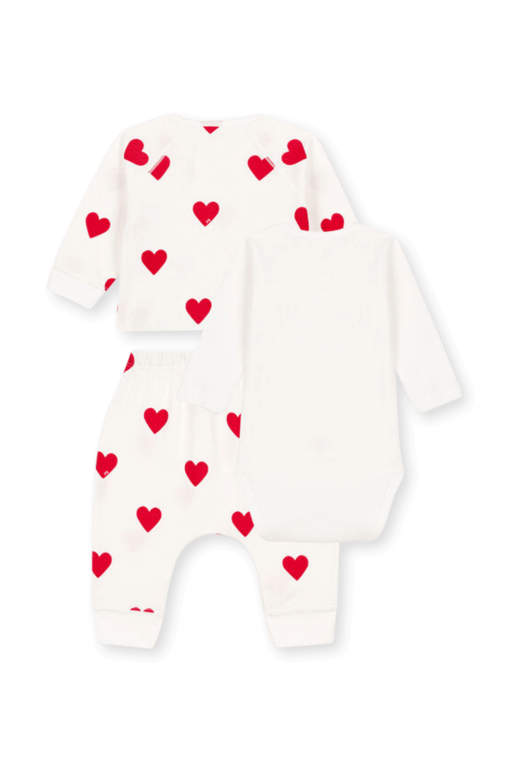 מארז מתוק מבית האופנה הצרפתי Petit Bateau המורכב משלושה חלקים - בגד גוף לבן, חולצה בגזרת קימונו ומכנסיים תואמים בהדפס לבבות אדומים. כל הפריטים עשויים 100% כותנה רכה במיוחד.