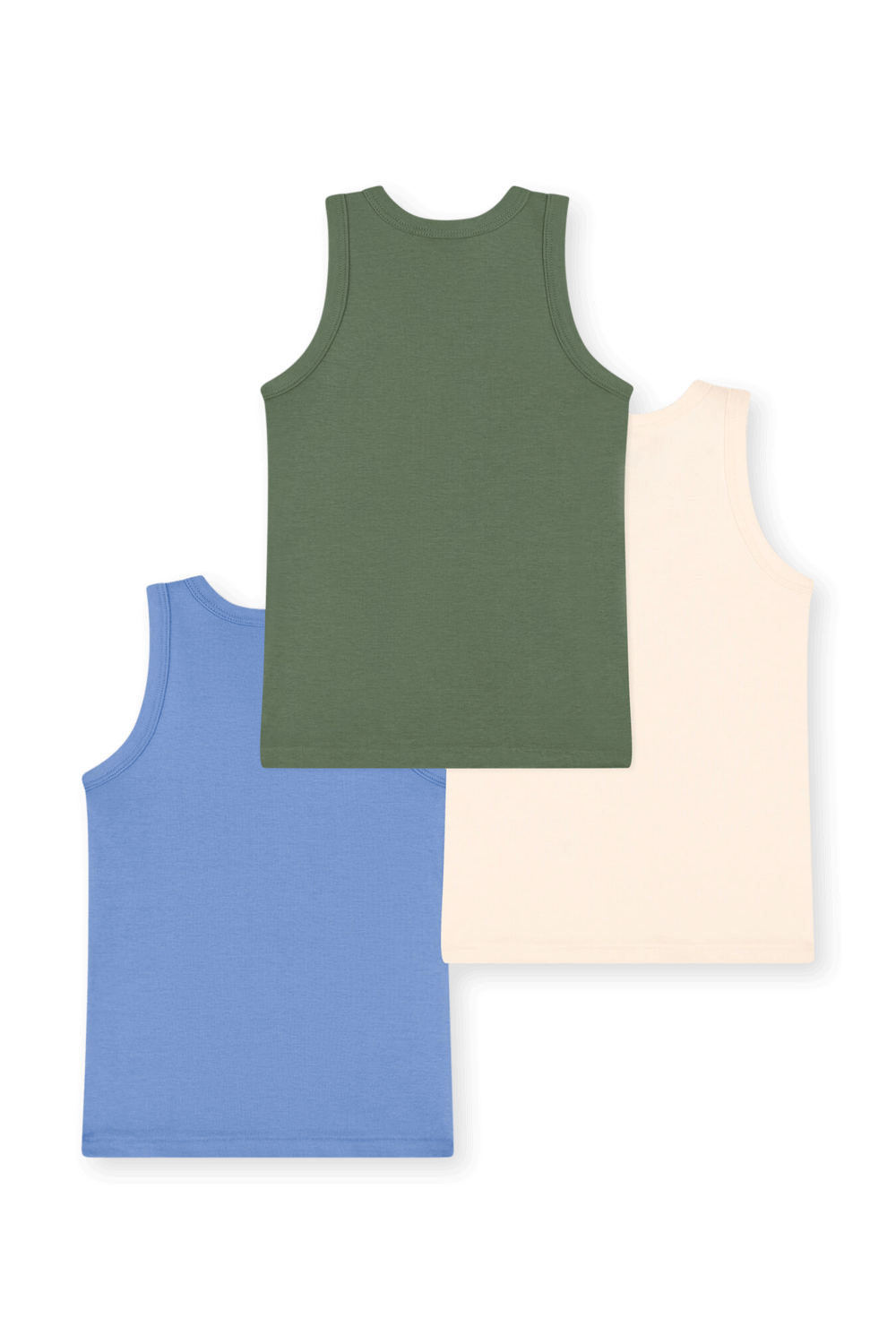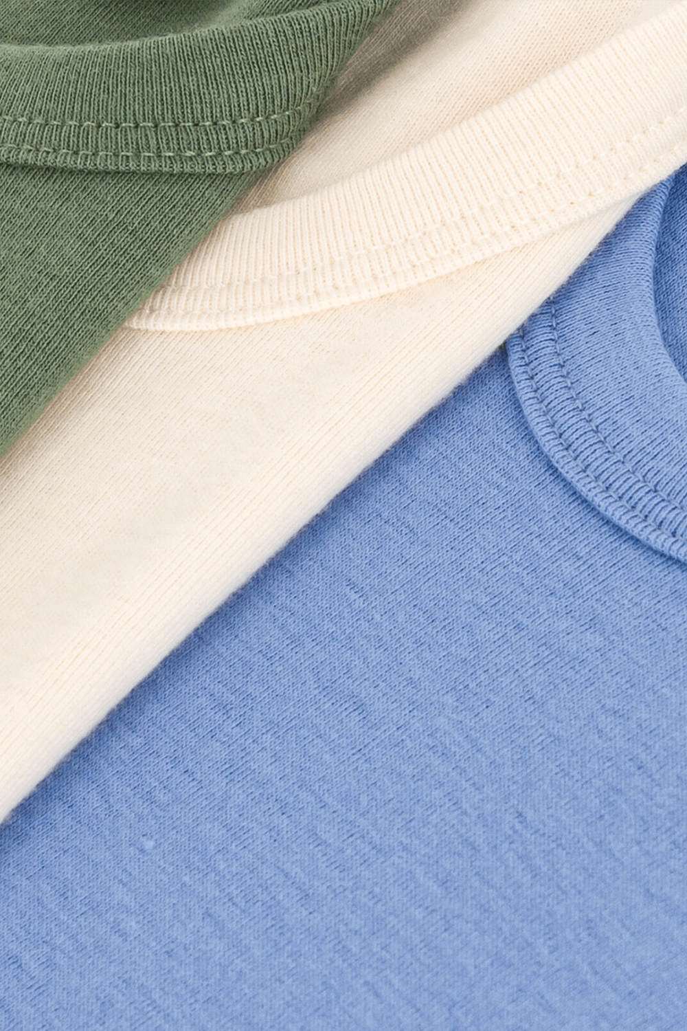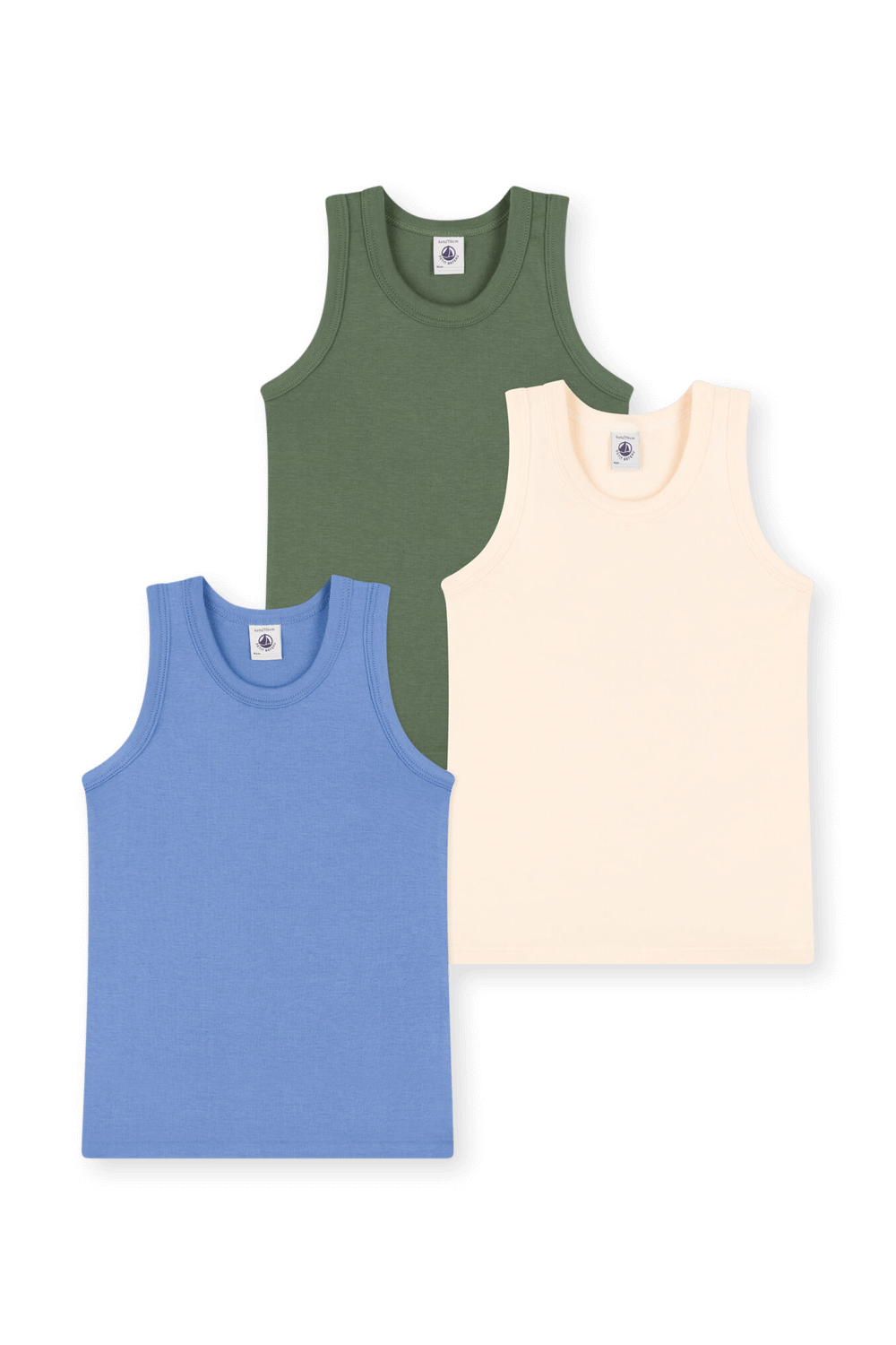 מארז שלוש גופיות בייסיק מבית Petit Bateau, עשויות כותנה אורגנית בצבעים כחול, לבן וירוק עם צווארון מעוגל.