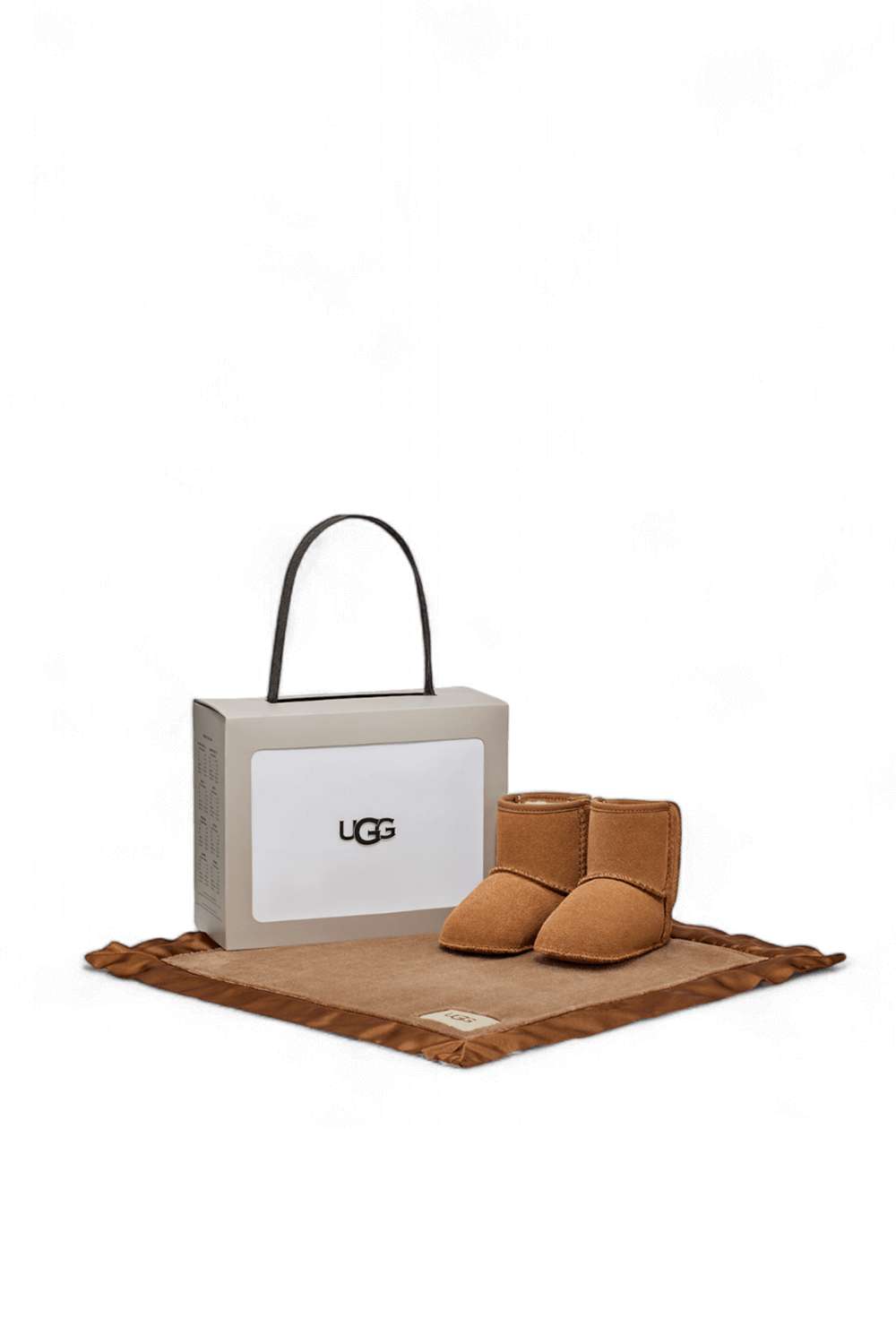 מארז מקסים ומפנק מבית Ugg, כולל מגפוני קלאסיק בייבי עשויים זמש בצבע חום בשילוב בטנת UGGplush™ עשויה צמר רך ונעים בצבע לבן. בנוסף, למארז שמיכת Lovey רכה במיוחד ומושלמת עבור הקידס.