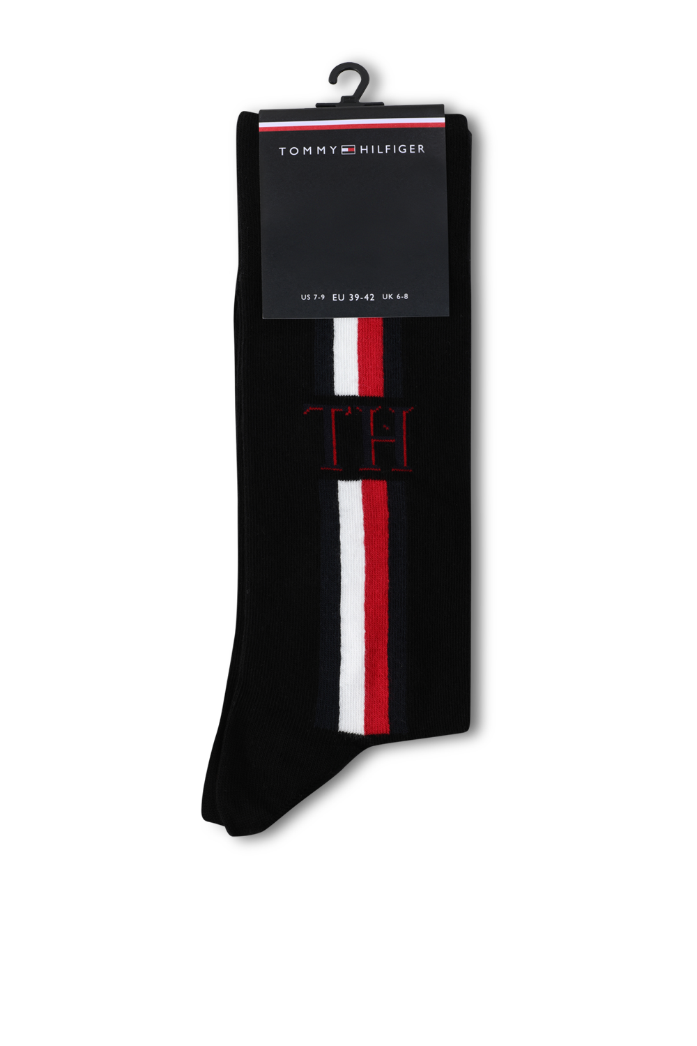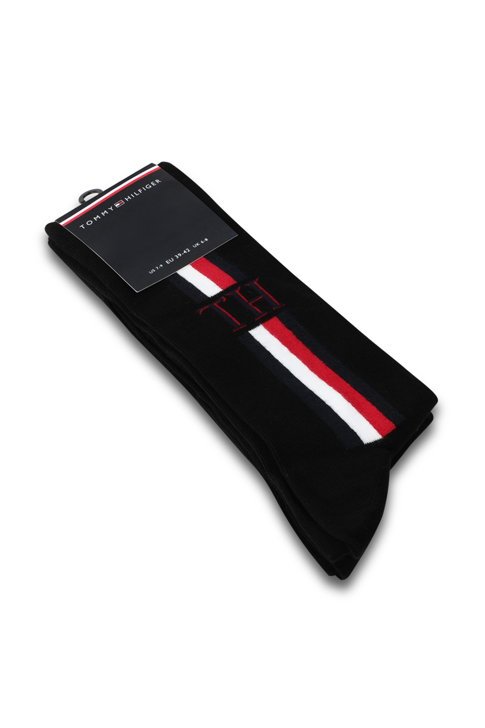 מארז שני זוגות גרביים שחורים מבית טומי הילפיגר האמריקאי. זהו דגם העשוי מתערובת כותנה איכותית וסטרצ`ית בסריגת ריב ובעיטור דגל המותג פלוס ראשי התיבות.