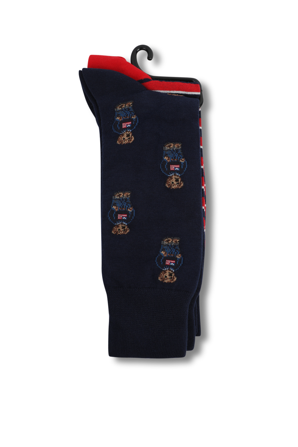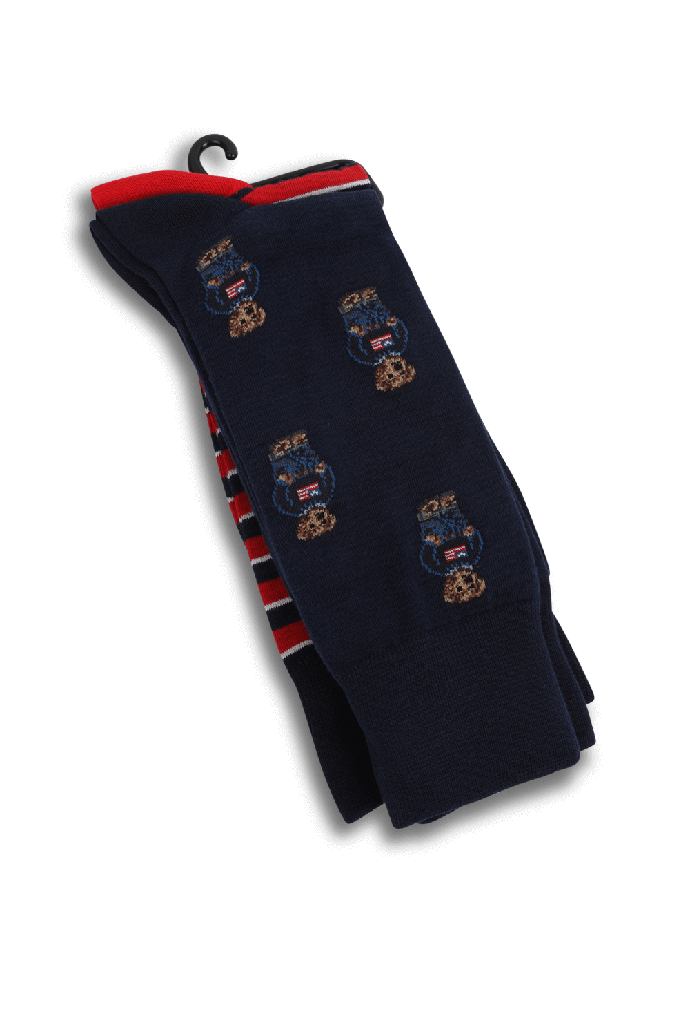 מארז משגע של שני זוגות גרביים מבית האופנה האמריקאי הוותיק Polo Ralph Lauren. הדגמים עשויים מתערובת צמר רכה ונעימה. זוג אחד בגוון כחול נייבי עם הדפס דובי בלבוש קז`ואל ממותג, בעוד שהזוג השני בדוגמת פסים בגווני כחול אדום ולבן. הפריט בארוך מעל הקרסול הנחתם באמרות ריב המספקות אחיזה נוחה לרגל.