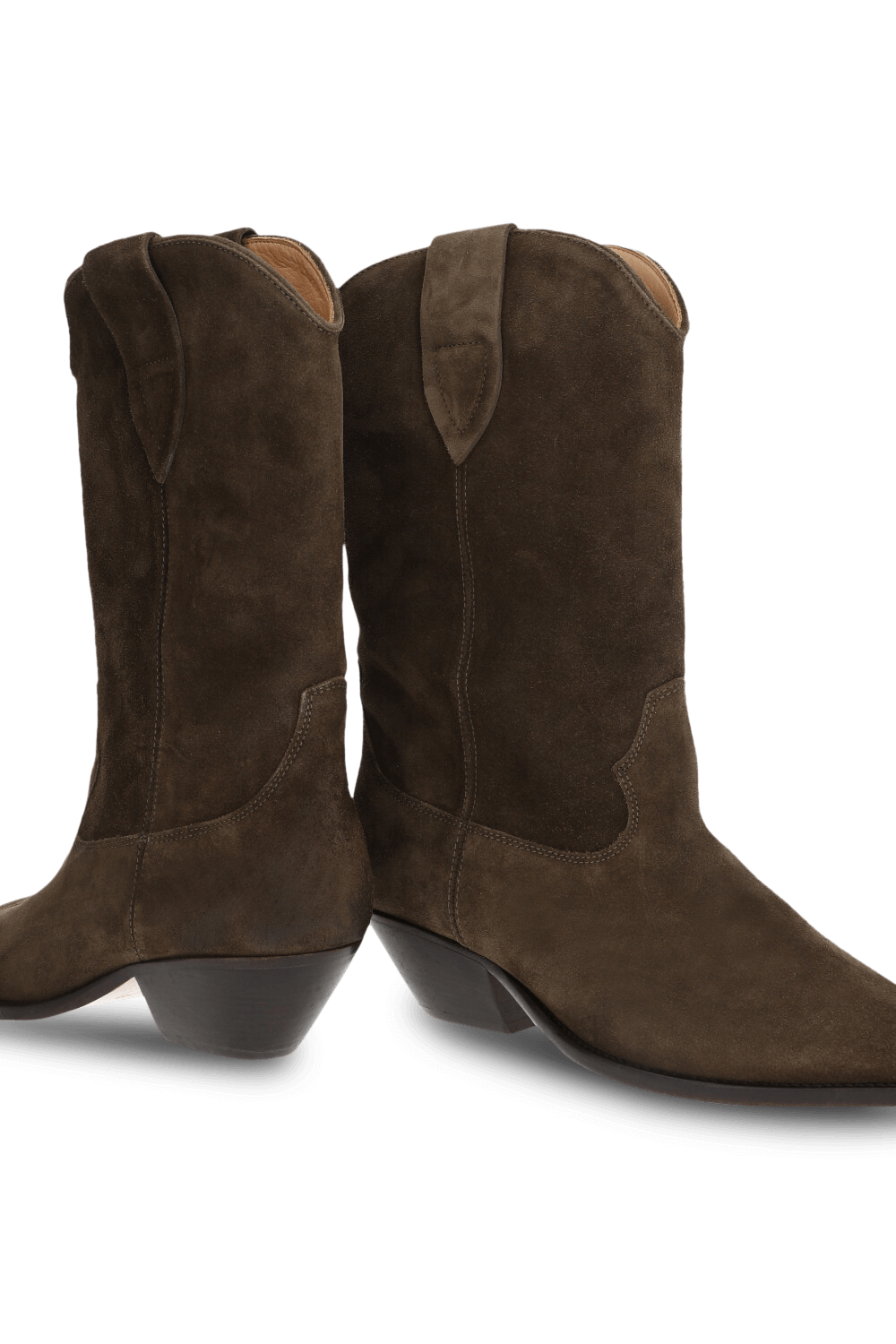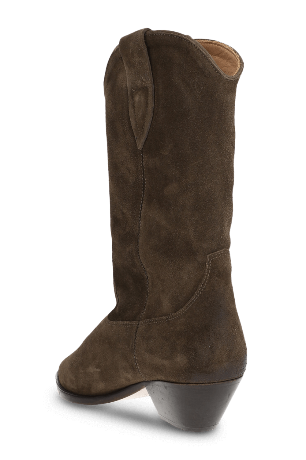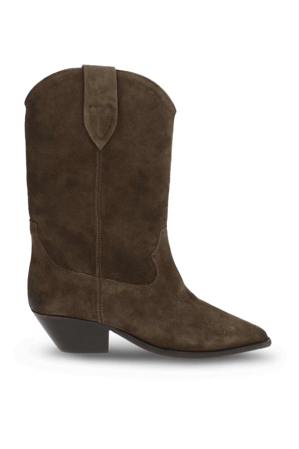 מגפוני בוקרים מבית Isabel Marant, עשויים עור זמש בצבע חום בשילוב עיצוב תיפורים ובסיומת מחודדת עם עקב נמוך.