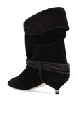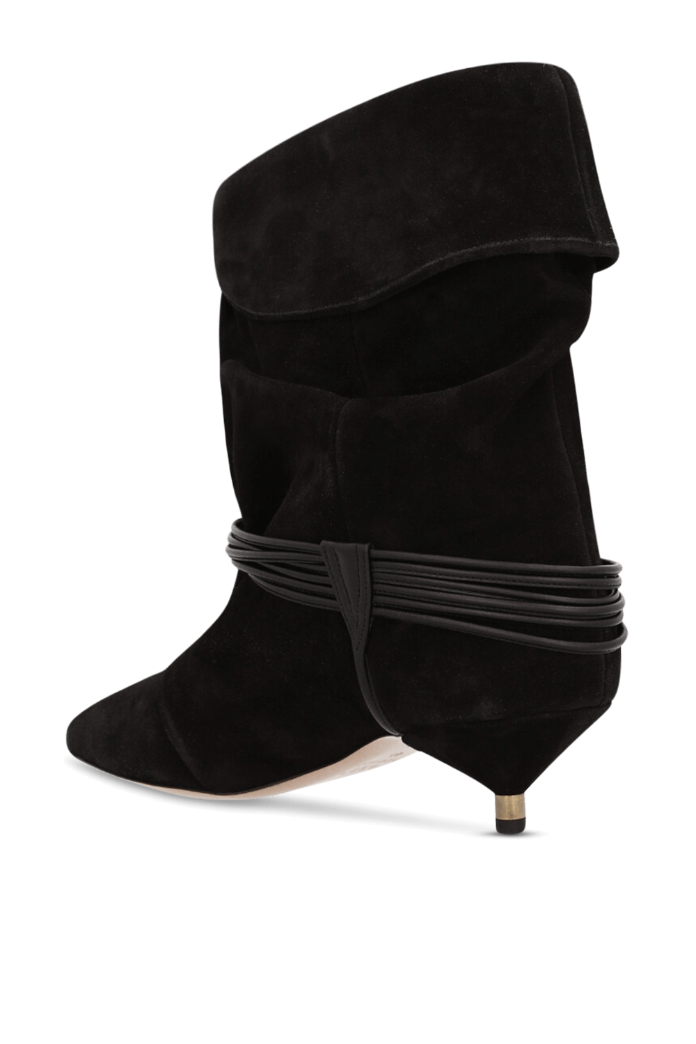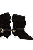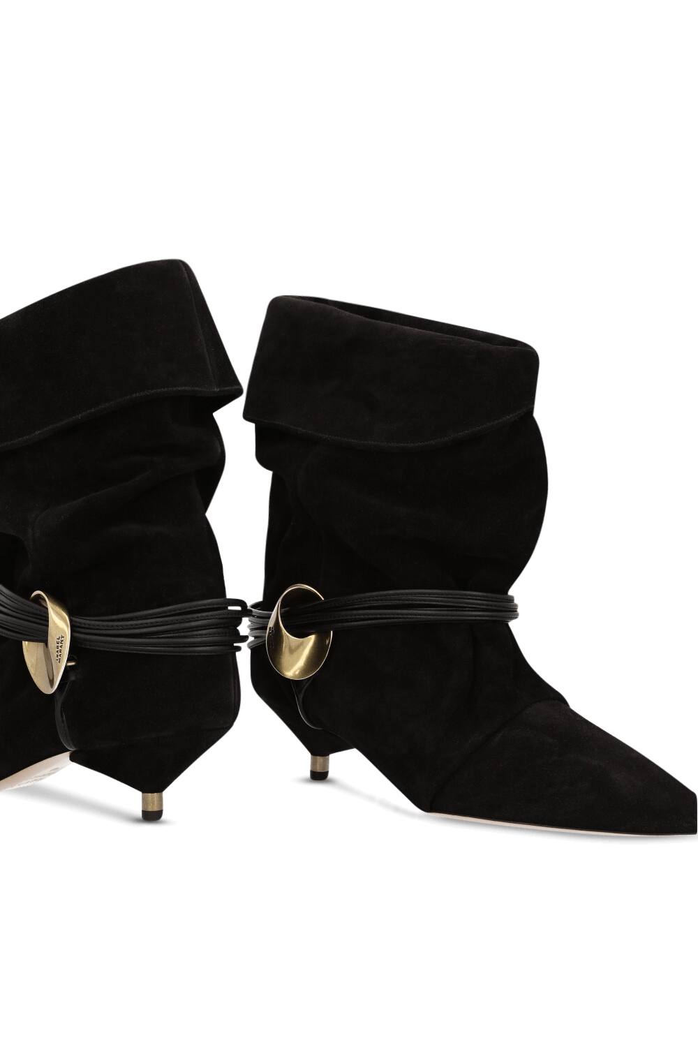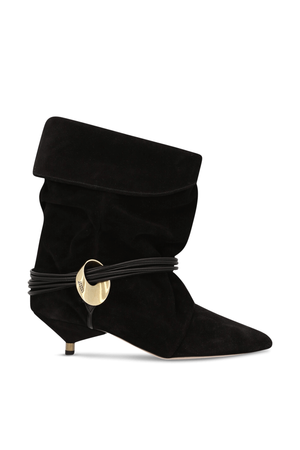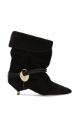 מגפוני Edrika מבית Isabel Marant, עשויים זמש בצבע שחור ובעיצוב שרוכים המתחברים לאלמנט זהוב, עם עקב חתולי.