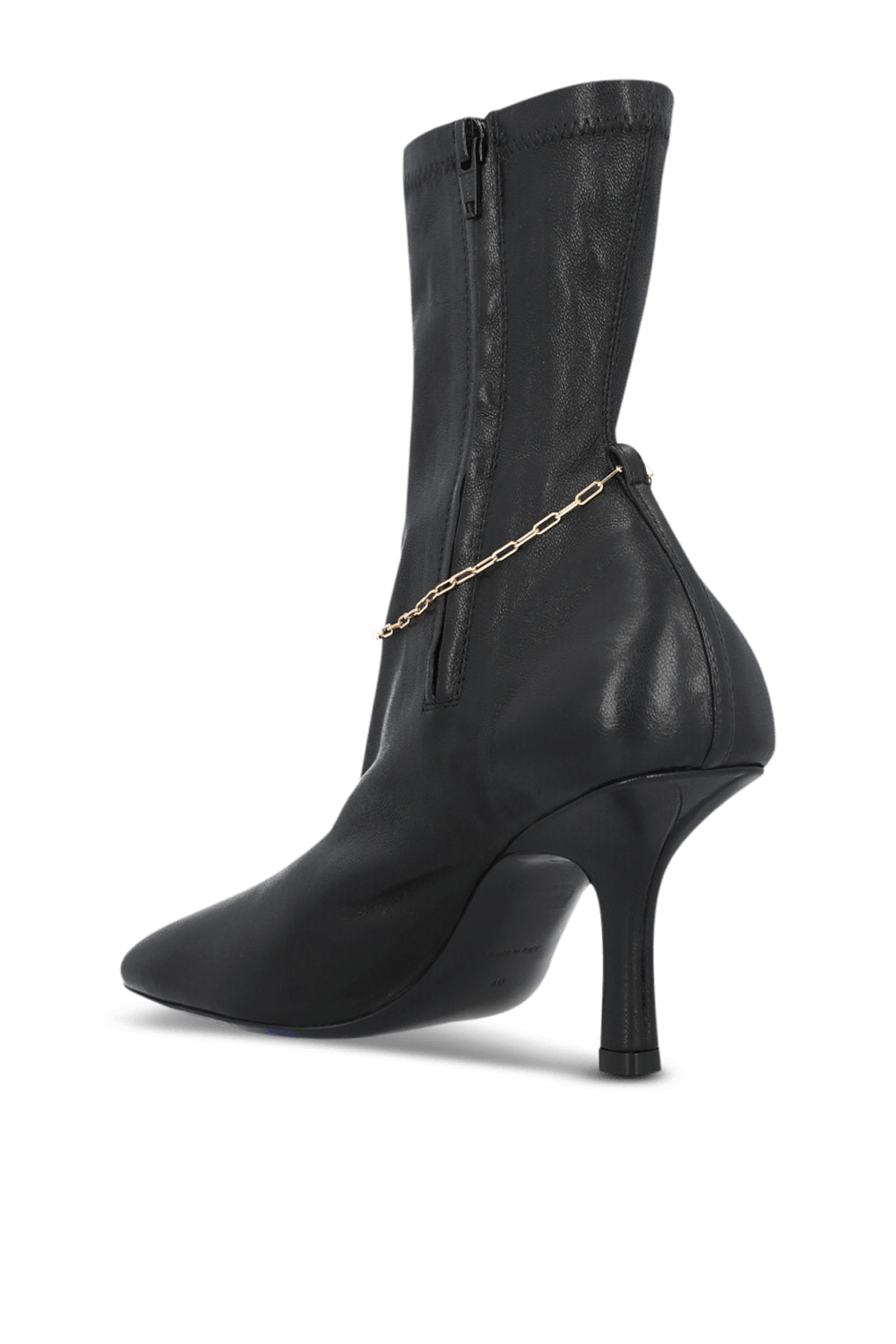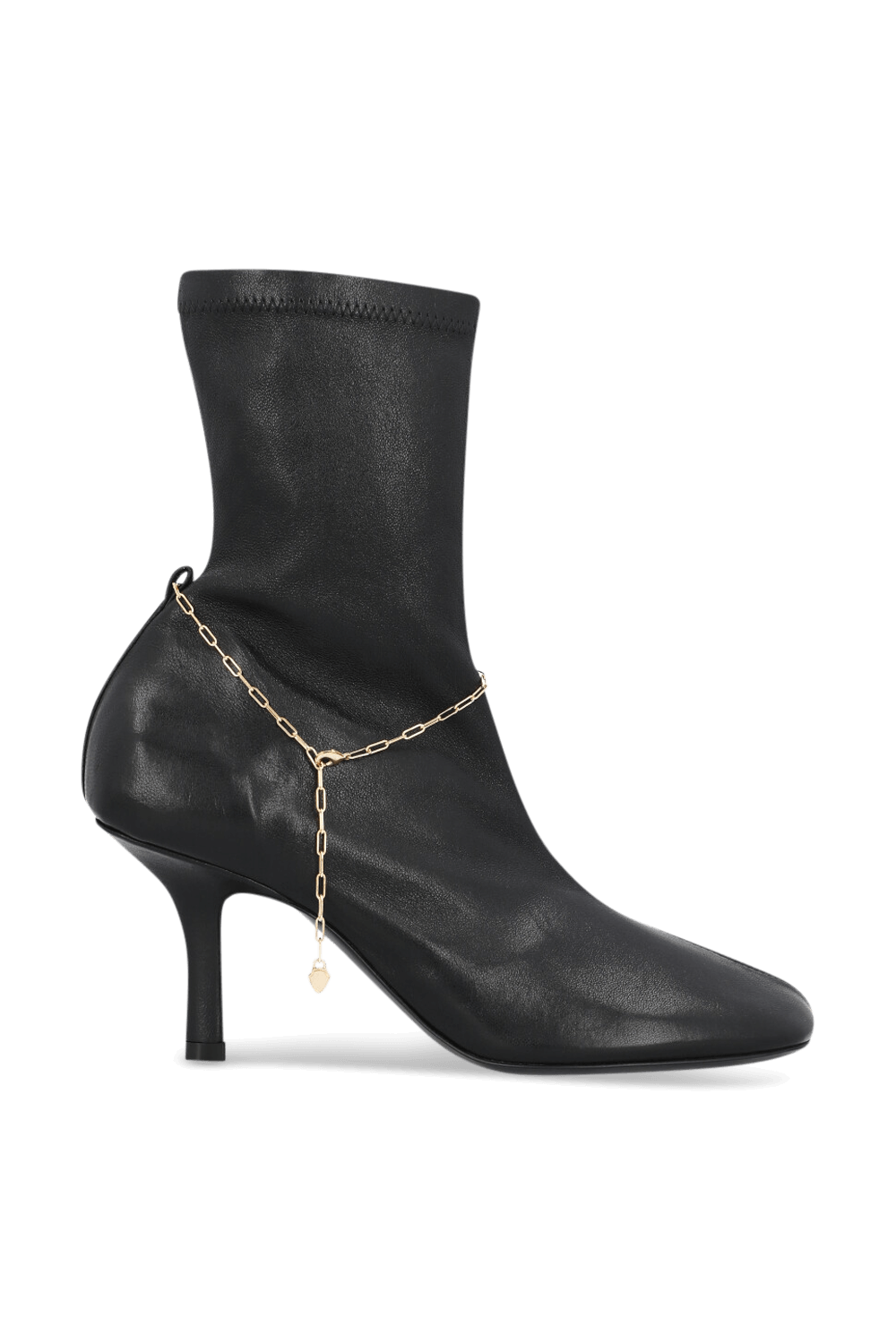 מגפוני עקב מבית Burberry, תוצרת איטליה, עשויים עור בצבע שחור בעיצוב שרשרת זהובה מתכווננת המעניקה טוויסט ייחודי למגפיים.