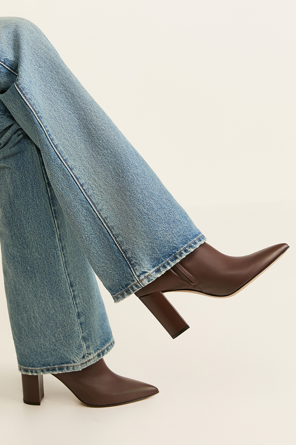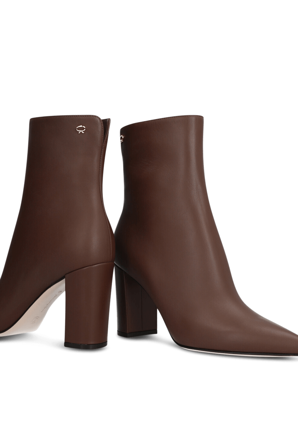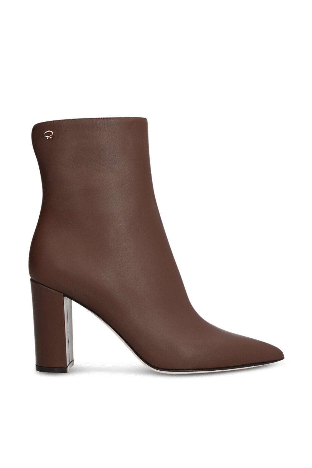 מגפוני עקב מבית Gianvito Rossi, המעוצבים בעבודת יד תוצרת איטליה, עשויים עור בצבע חום בסגירת רוכסן צדדי עם דיטייל קלאסי בחלק העליון של לוגו המותג.