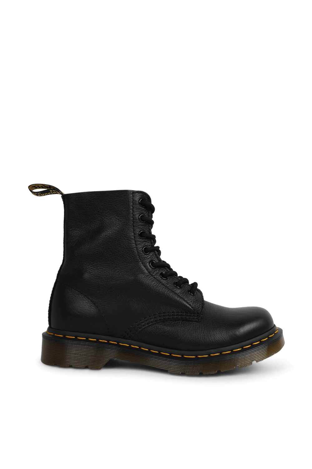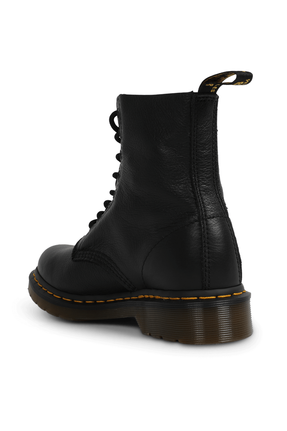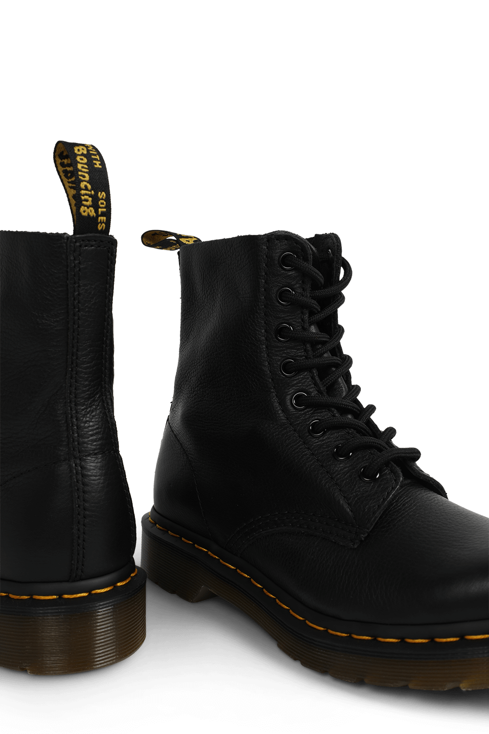 מגפונים מדגם Pascal מבית DR.Martens, עשויים עור בצבע שחור ובגימור מגורען בשילוב סוליה צ'אנקית בעיצוב תיפורים בצבע צהוב ושרוכים בחזית.\n