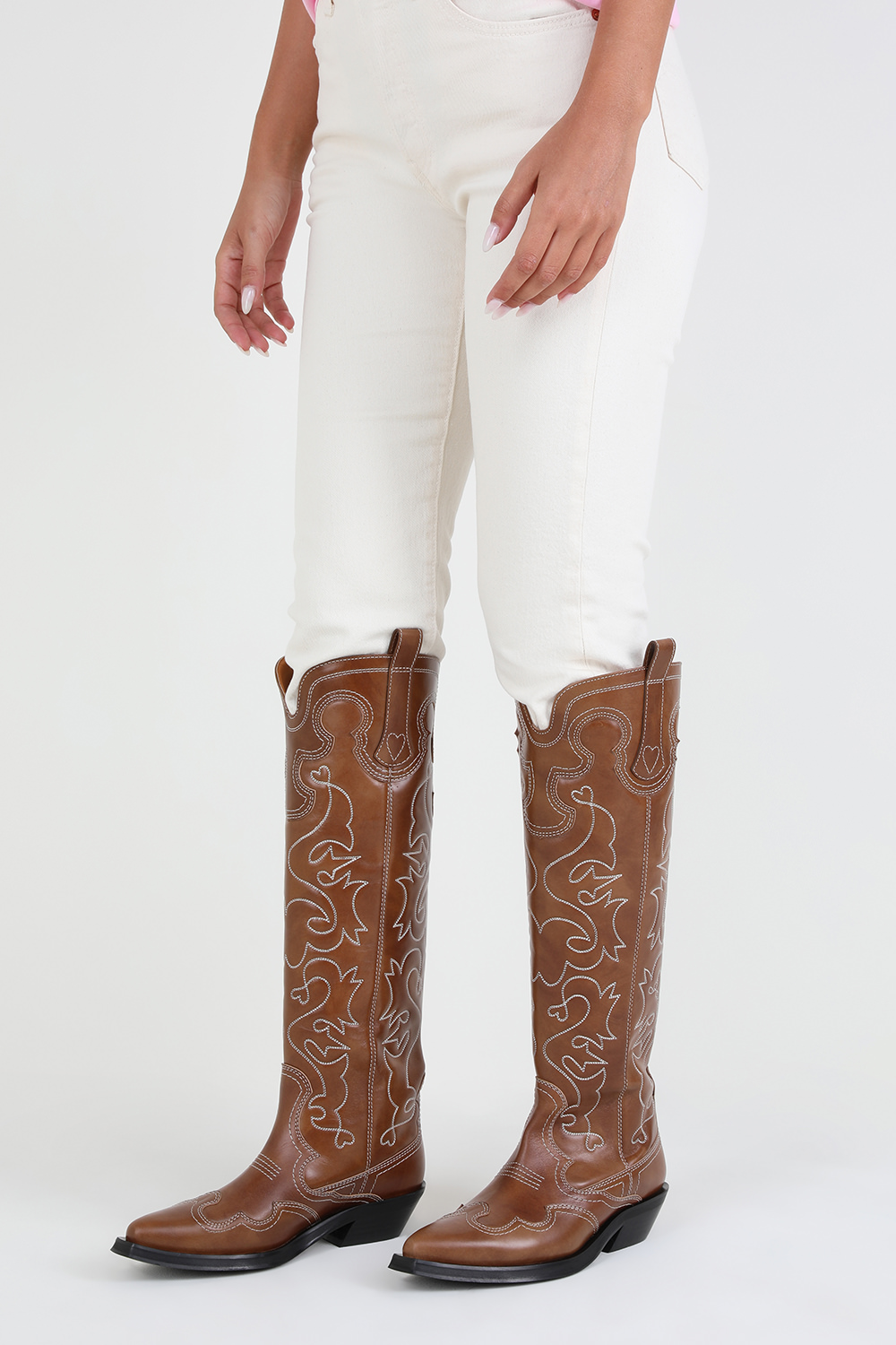 מגפי בוקרים מבית המותג הדני Ganni, הידוע במגפיים האיכותיים שלו, המגיעים ממעוז העיצוב הסקנדינבי. המגפיים עשויים עור איכותי בגוון חום, עם רקמה המשולבת בו ובגובה הברך.