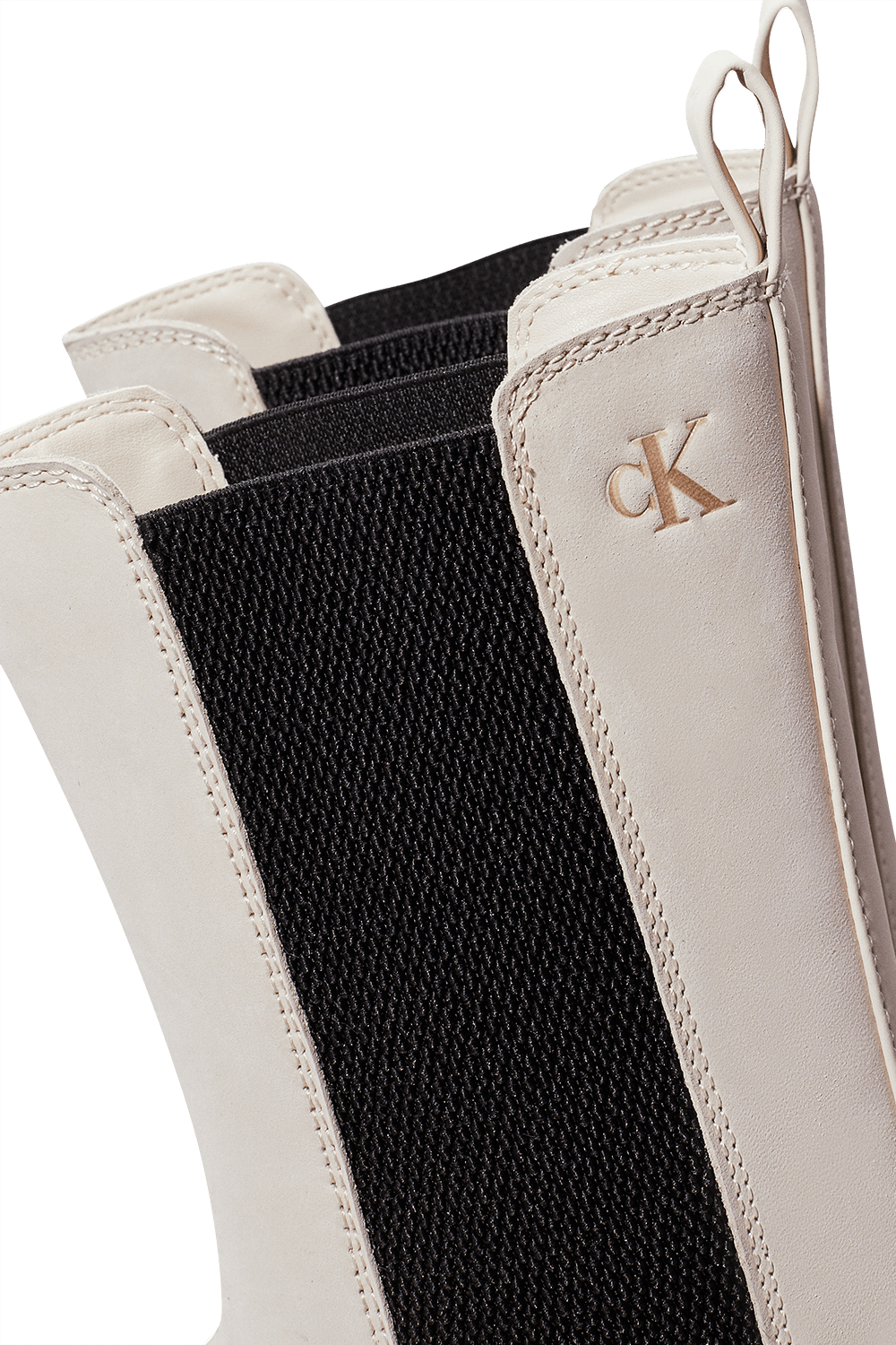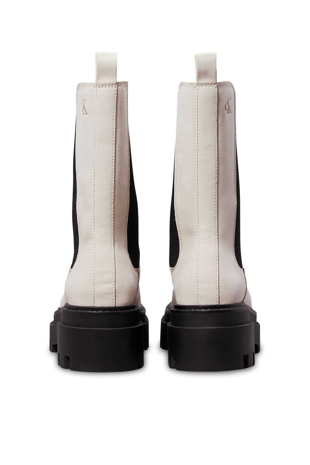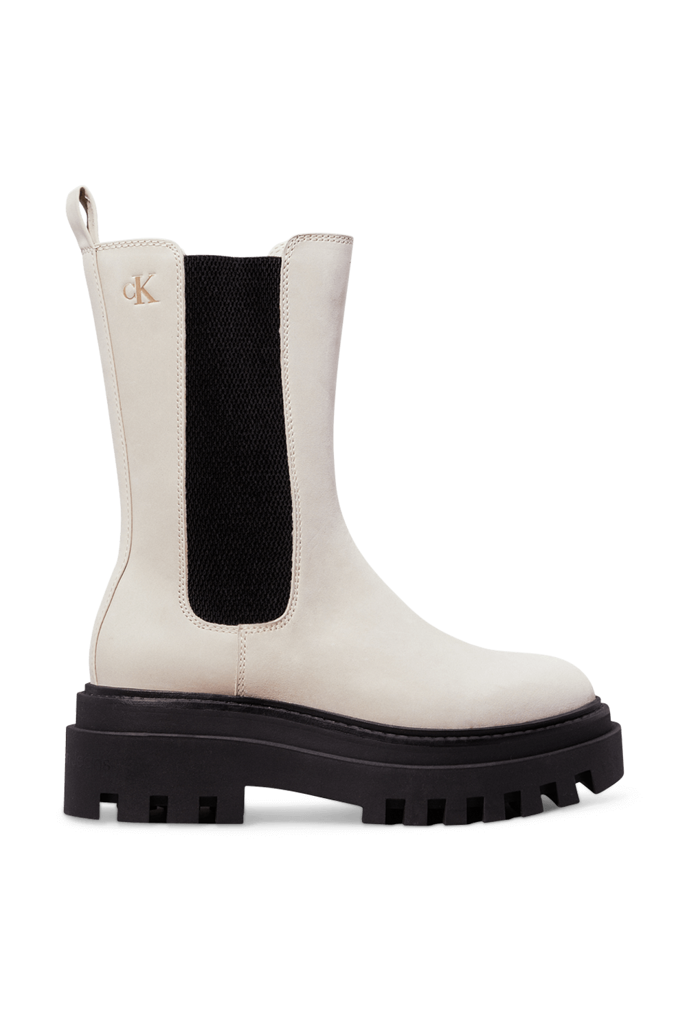 מגפונים מבית Calvin Klein, עשויים זמש בצבע לבן בשילוב עיצוב אלסטי בצדדים עם רקמת לוגו בחלק העליון וסוליה צ'אנקית.