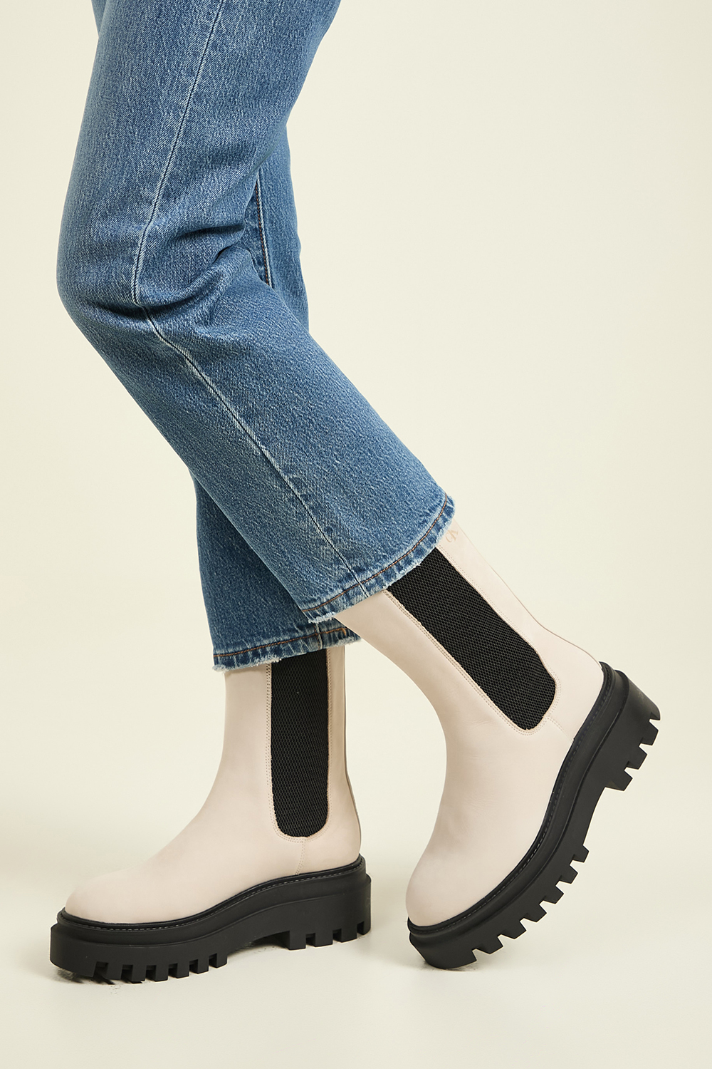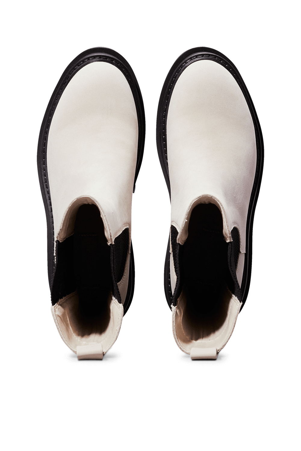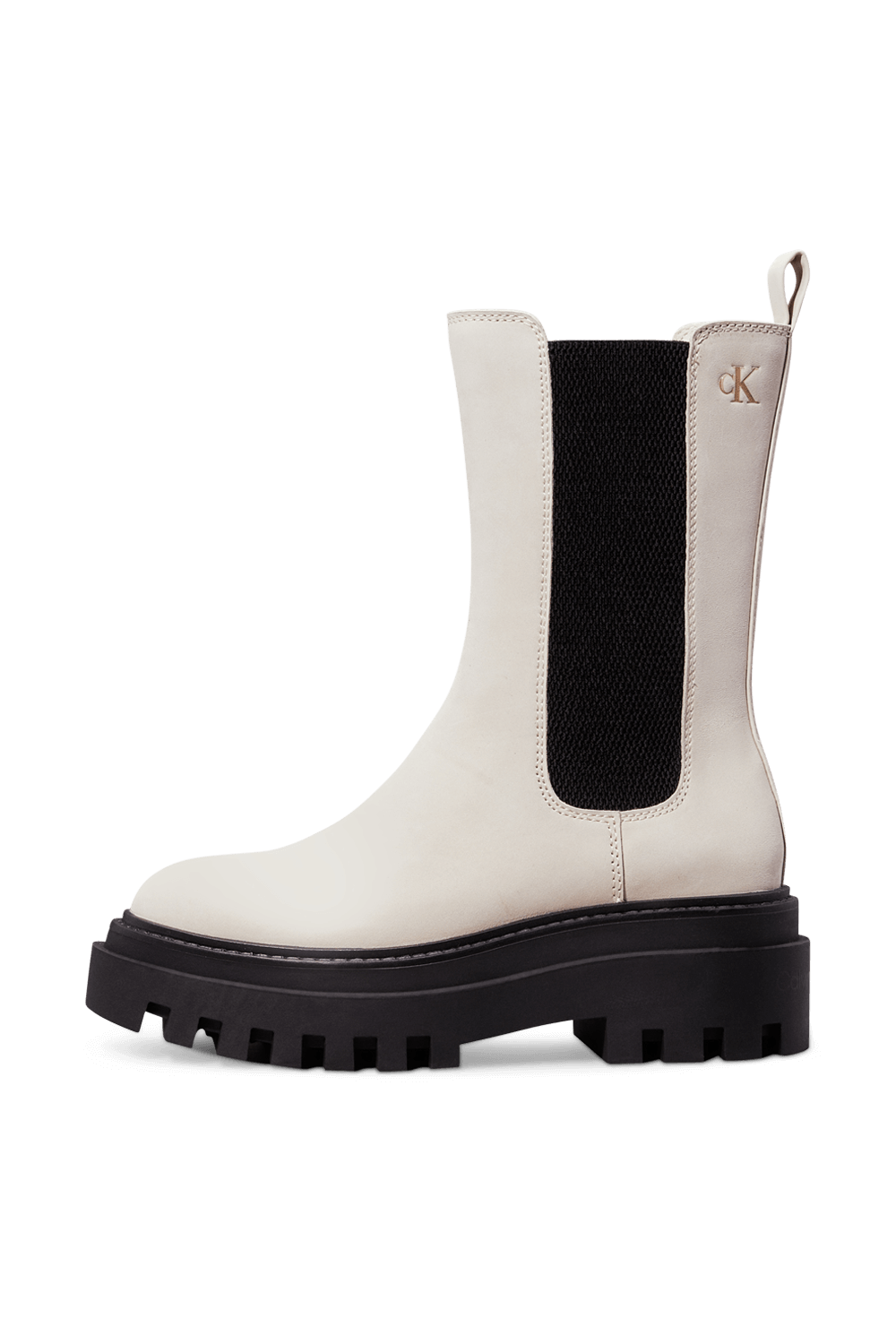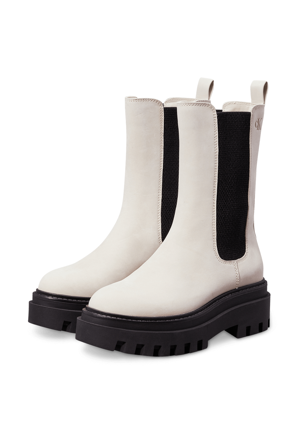 מגפונים מבית Calvin Klein, עשויים זמש בצבע לבן בשילוב עיצוב אלסטי בצדדים עם רקמת לוגו בחלק העליון וסוליה צ'אנקית.