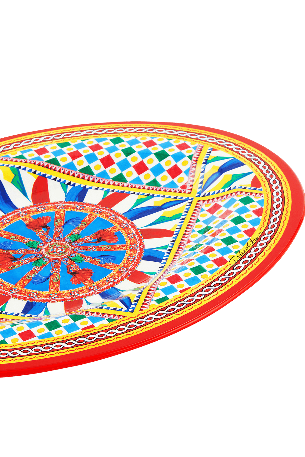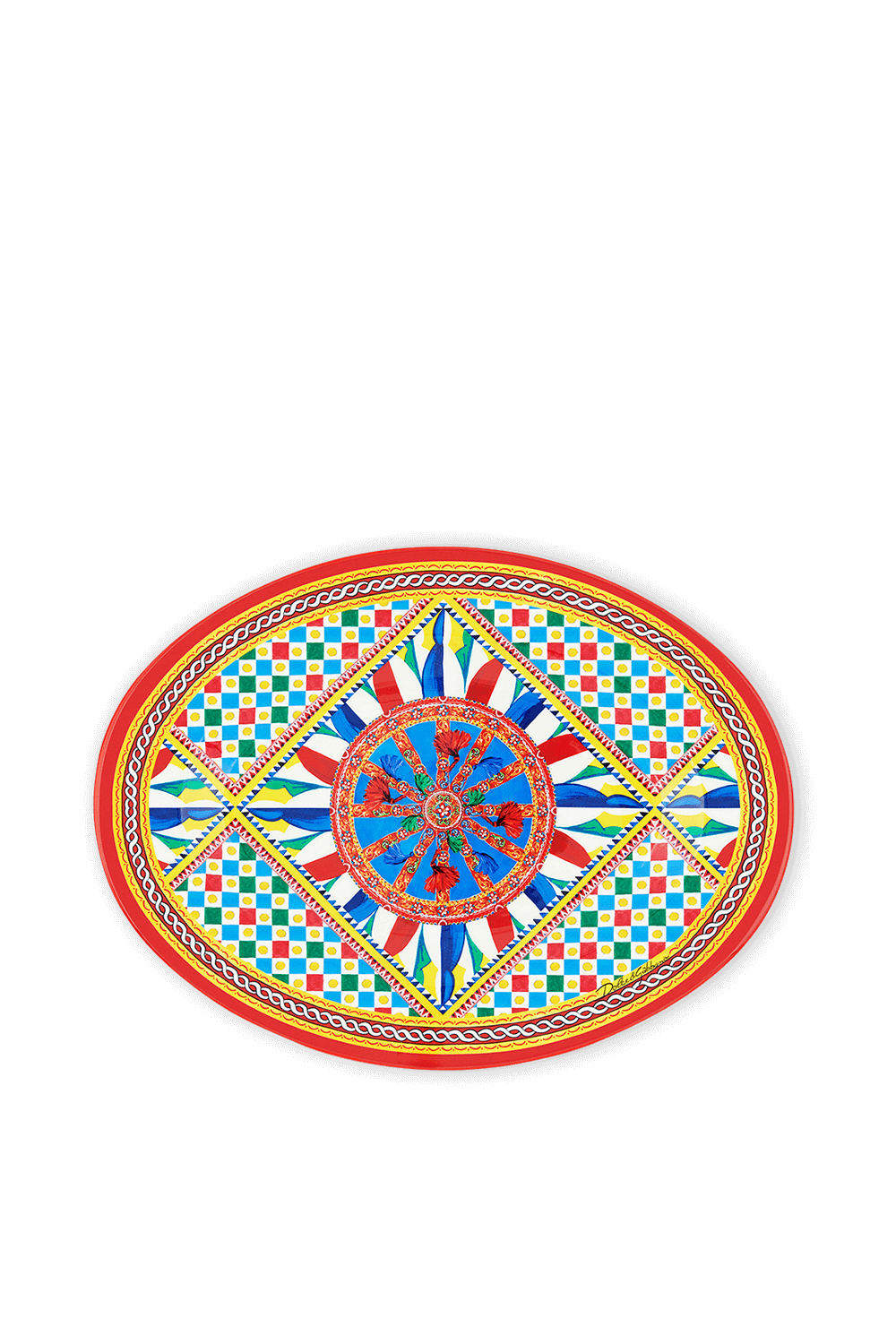 עיצוב של Dolce&Gabbana Casa, בהשראת קולקציית האופנה של המותג האיטלקי, המבוססת על הדוגמאות הצבעוניות ומלאות החיים, המעטרות באופן מסורתי את עגלות הסוסים בסיציליה המכונות Carretto Siciliano. מגש אובלי מעוצב בעבודת יד עשוי מ-100% עץ, בדוגמה צבעונית וגיאומטרית המזוהה עם הקולקציה.