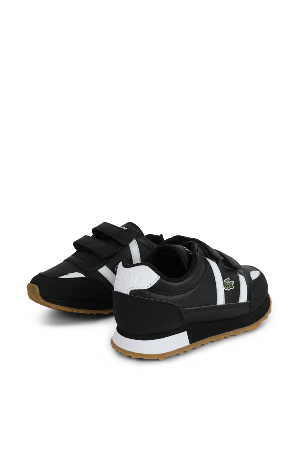 נעלי סניקרס מבית Lacoste. הדגם עשוי פוליאסטר בצבע שחור עם לוגו תנין רקום בצדדי הגפות, עיטורים צבע לבן על הגפה והלשונית האחורית.