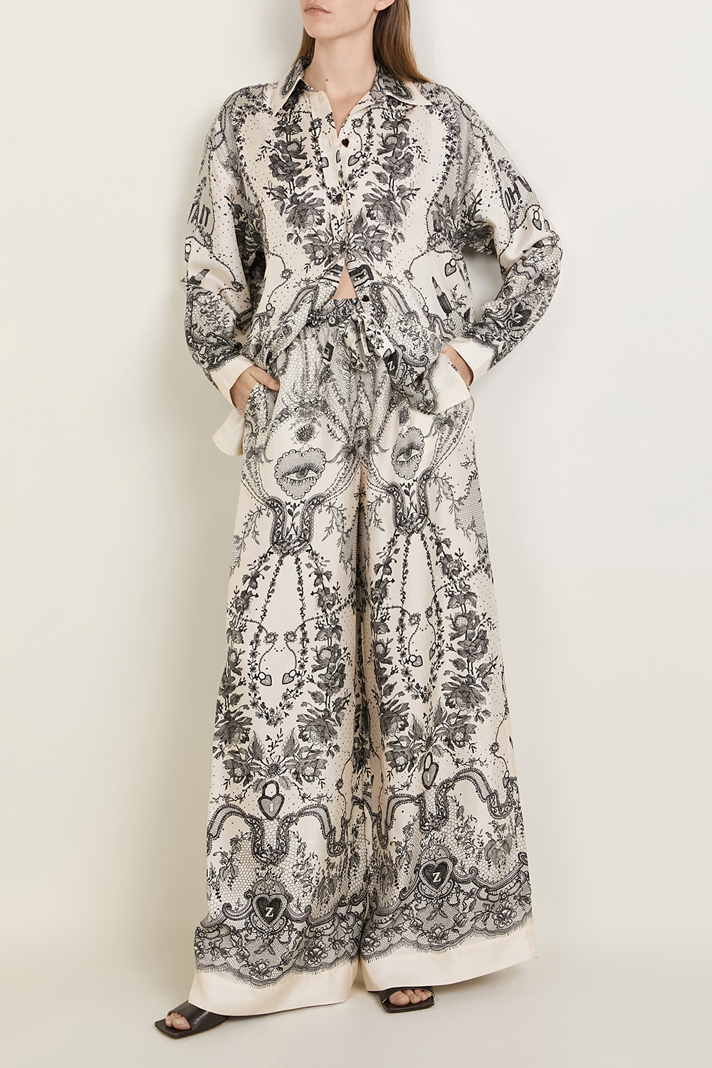 מכנסיים ארוכים בגזרה משוחררת מבית Zimmermann, עשויים משי רך ונעים בצבע שנהב ובהדפס תחרה שחור. יש להם חגורת מותניים אלסטית ונוחה וחגורת קשירה תואמת. ללוק מרתק ונועז - שלבי אותם עם חולצה מכופתרת תואמת מתוך הקולקציה.