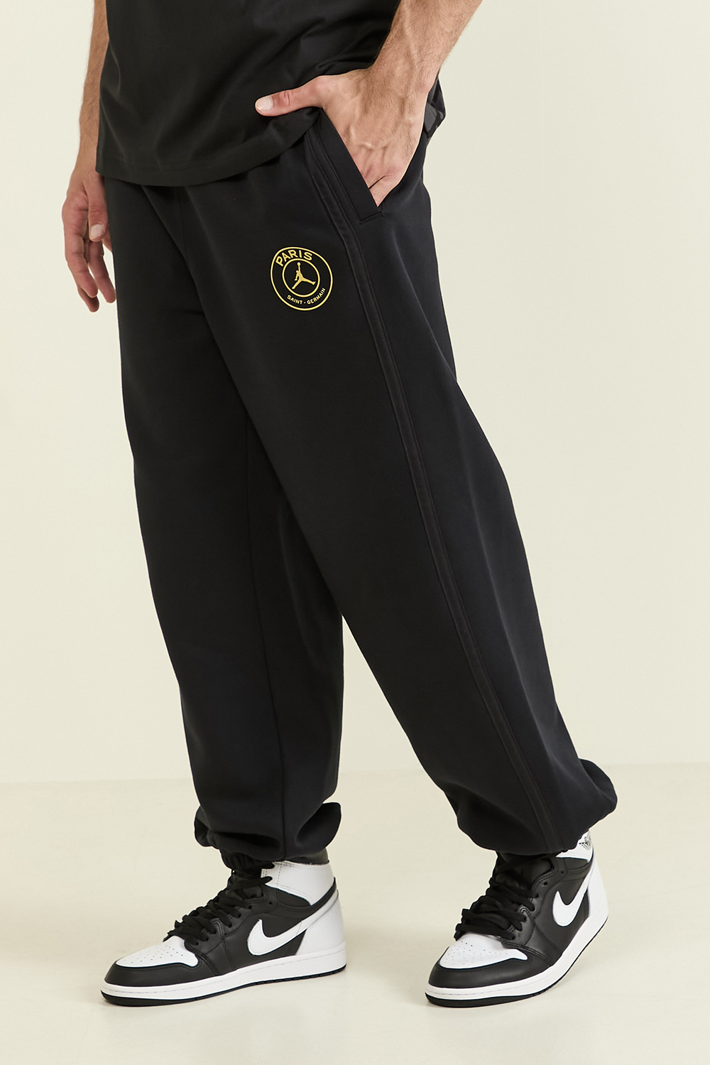 מכנסיים ארוכים מבית Jordan, עשויים כותנה בצבע שחור עם ביטנת פליז מחממת ונעימה והדפס PSG מקדימה ובצד המכנס.